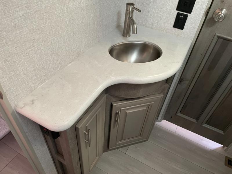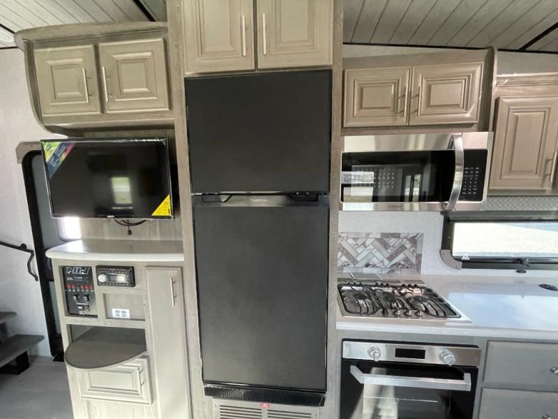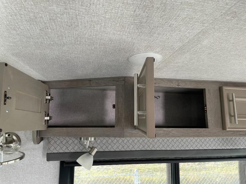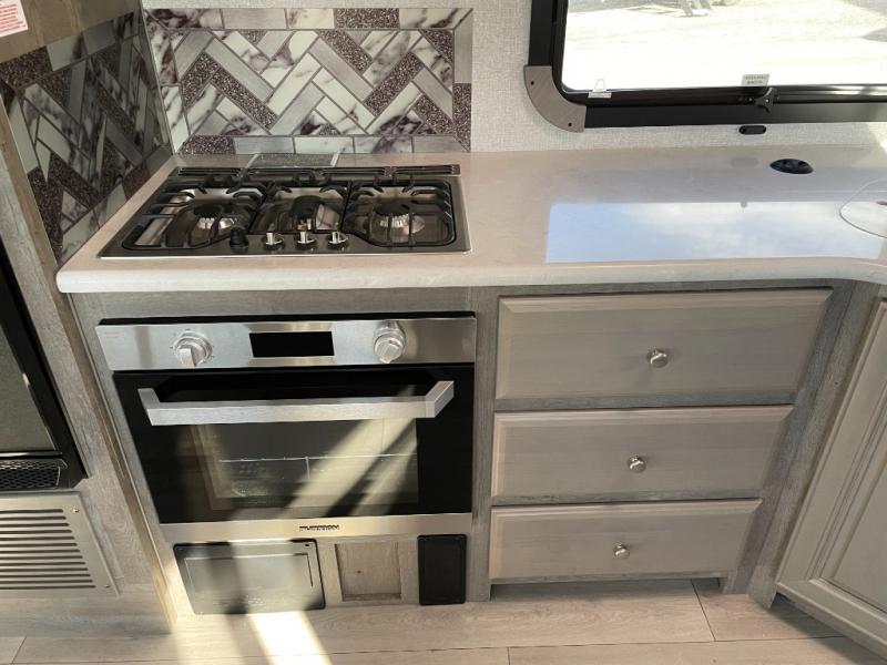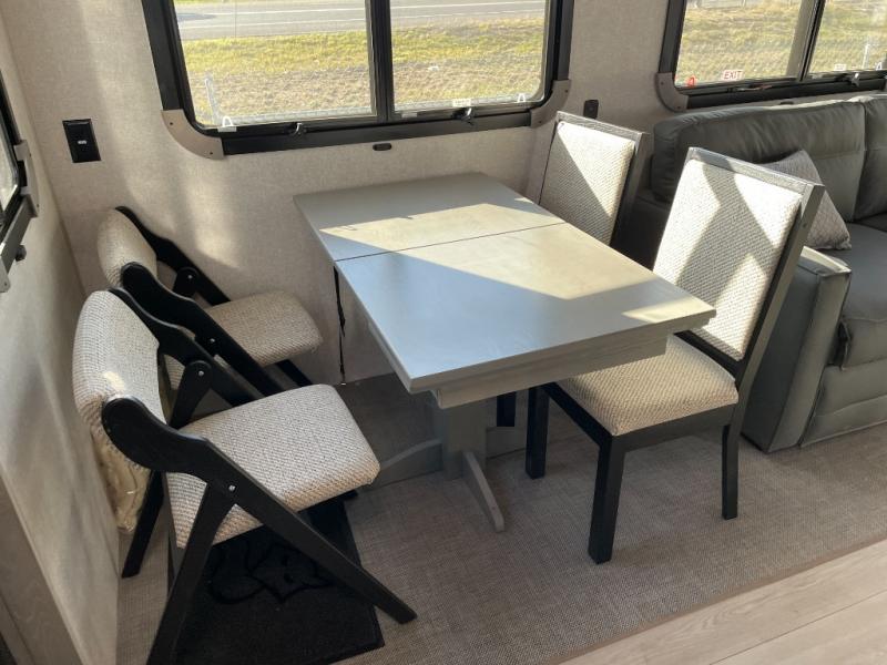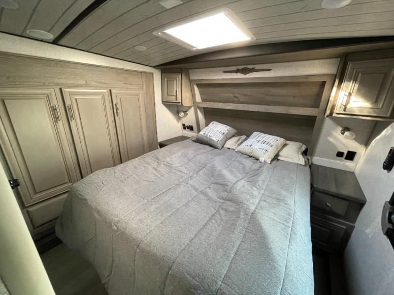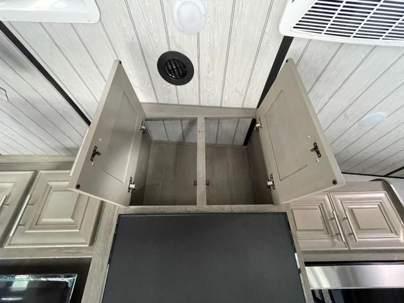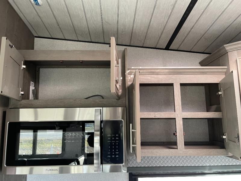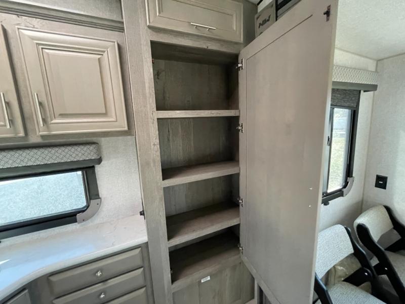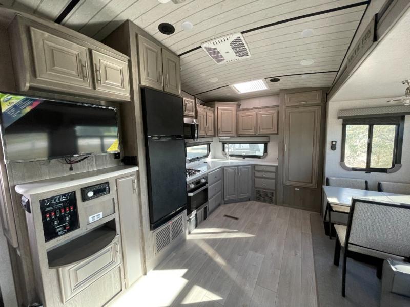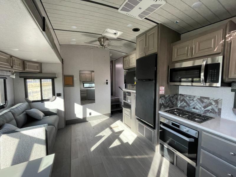 The perfect couples fifth wheel is waiting for you! From the front private bedroom with access to the full bathroom, to the spacious living area with a slide out giving you more interior space to relax and unwind, you will find something to love each time you travel. The rear kitchen offers solid surface countertops with a Furrion cooking suite and you can dine at the free-standing dinette with four chairs. You might choose to replace the furniture with an optional booth Dream dinette, and you can add an optional swivel rocker for more seating. There is a 32" LED Smart TV to watch when you are inside, and you will find two pantries so your snacks and ingredients are organized and ready to grab. And you will find storage throughout the interior for all your things as well as along the exterior.