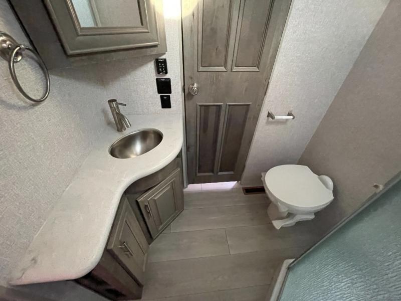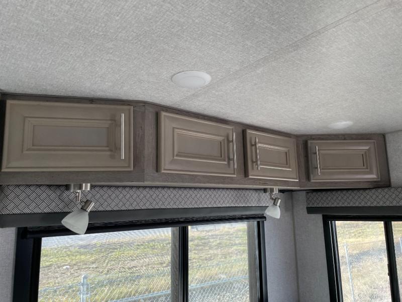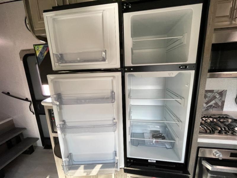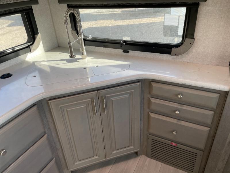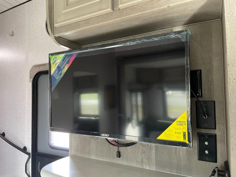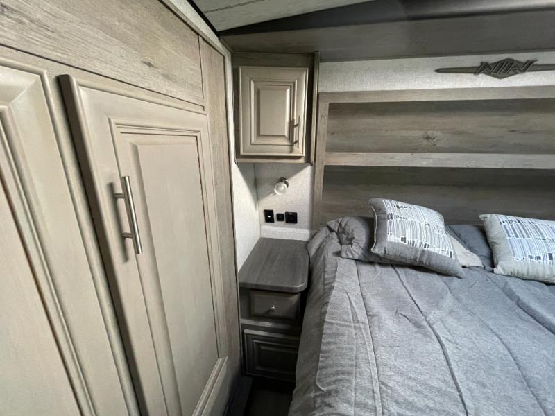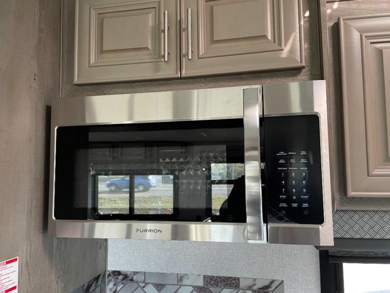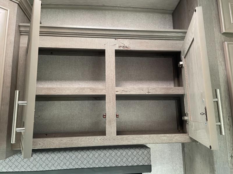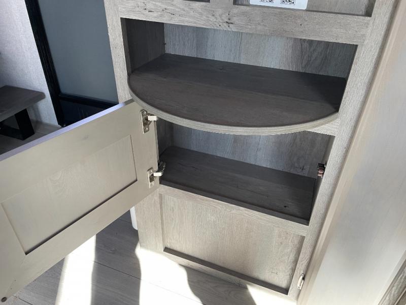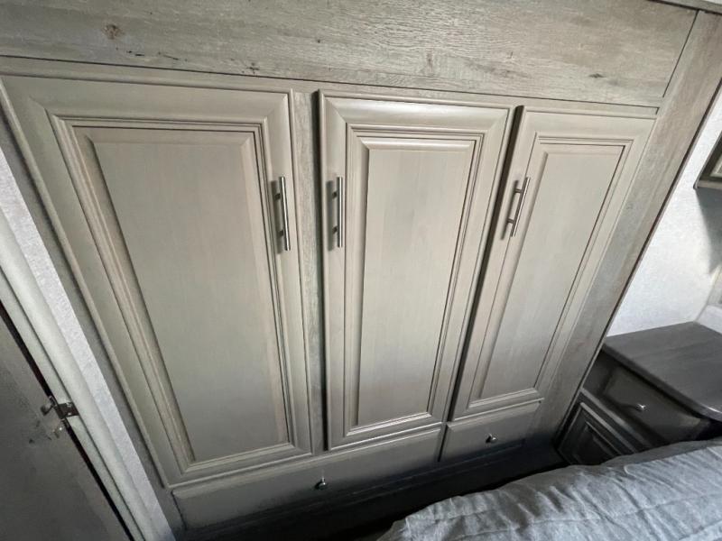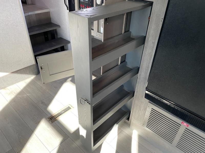 The perfect couples fifth wheel is waiting for you! From the front private bedroom with access to the full bathroom, to the spacious living area with a slide out giving you more interior space to relax and unwind, you will find something to love each time you travel. The rear kitchen offers solid surface countertops with a Furrion cooking suite and you can dine at the free-standing dinette with four chairs. You might choose to replace the furniture with an optional booth Dream dinette, and you can add an optional swivel rocker for more seating. There is a 32" LED Smart TV to watch when you are inside, and you will find two pantries so your snacks and ingredients are organized and ready to grab. And you will find storage throughout the interior for all your things as well as along the exterior.
