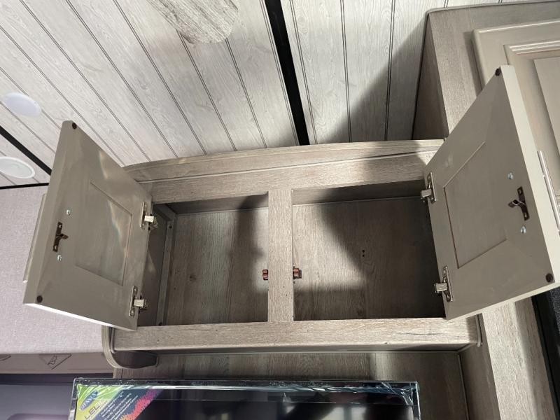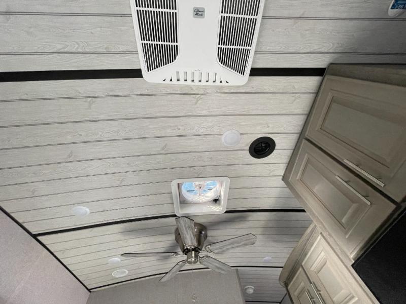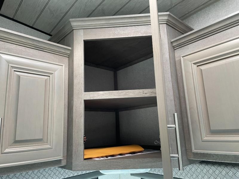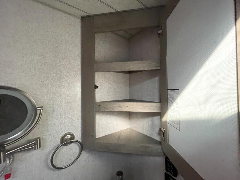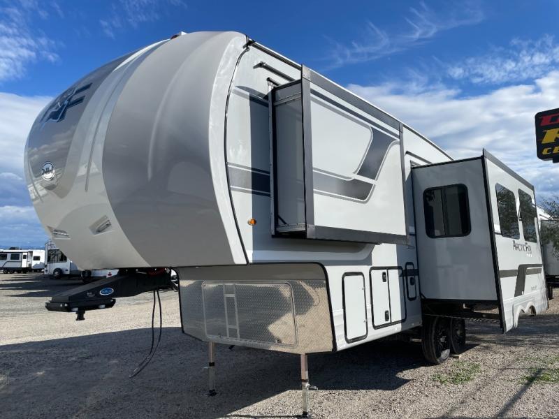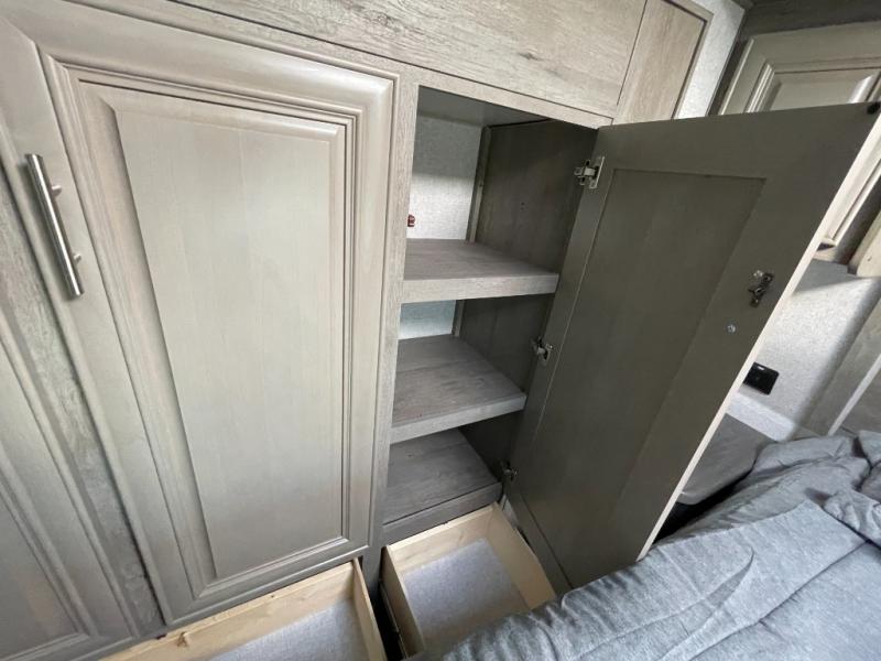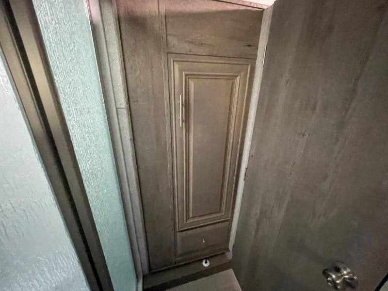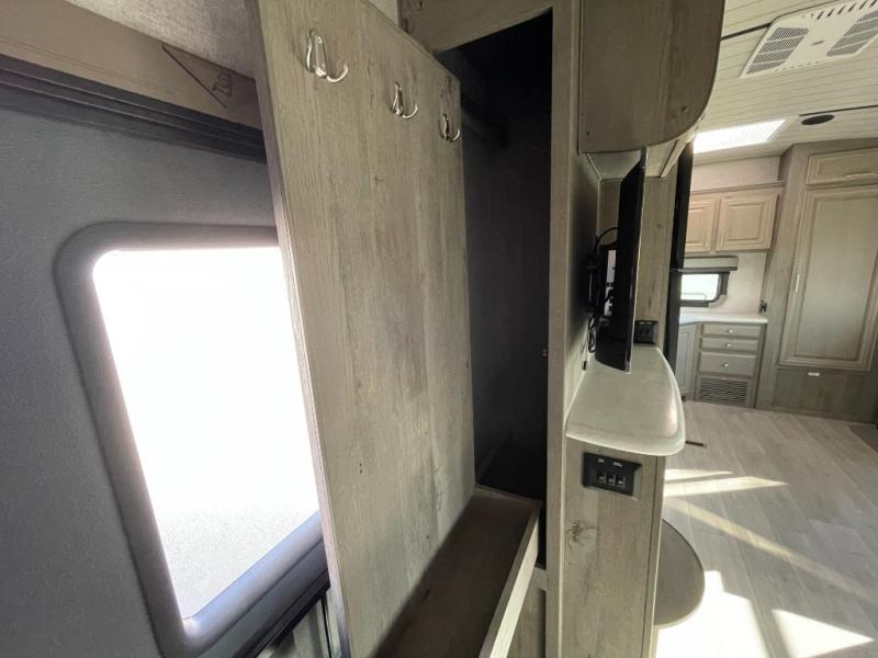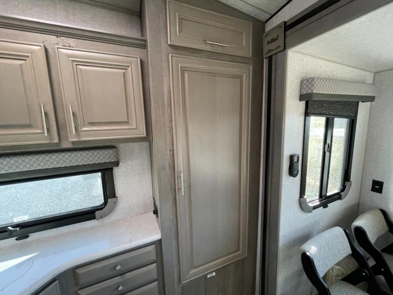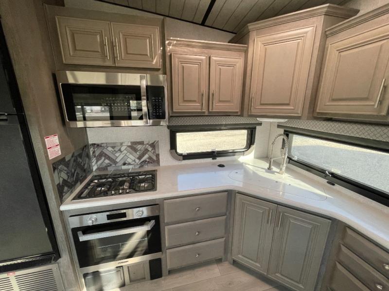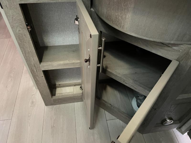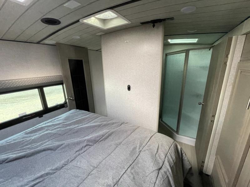 The perfect couples fifth wheel is waiting for you! From the front private bedroom with access to the full bathroom, to the spacious living area with a slide out giving you more interior space to relax and unwind, you will find something to love each time you travel. The rear kitchen offers solid surface countertops with a Furrion cooking suite and you can dine at the free-standing dinette with four chairs. You might choose to replace the furniture with an optional booth Dream dinette, and you can add an optional swivel rocker for more seating. There is a 32" LED Smart TV to watch when you are inside, and you will find two pantries so your snacks and ingredients are organized and ready to grab. And you will find storage throughout the interior for all your things as well as along the exterior.
