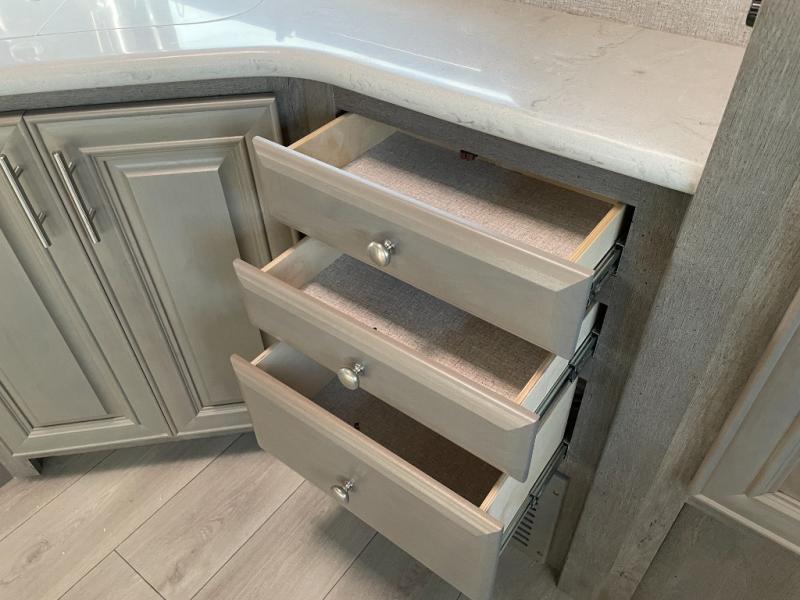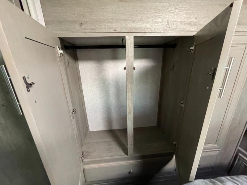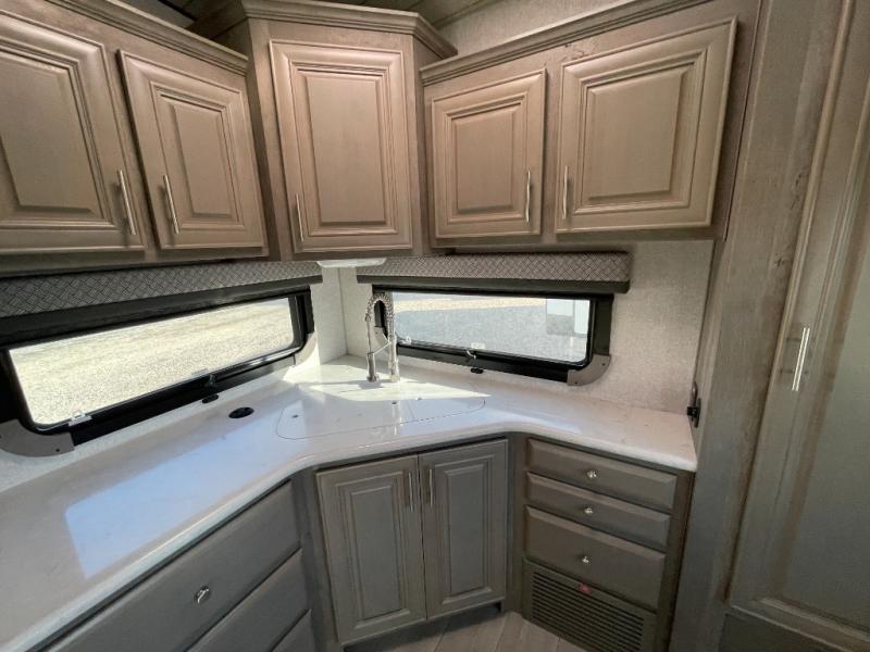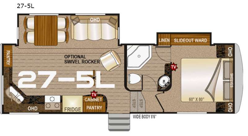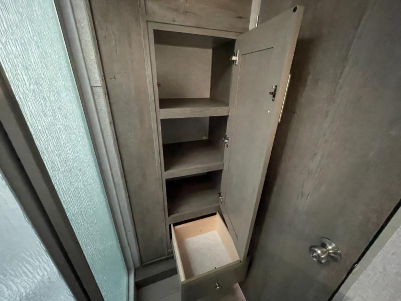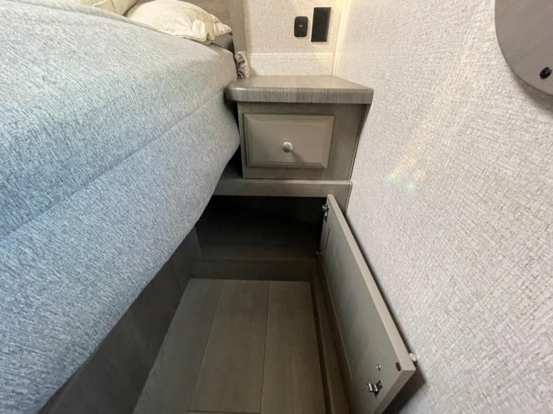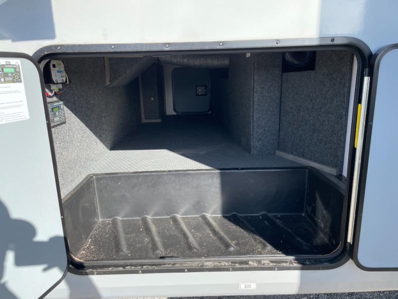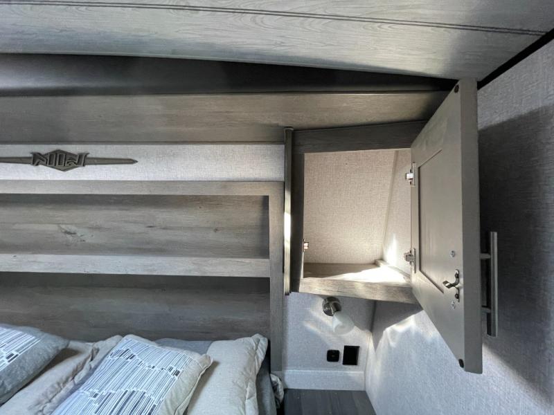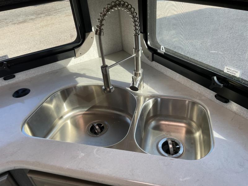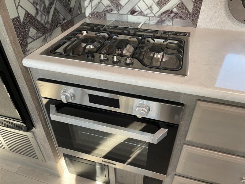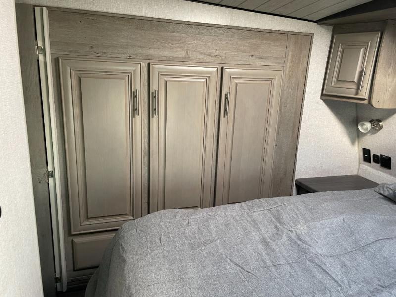 The perfect couples fifth wheel is waiting for you! From the front private bedroom with access to the full bathroom, to the spacious living area with a slide out giving you more interior space to relax and unwind, you will find something to love each time you travel. The rear kitchen offers solid surface countertops with a Furrion cooking suite and you can dine at the free-standing dinette with four chairs. You might choose to replace the furniture with an optional booth Dream dinette, and you can add an optional swivel rocker for more seating. There is a 32" LED Smart TV to watch when you are inside, and you will find two pantries so your snacks and ingredients are organized and ready to grab. And you will find storage throughout the interior for all your things as well as along the exterior.