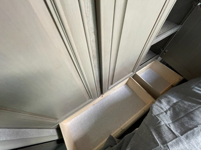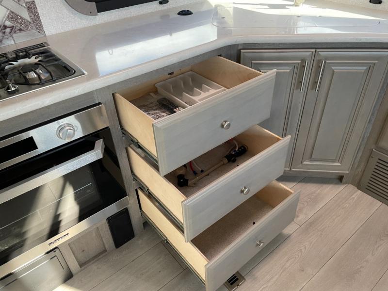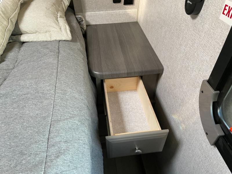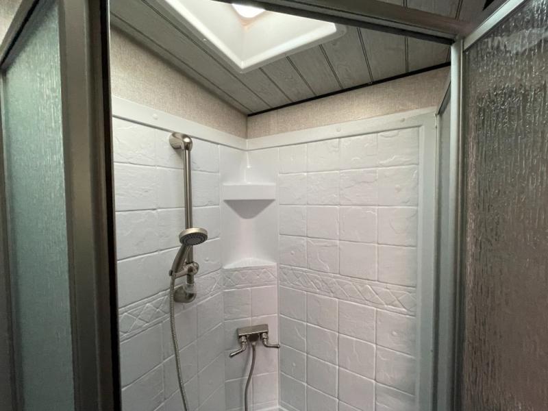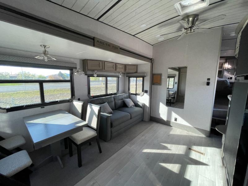 Any Northwood Arctic Fox Grande Ronde fifth wheel is built on a custom built off-road chassis with a wide-body floorplan and offers a true four-season RV with residential fiberglass insulation, reinforced woven highway moisture barrier, heated and insulated holding tanks, and the all-foam condensation resistant A/C ducts. The interior offers cathedral arched ceilings with plenty of headroom for the tallest family member, slow rise night shades for privacy and hidden hinges on cabinet doors for the style you are looking for, a bedroom Starlite with shade, a telescoping lighted vanity mirror and lock box, plus a USB charging port at the dinette and on both sides of the bed.