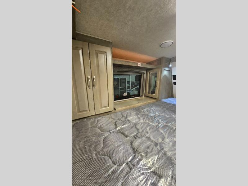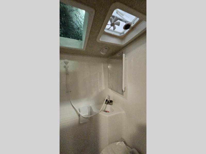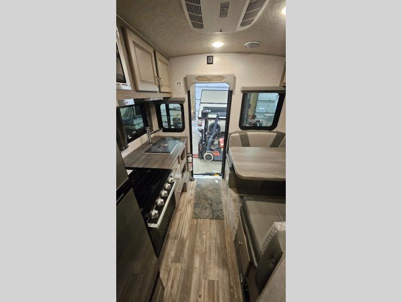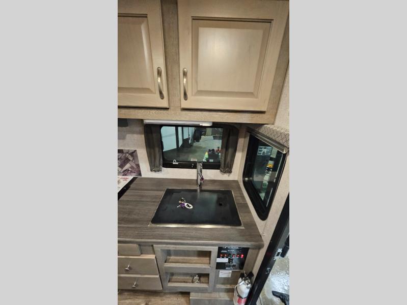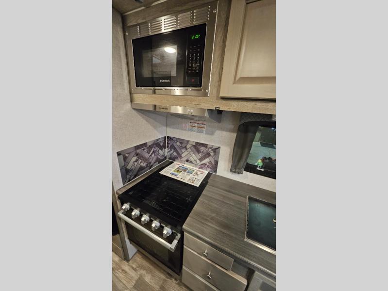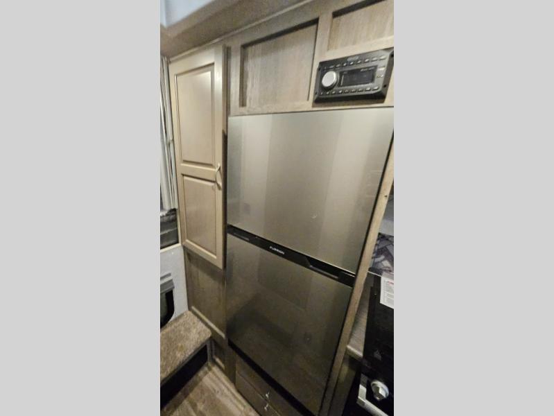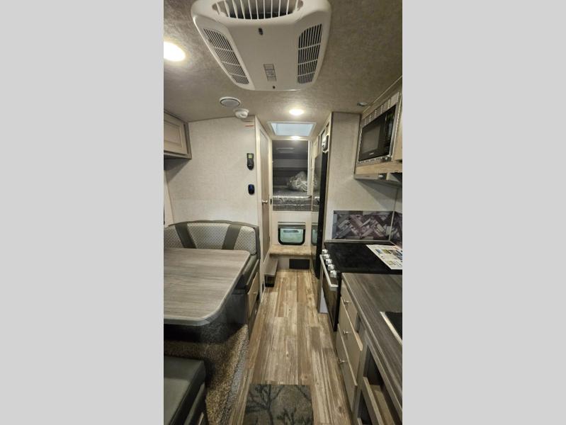 Looking for an easy to setup camper that offers sleeping space for three to four? Once at your destination, there is no slide to worry about, just get dressed and start exploring to return to inside comforts or relax outdoors under the rear electric awning with LED lights before making dinner. The cook will love the three burner cooktop and microwave to make meals, plus an 8 cu. ft. 12V refrigerator for food storage. You can take turns getting cleaned up in the wet bath which is centrally located for convenience. The front NW TruRest queen mattress gives you sleeping for two with plenty of storage for clothing and two hampers for dirty clothes, and the dinette converts to a 38" x 68" sleeping area.