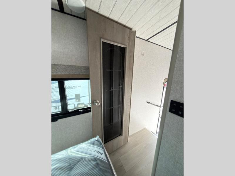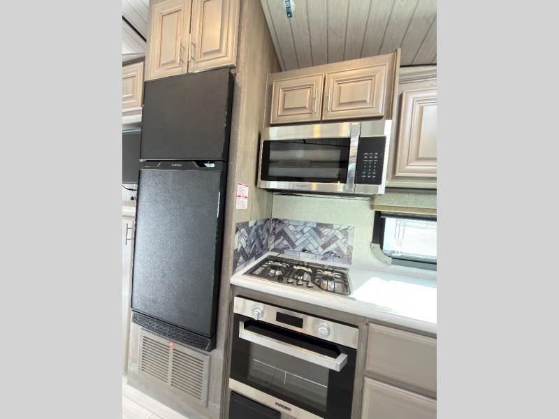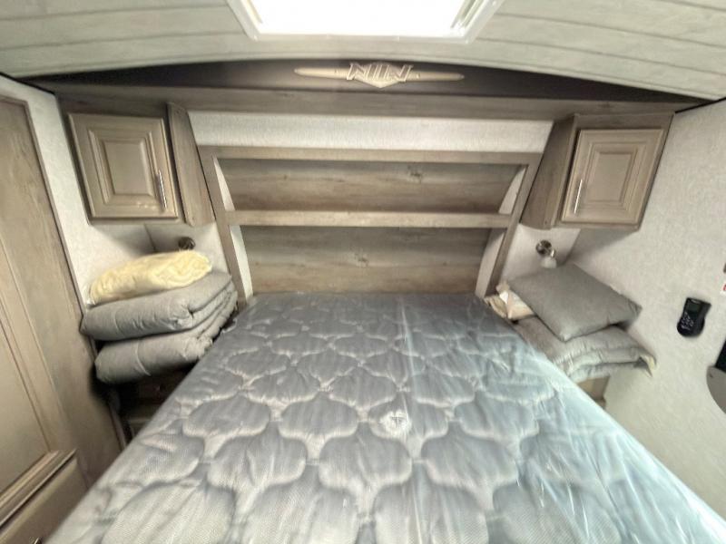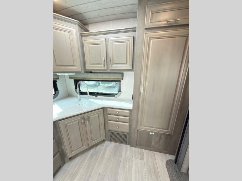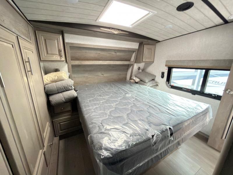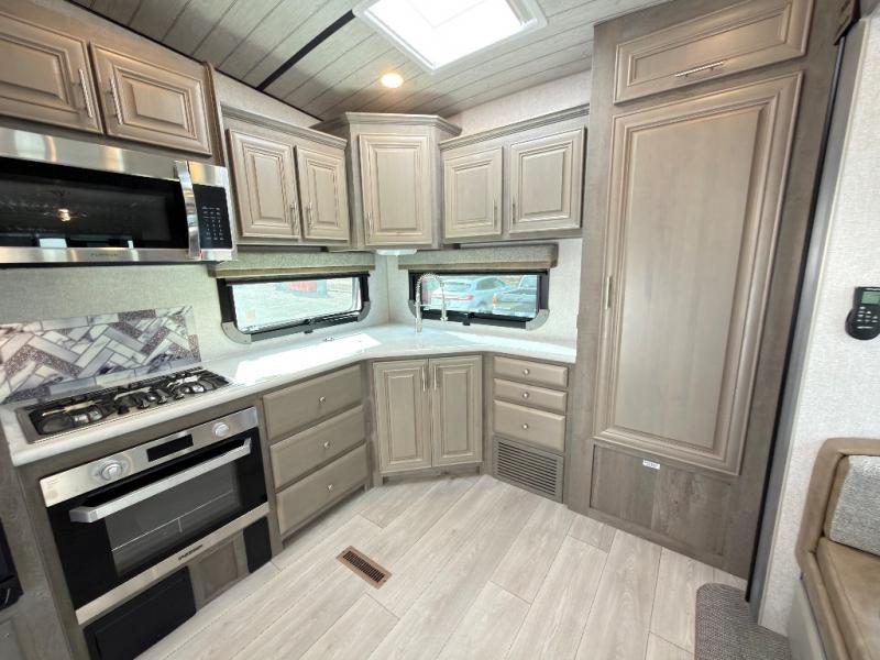 The perfect couples fifth wheel is waiting for you! From the front private bedroom with access to the full bathroom, to the spacious living area with a slide out giving you more interior space to relax and unwind, you will find something to love each time you travel. The rear kitchen offers solid surface countertops and a three burner range, and you can dine at the free-standing dinette with four chairs. You might choose to replace the table and chairs with an optional booth Dream dinette instead. There is a 32" LED Smart TV to watch when you are inside, and you will find two pantries so your snacks and ingredients are organized and ready to grab. And you will find ample storage throughout the interior for all your things as well as along the exterior.