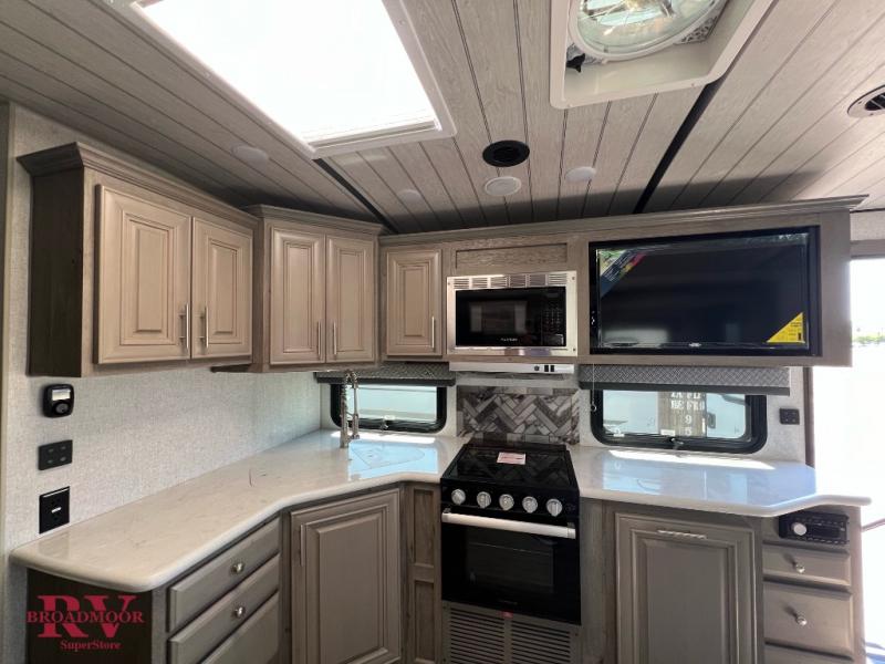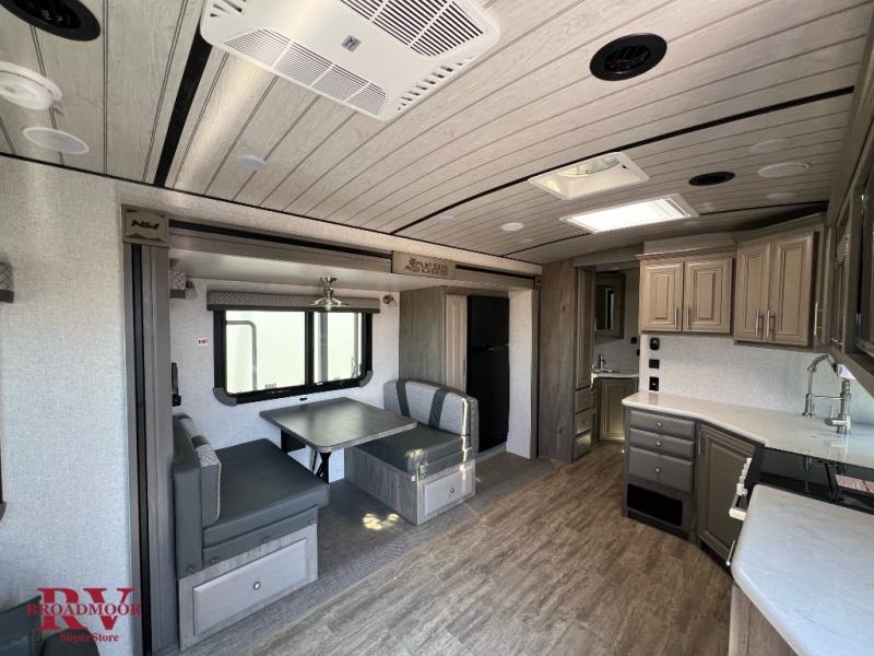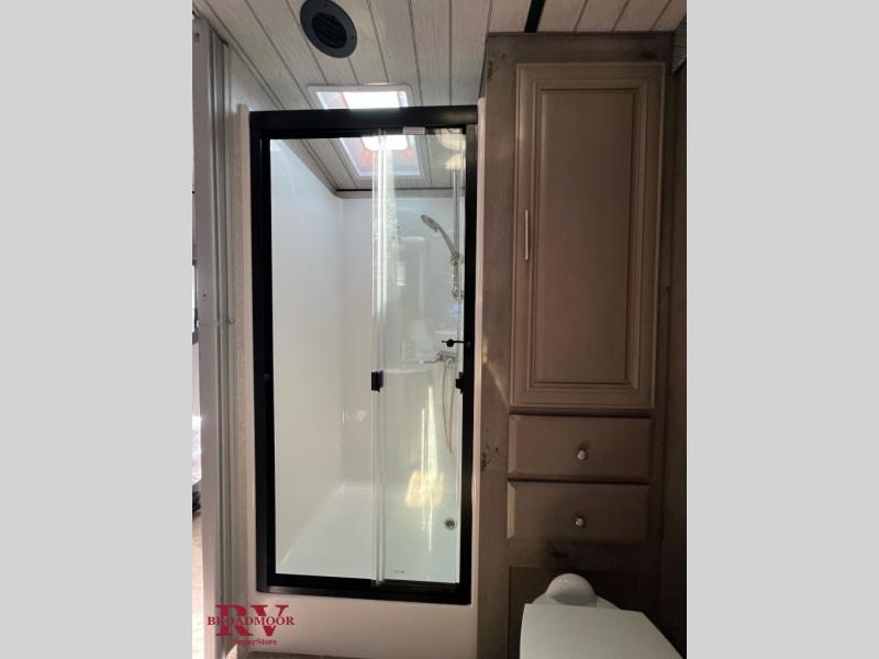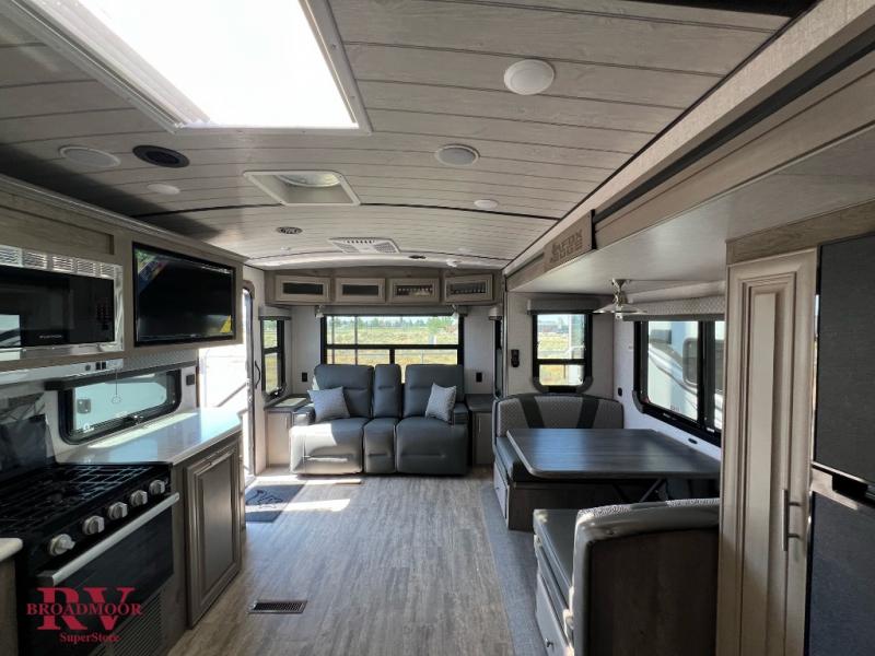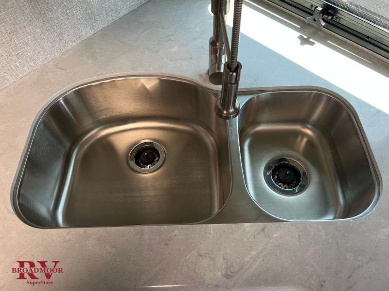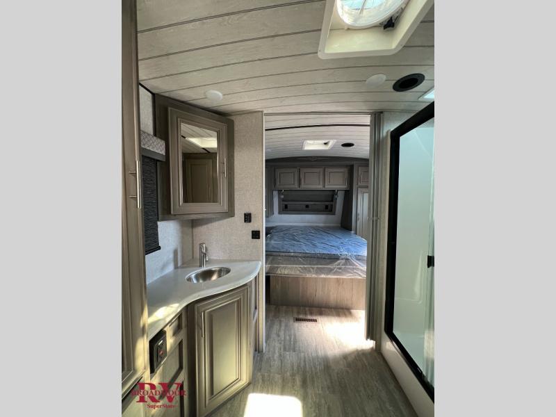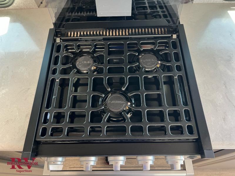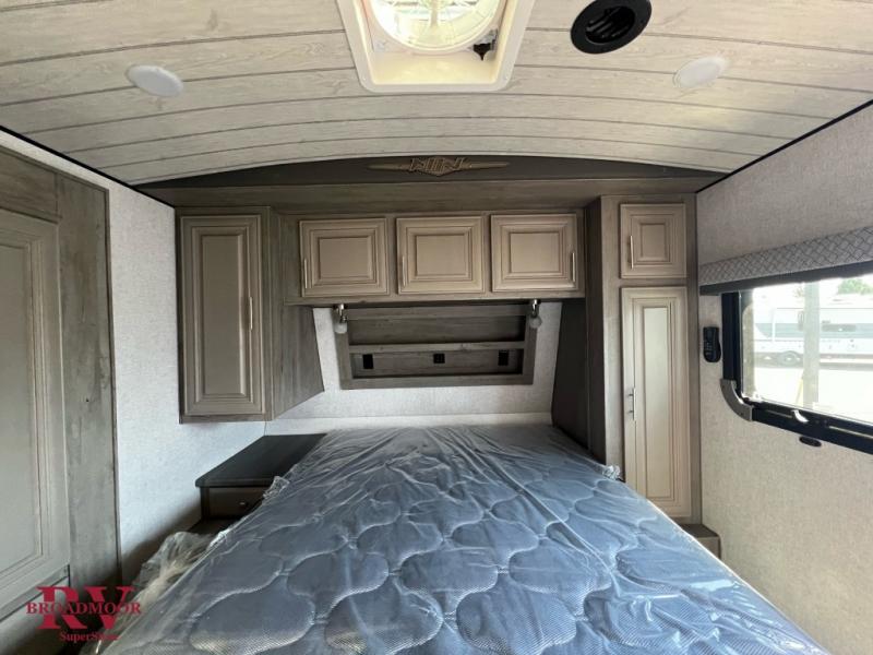 It will be so easy to enjoy camping trips in this spacious travel trailer for three to four. You will have the front master bedroom all to yourselves with one of the dual entry doors, a queen bed, wardrobe slide out, and quick access into the walk-through bath. A booth dinette can serve as dining space and sleeping space since it converts to a 40" x 74" sleeping space for one adult or two little ones. The fully-equipped kitchen includes a three burner range, residential-style microwave with an air fryer, plus a pantry and 10 cu. ft. 12V refrigerator for food storage. After dinner is clean up, you can relax on the rear theater seating and watch a movie on the 32" 12V TV, or head outdoors to relax under the 18' LED awning!