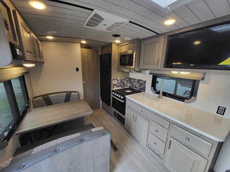 Experience the freedom of adventure with this charming travel trailer! The full rear bathroom provides a private and convenient space for freshening up. The kitchen features a fridge for keeping food and drinks fresh, a booth dinette for dining and additional sleeping space, a three-burner cooktop for culinary creativity, and overhead cabinets for ample storage of cookware and dishes. The cozy front bedroom features dual wardrobe for storing clothing and essentials, as well as an overhead cabinet for additional storage. The exterior awning provides shade and protection from the elements, adding to the overall comfort and livability of the trailer.