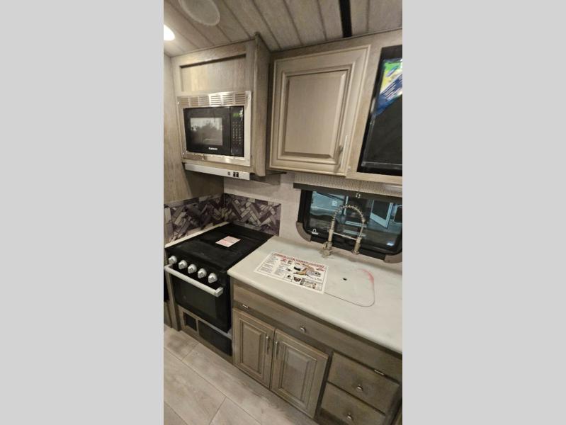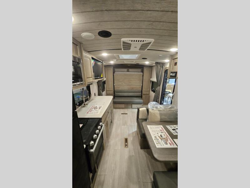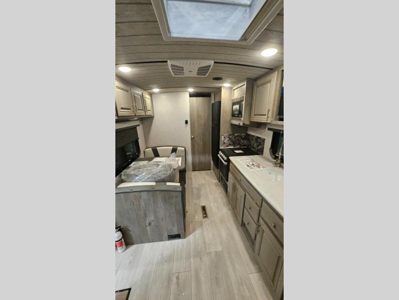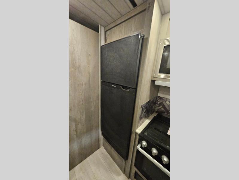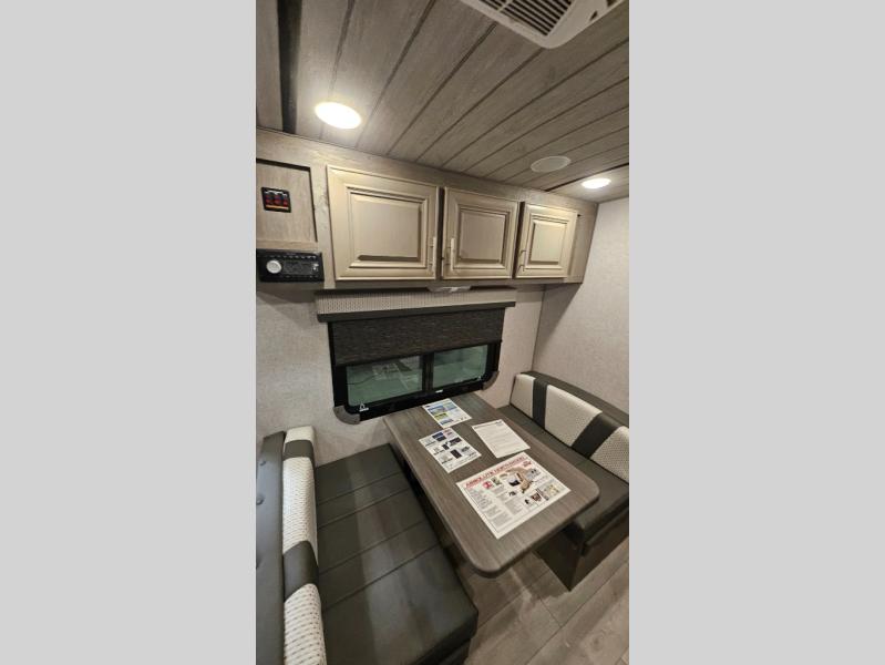 Experience the freedom of adventure with this charming travel trailer! The full rear bathroom provides a private and convenient space for freshening up. The kitchen features a fridge for keeping food and drinks fresh, a booth dinette for dining and additional sleeping space, a three-burner cooktop for culinary creativity, and overhead cabinets for ample storage of cookware and dishes. The cozy front bedroom features dual wardrobe for storing clothing and essentials, as well as an overhead cabinet for additional storage. The exterior awning provides shade and protection from the elements, adding to the overall comfort and livability of the trailer.