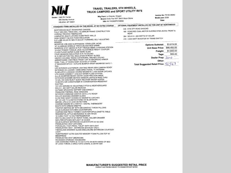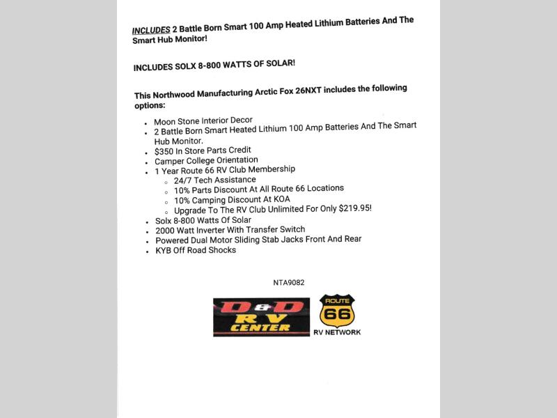 This Northwood Manufacturing Arctic Fox 26NXT includes the following options: