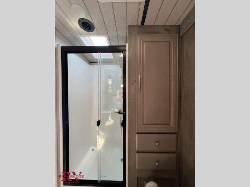This unit has plush theater seating with end tables on each side for ultimate relaxation, a three-burner cooktop, a spacious fridge, and a generously sized pantry for culinary mastery. Moving to the main bedroom, you will find a comfortable queen bed, a TV, and three generously sized wardrobes for restful sleep, relaxation, and better organization. A walk-through bathroom with a linen closet for organized storage can be spotted in the middle of the trailer. Exterior awning for protection from the elements and double entry/exit doors for easy access and added safety.