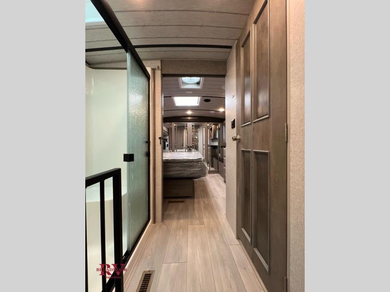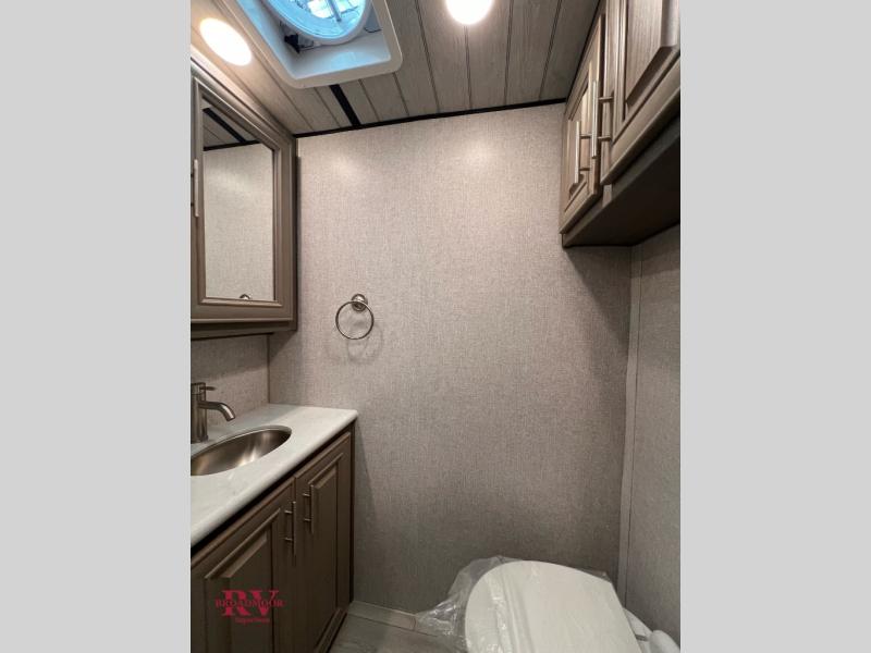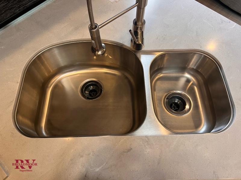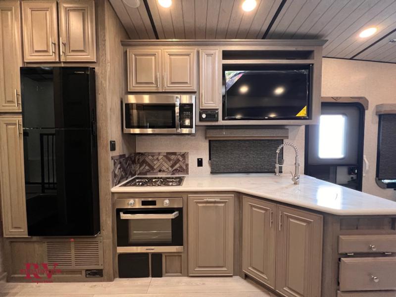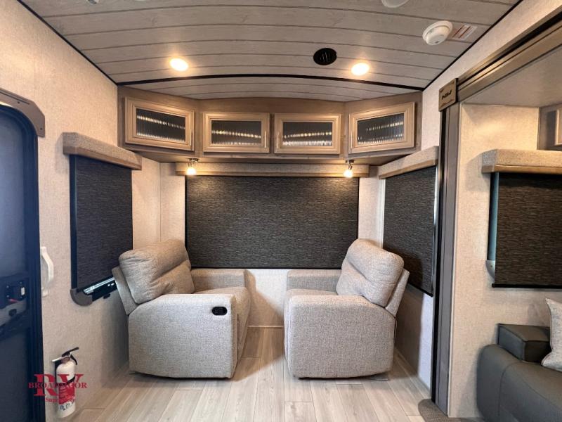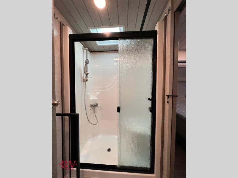 Endless nights of entertainment are given thanks to this fifth wheel rear living area! A tri-fold sofa for comfortable seating and sleeping, two cross-stitch swivel rocker-recliners for ultimate relaxation, a free-standing table with four chairs for dining and socializing, and a TV for entertainment. The kitchen is equipped with a fridge, a two-burner cooktop for culinary art, and two pantries for ample storage of snacks and ingredients. After a long day of exploring nature you will want to relax in the walk-through bathroom, that features a fiberglass shower with seat, providing a comfortable space for freshening up. After, rest in the front bedroom’s spacious king bed and organize your belongings in the convenient dresser and the full-width quad slide wardrobe. You can also enjoy of outside activities without caring about the weather thanks to the exterior awning.