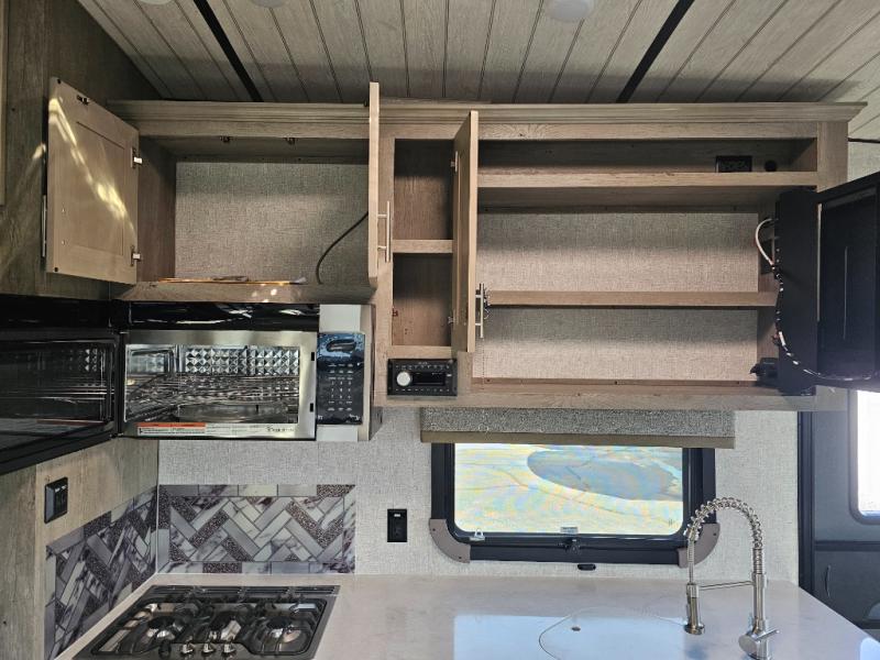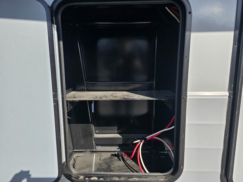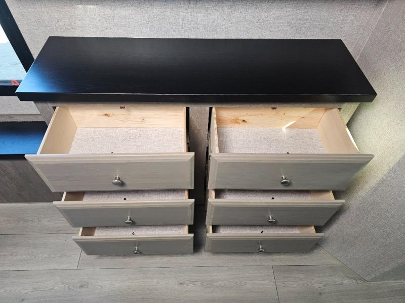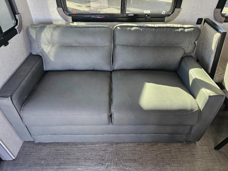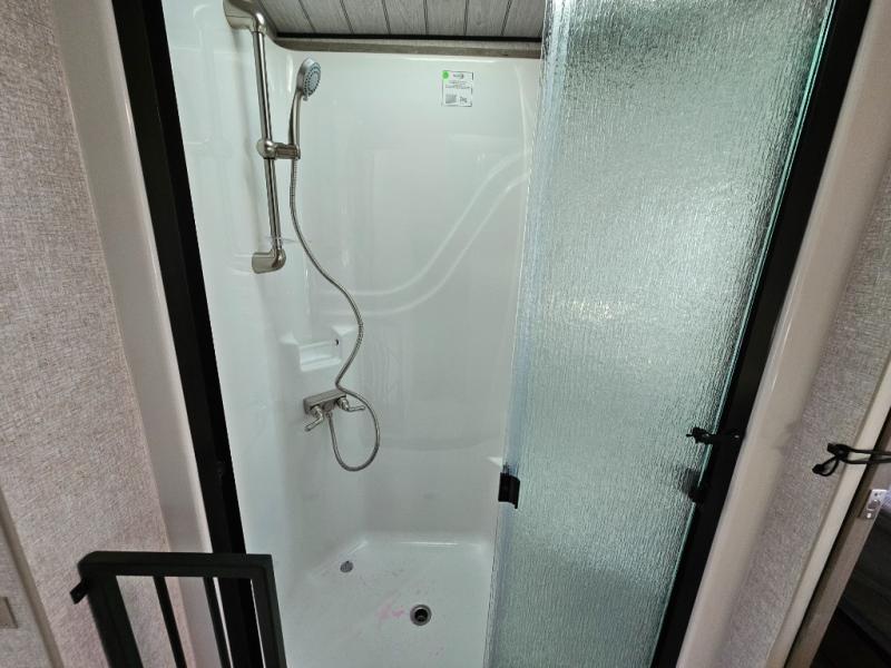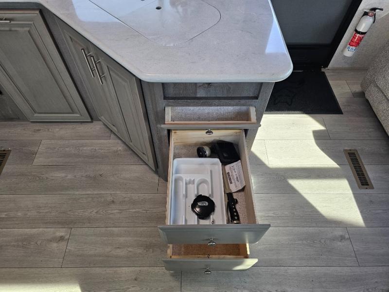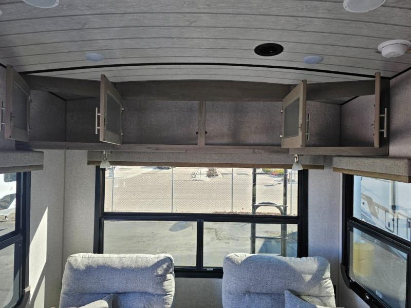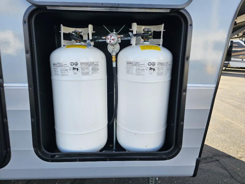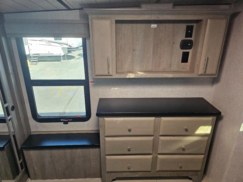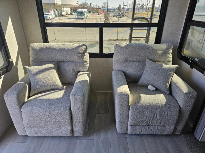 Endless nights of entertainment are given thanks to this fifth wheel rear living area! A tri-fold sofa for comfortable seating and sleeping, two cross-stitch swivel rocker-recliners for ultimate relaxation, a free-standing table with four chairs for dining and socializing, and a TV for entertainment. The kitchen is equipped with a fridge, a two-burner cooktop for culinary art, and two pantries for ample storage of snacks and ingredients. After a long day of exploring nature you will want to relax in the walk-through bathroom, that features a fiberglass shower with seat, providing a comfortable space for freshening up. After, rest in the front bedroom’s spacious king bed and organize your belongings in the convenient dresser and the full-width quad slide wardrobe. You can also enjoy of outside activities without caring about the weather thanks to the exterior awning.