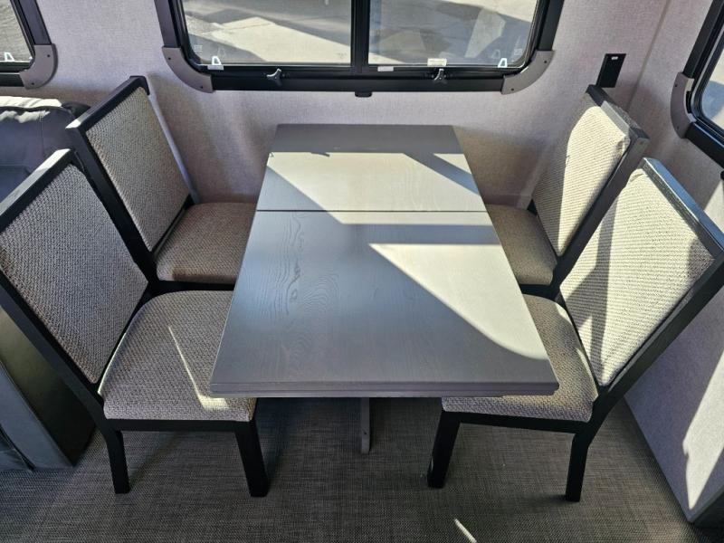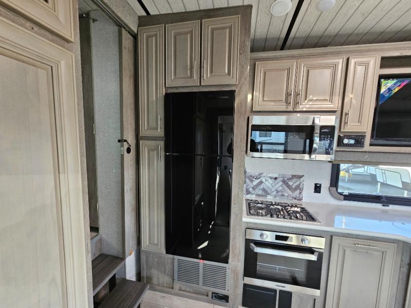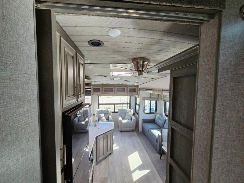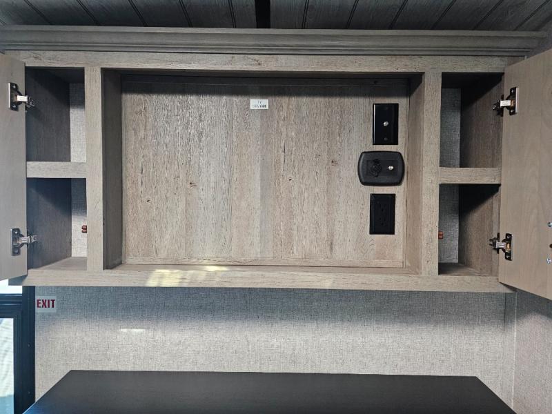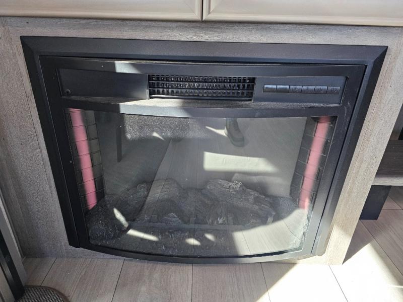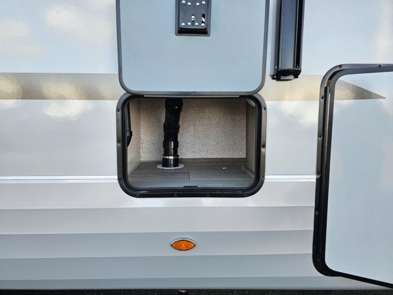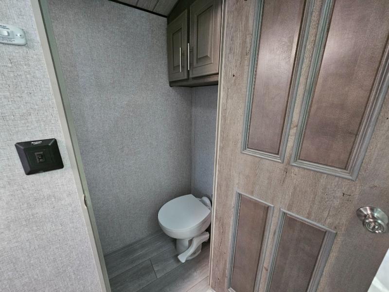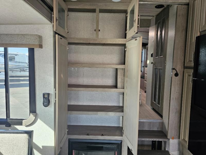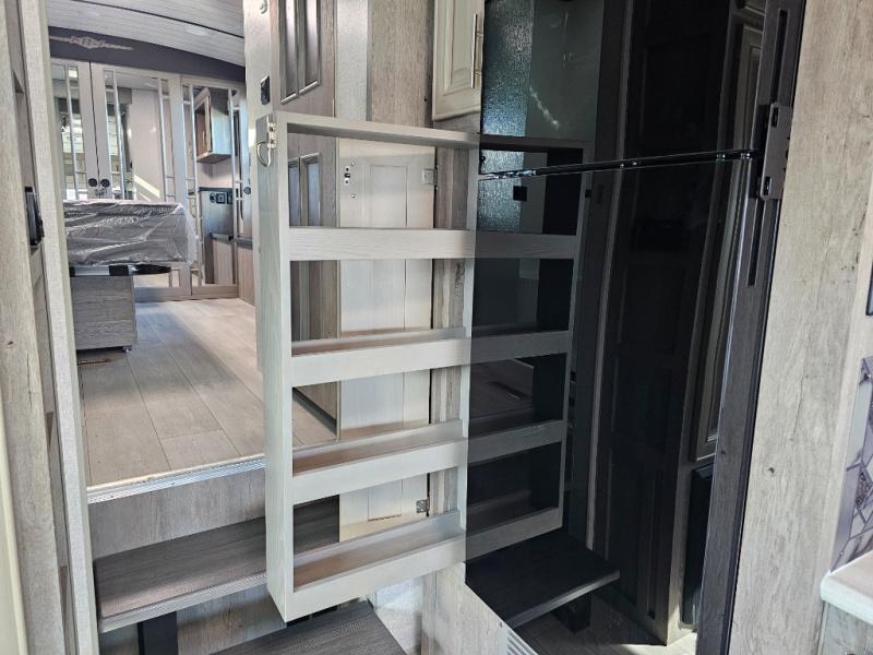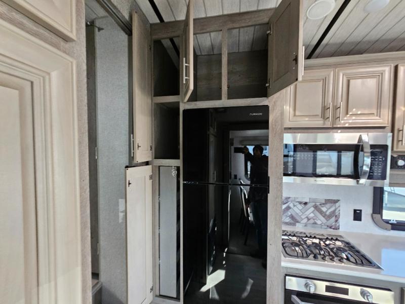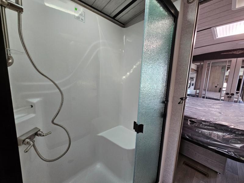 Endless nights of entertainment are given thanks to this fifth wheel rear living area! A tri-fold sofa for comfortable seating and sleeping, two cross-stitch swivel rocker-recliners for ultimate relaxation, a free-standing table with four chairs for dining and socializing, and a TV for entertainment. The kitchen is equipped with a fridge, a two-burner cooktop for culinary art, and two pantries for ample storage of snacks and ingredients. After a long day of exploring nature you will want to relax in the walk-through bathroom, that features a fiberglass shower with seat, providing a comfortable space for freshening up. After, rest in the front bedroom’s spacious king bed and organize your belongings in the convenient dresser and the full-width quad slide wardrobe. You can also enjoy of outside activities without caring about the weather thanks to the exterior awning.