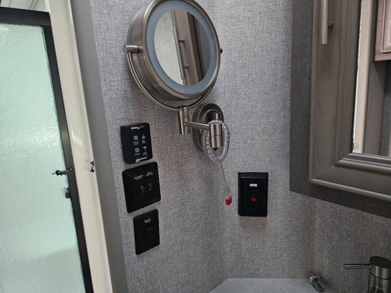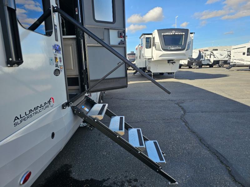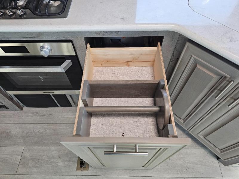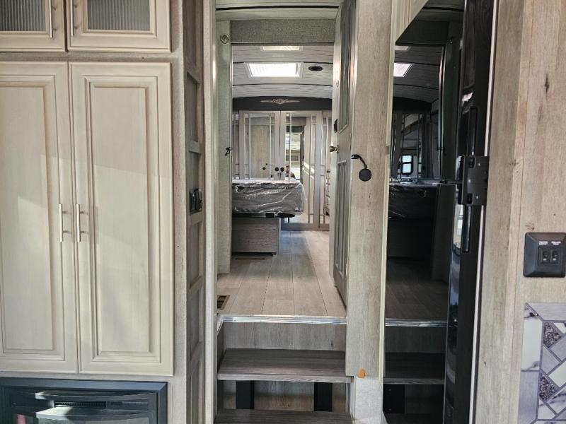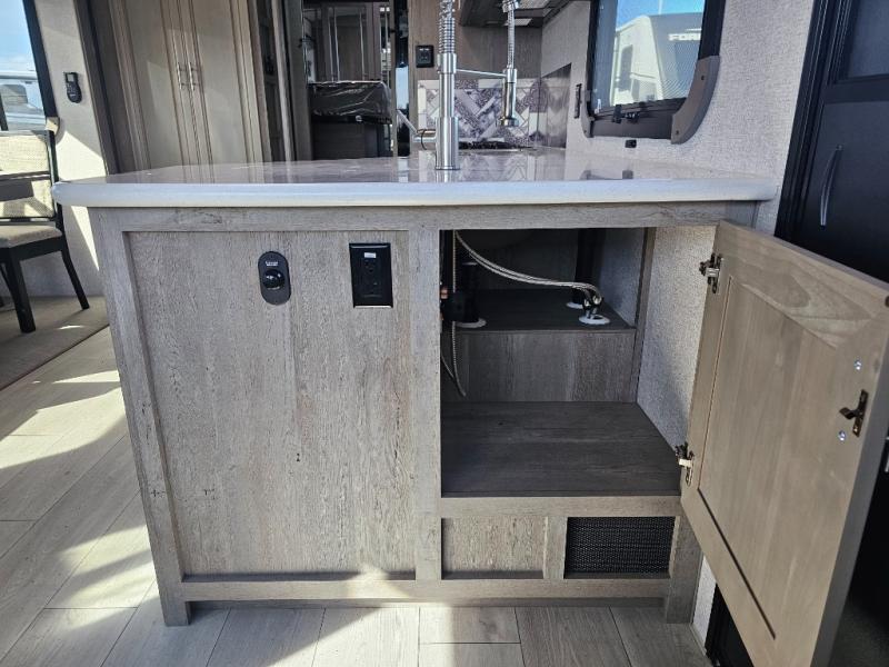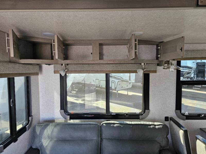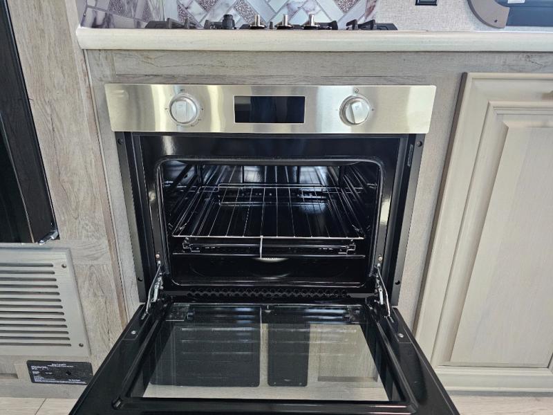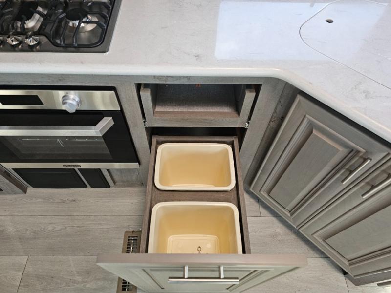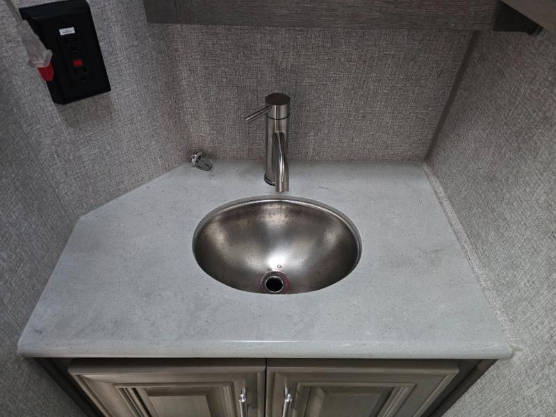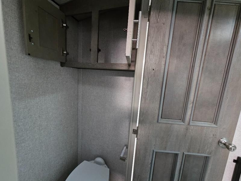 Endless nights of entertainment are given thanks to this fifth wheel rear living area! A tri-fold sofa for comfortable seating and sleeping, two cross-stitch swivel rocker-recliners for ultimate relaxation, a free-standing table with four chairs for dining and socializing, and a TV for entertainment. The kitchen is equipped with a fridge, a two-burner cooktop for culinary art, and two pantries for ample storage of snacks and ingredients. After a long day of exploring nature you will want to relax in the walk-through bathroom, that features a fiberglass shower with seat, providing a comfortable space for freshening up. After, rest in the front bedroom’s spacious king bed and organize your belongings in the convenient dresser and the full-width quad slide wardrobe. You can also enjoy of outside activities without caring about the weather thanks to the exterior awning.