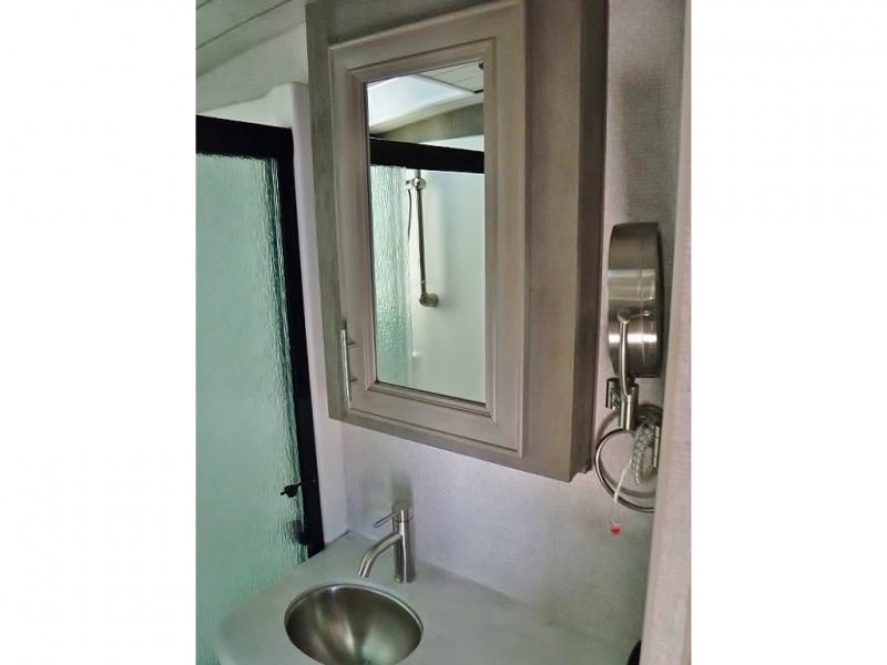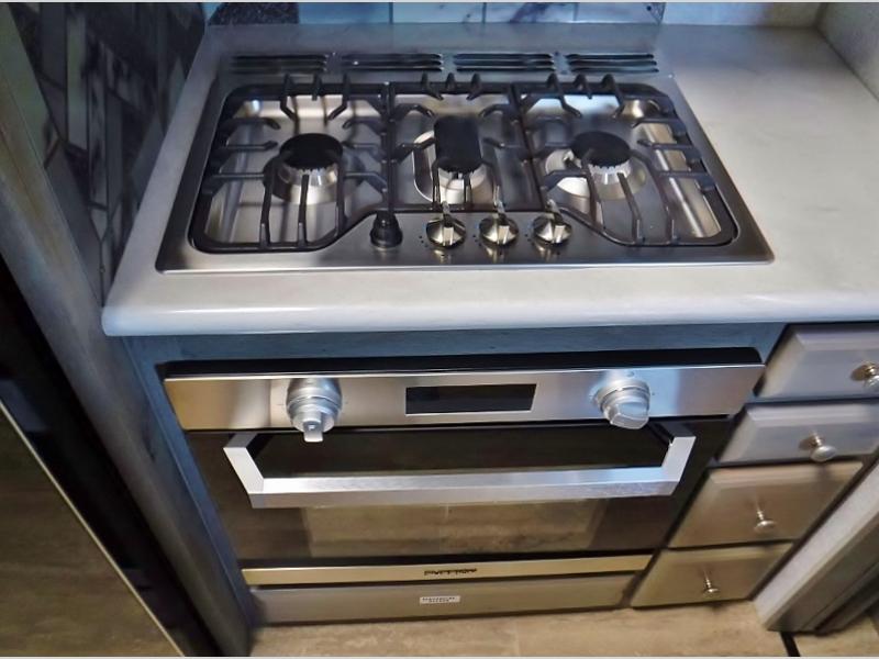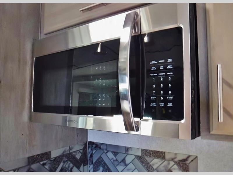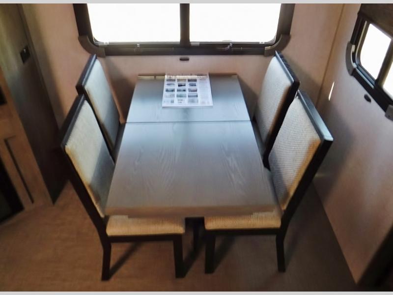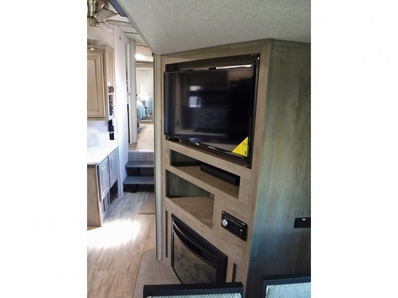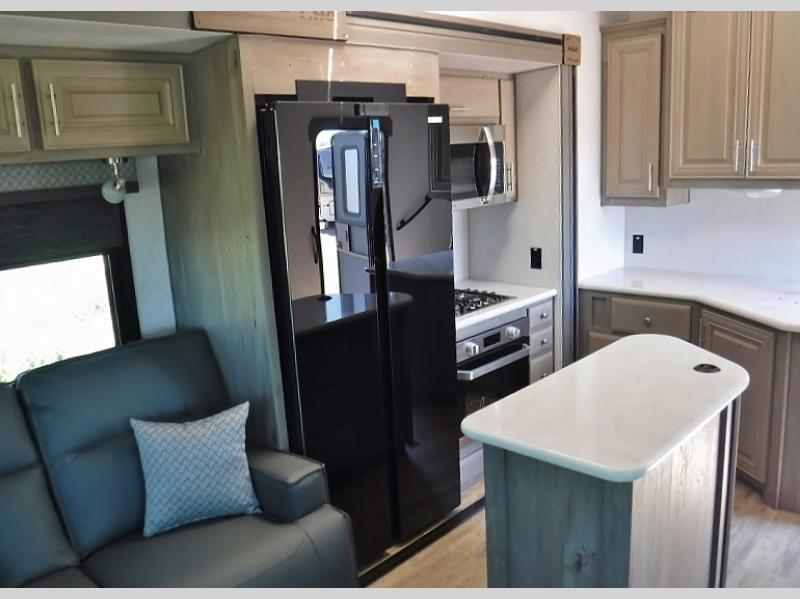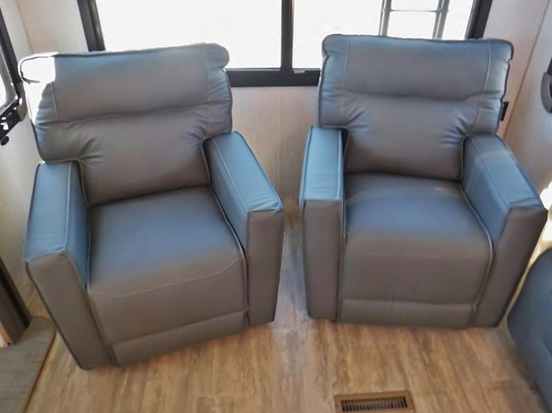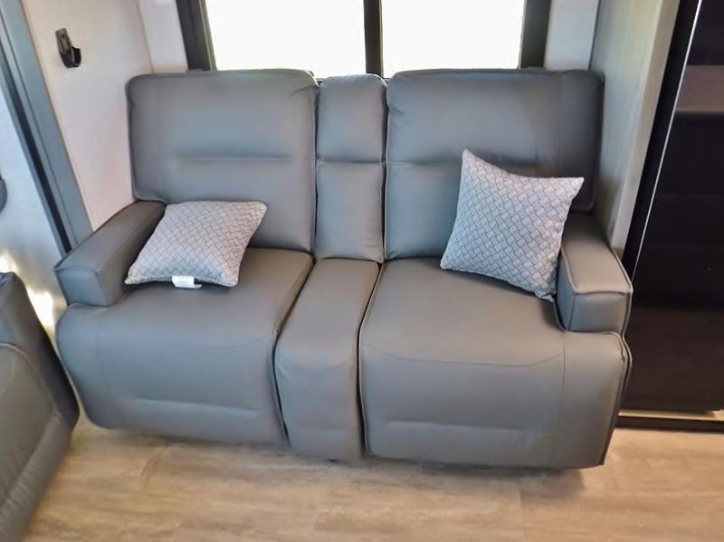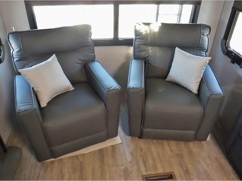 Immerse yourself in the ultimate RV experience with this extraordinary fifth wheel model! A sumptuous tri-fold sofa for luxurious lounging, two cross-stitch swivel rocker-recliners for ultimate relaxation,a sophisticated free-standing table with four chairs for refined dining and a state-of-the-art TV for captivating entertainment. The gourmet kitchen oasis offer a spacious fridge for ample storage,a functional kitchen island for added convenience,a high-quality two-burner cooktop for culinary excellence and two generously sized pantries for organized storage. For freshen up, the full bathroom offers a serene ambiance, complete with a fiberglass shower and seat. Additionally, the master bedroom has a plush king bed for restful slumber, a stylish dresser for organized storage and spacious full-width quad slide wardrobe for ample closet space, exuding convenience and comfort.