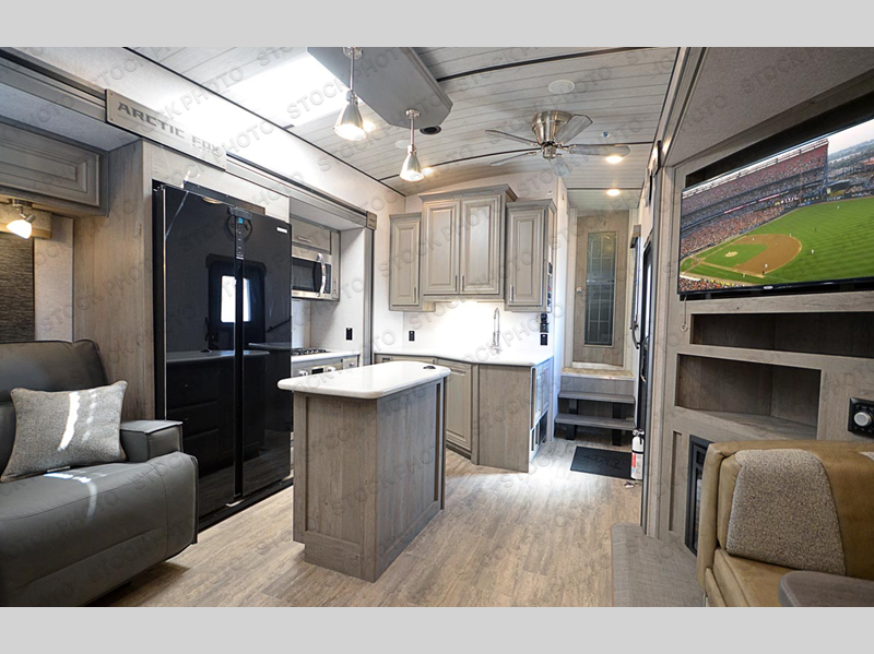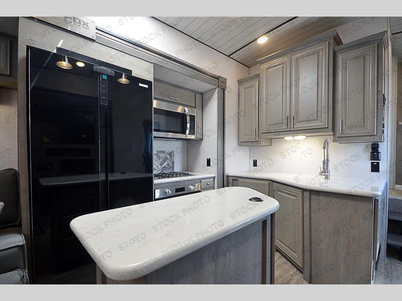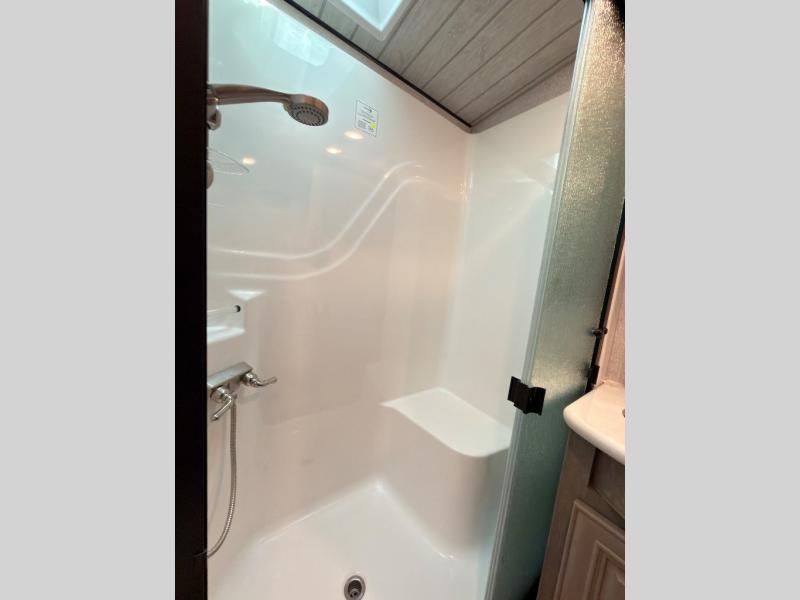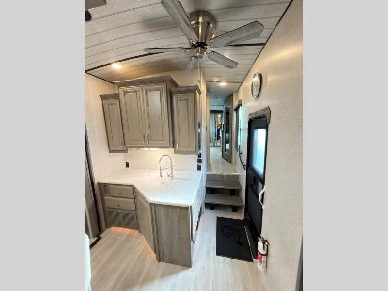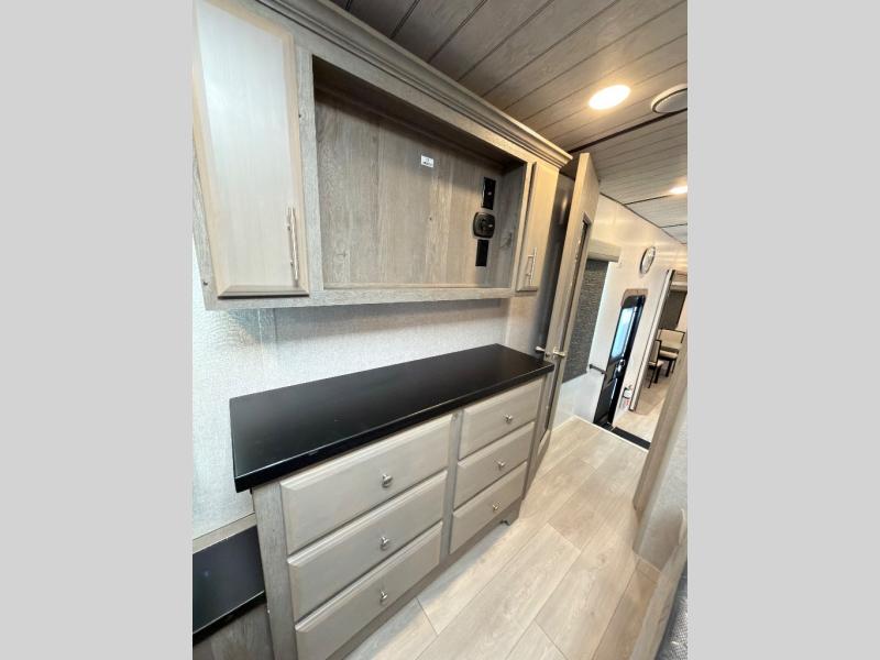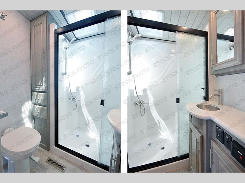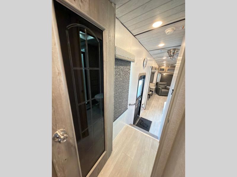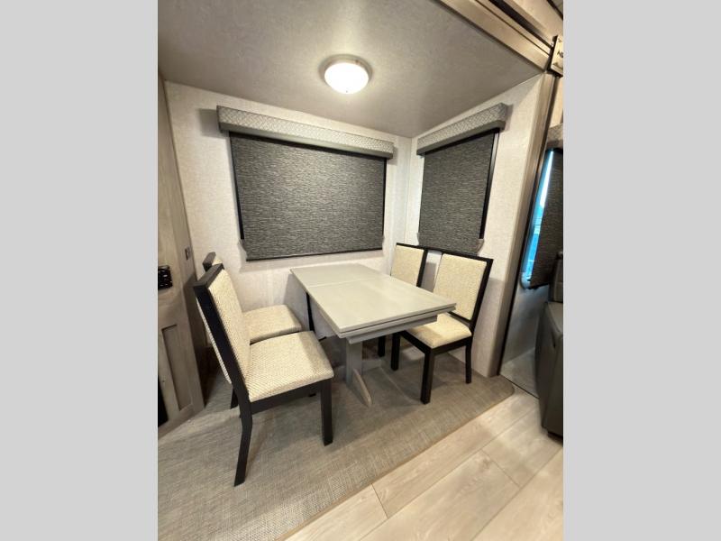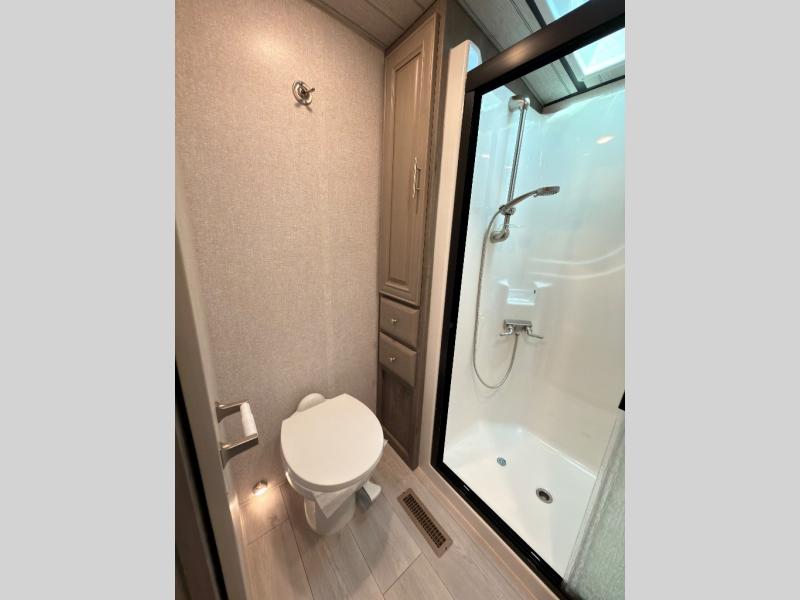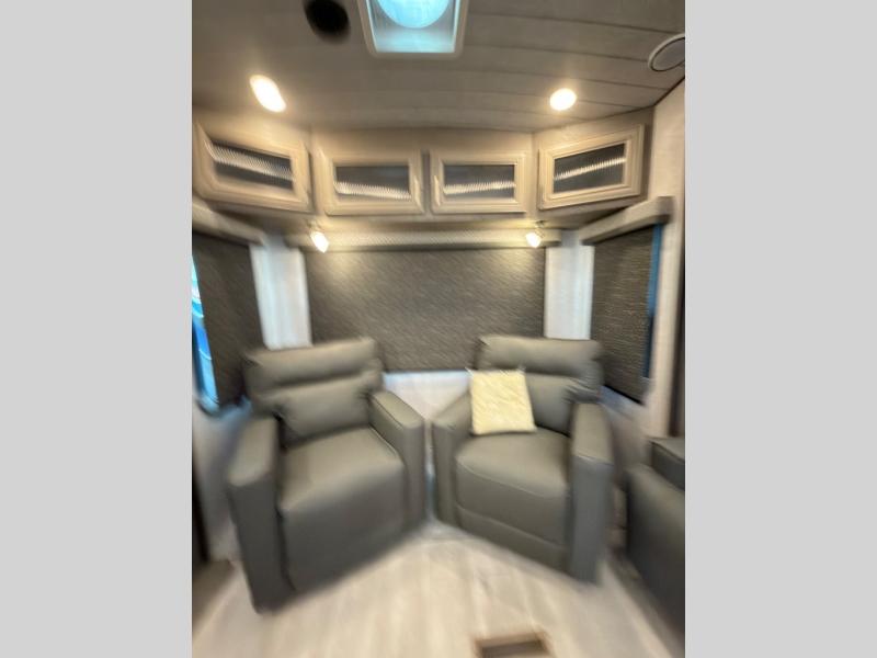 Immerse yourself in the ultimate RV experience with this extraordinary fifth wheel model! A sumptuous tri-fold sofa for luxurious lounging, two cross-stitch swivel rocker-recliners for ultimate relaxation,a sophisticated free-standing table with four chairs for refined dining and a state-of-the-art TV for captivating entertainment. The gourmet kitchen oasis offer a spacious fridge for ample storage,a functional kitchen island for added convenience,a high-quality two-burner cooktop for culinary excellence and two generously sized pantries for organized storage. For freshen up, the full bathroom offers a serene ambiance, complete with a fiberglass shower and seat. Additionally, the master bedroom has a plush king bed for restful slumber, a stylish dresser for organized storage and spacious full-width quad slide wardrobe for ample closet space, exuding convenience and comfort.
