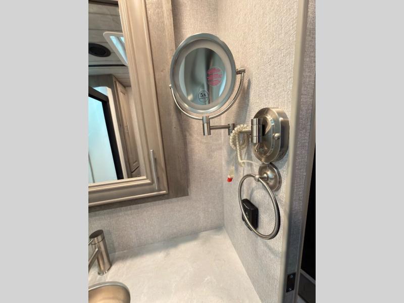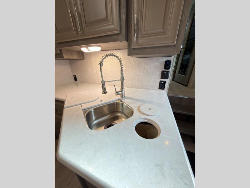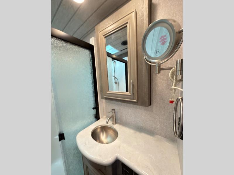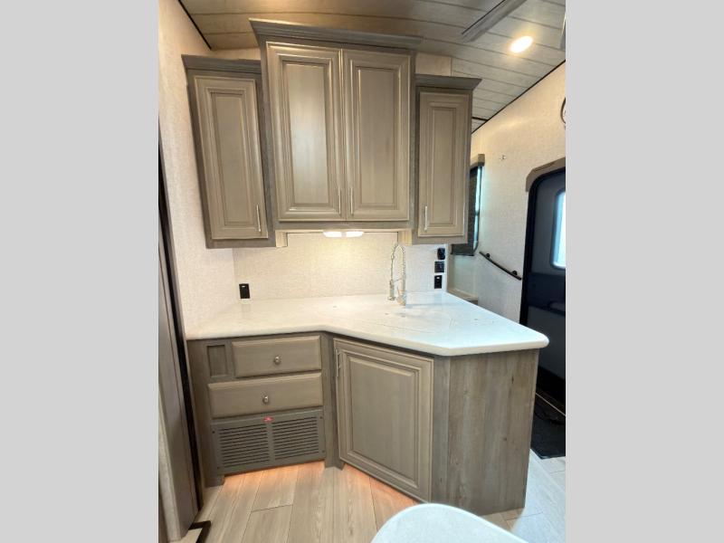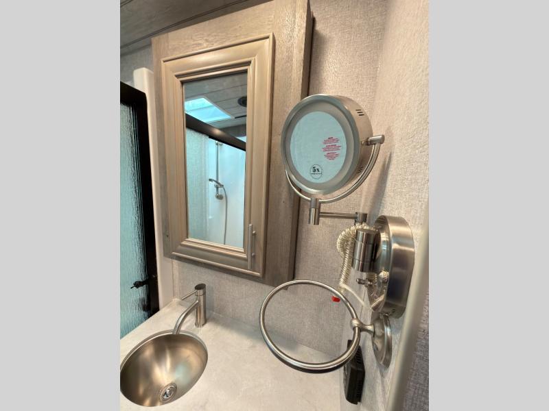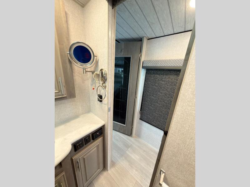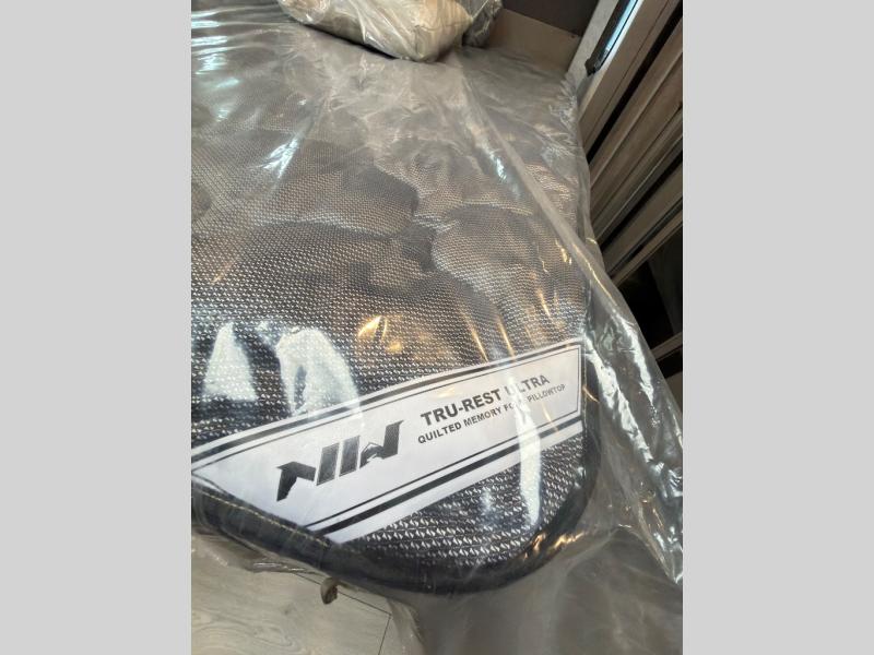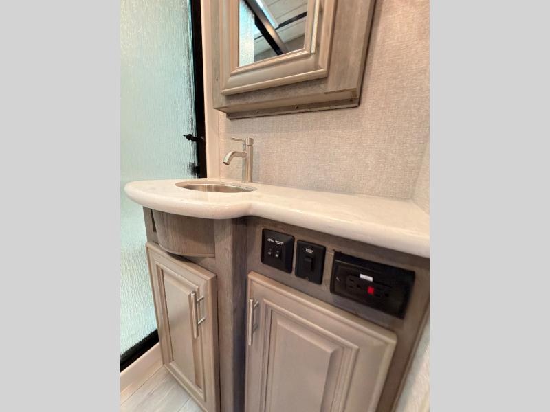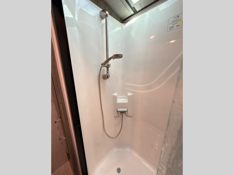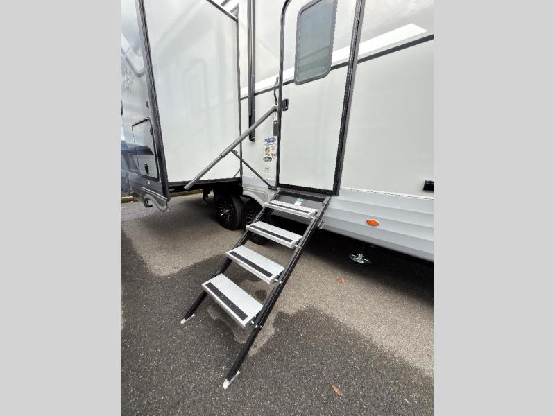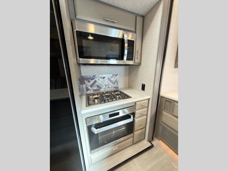 Immerse yourself in the ultimate RV experience with this extraordinary fifth wheel model! A sumptuous tri-fold sofa for luxurious lounging, two cross-stitch swivel rocker-recliners for ultimate relaxation,a sophisticated free-standing table with four chairs for refined dining and a state-of-the-art TV for captivating entertainment. The gourmet kitchen oasis offer a spacious fridge for ample storage,a functional kitchen island for added convenience,a high-quality two-burner cooktop for culinary excellence and two generously sized pantries for organized storage. For freshen up, the full bathroom offers a serene ambiance, complete with a fiberglass shower and seat. Additionally, the master bedroom has a plush king bed for restful slumber, a stylish dresser for organized storage and spacious full-width quad slide wardrobe for ample closet space, exuding convenience and comfort.