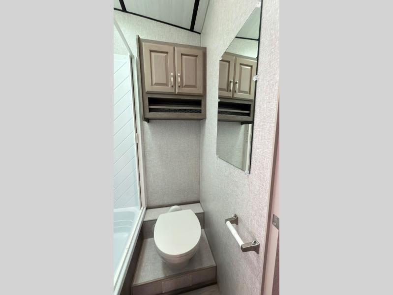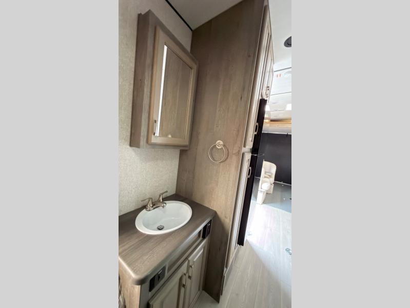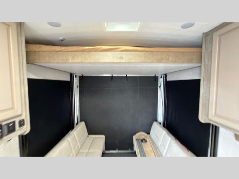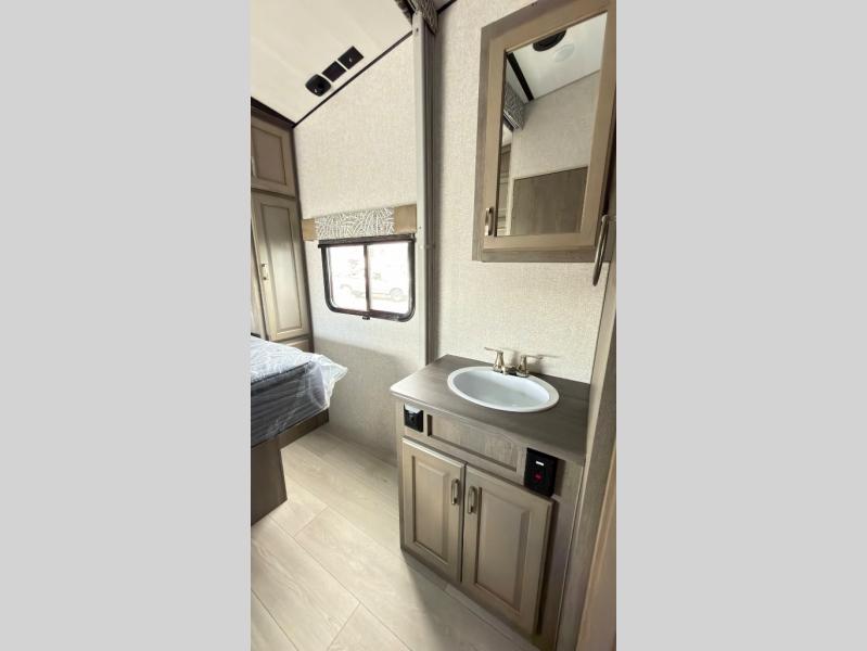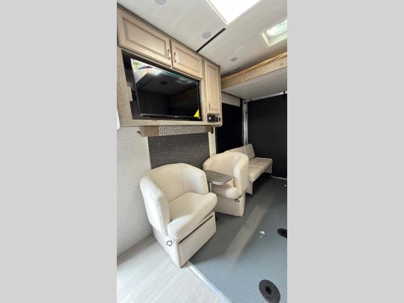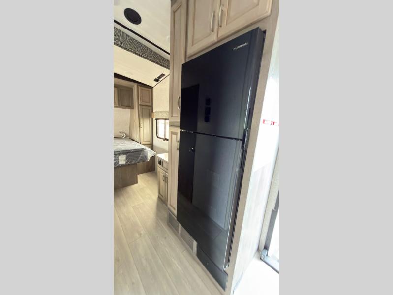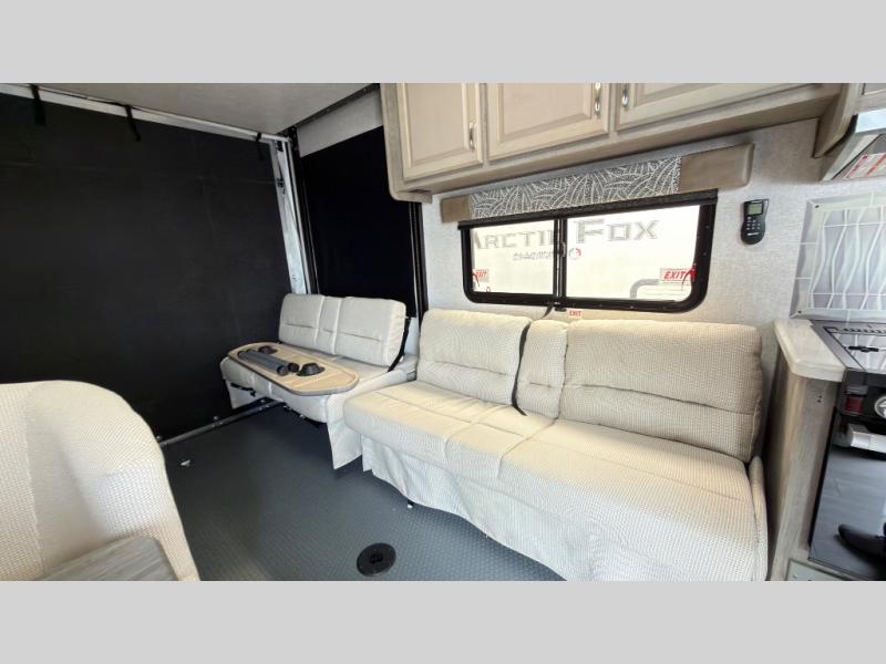 You can enjoy plenty of vacations with this Desert Fox toy hauler! There is a semi-private bedroom when you close the privacy curtain, and the bathroom has the vanity just outside the door so that someone can get ready while another is showering. The 10 cu. ft. stainless steel refrigerator will make it easy for you to bring along your favorite foods, and the high-output three-burner range will help you prepare those foods. There is a kitchen skylight with shade to bring in some sunlight while you cook. A 32" LED Smart TV rests in the living area so that you can watch a movie when it's time to come inside for the night.