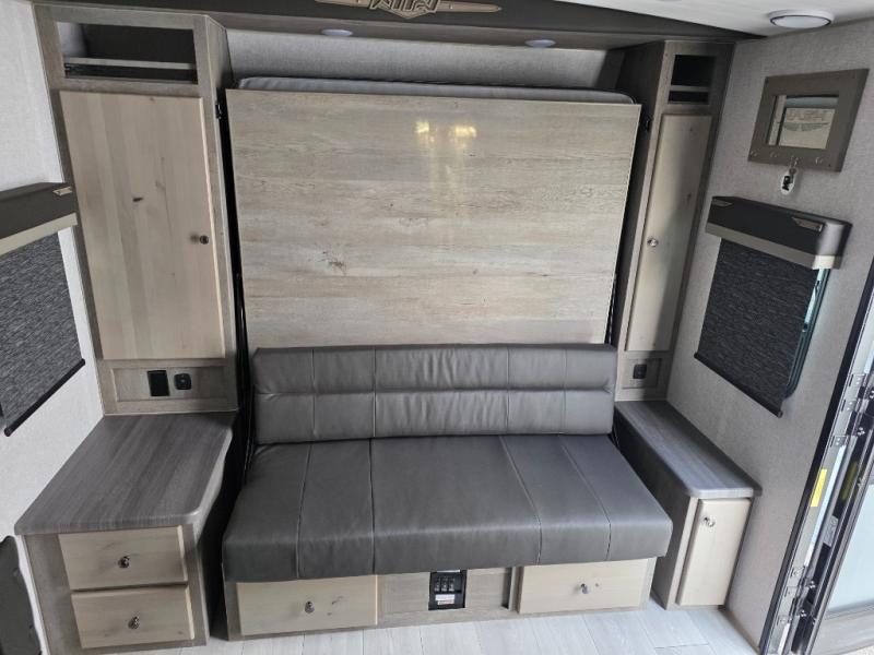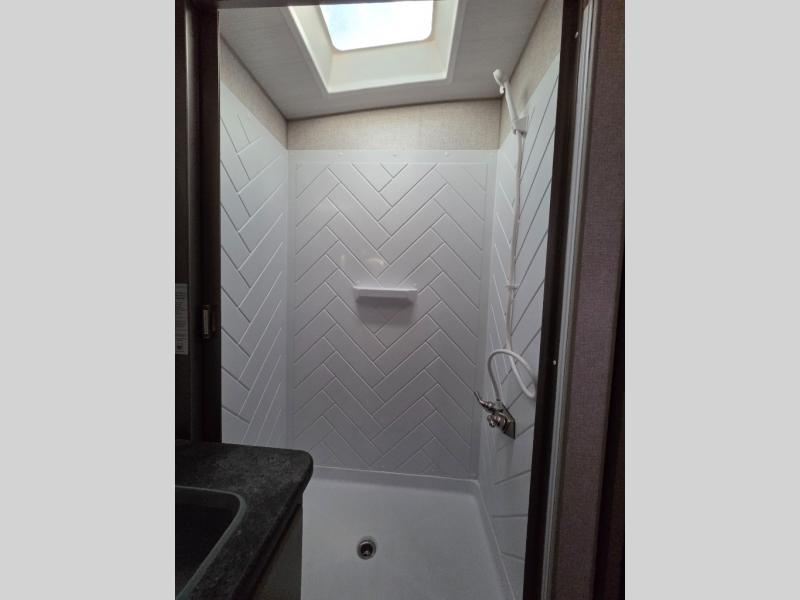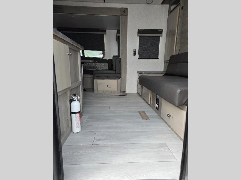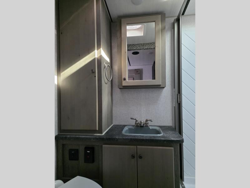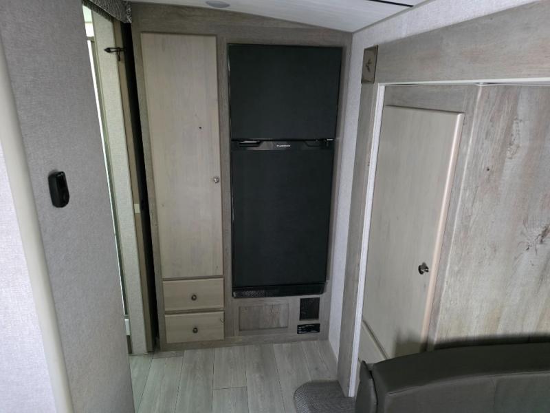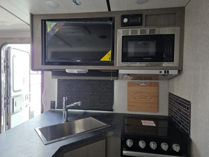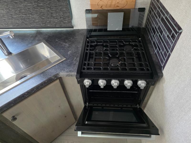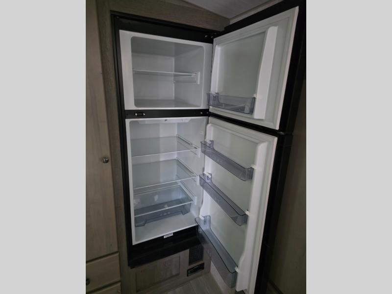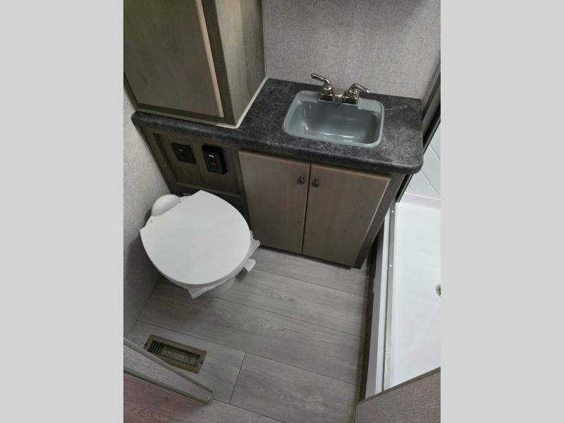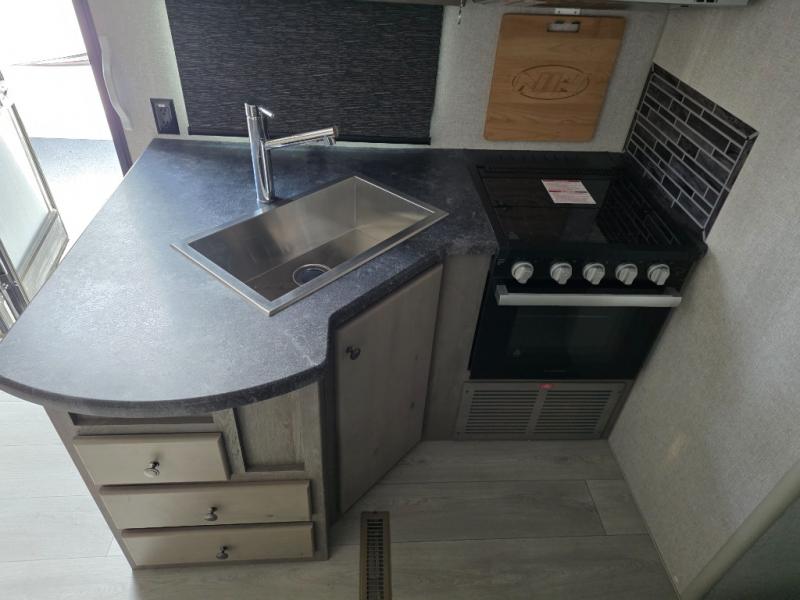 A family of three or four will love camping in this trailer with the versatile front roll over sofa and 60" x 74.5" Murphy bed, and the slide out with a U-shaped dinette and wardrobe. The dinette converts to 45" x 85" sleeping area for your child or smaller children at night making it versatile for your needs. You will find three wardrobes for your clothing, a pantry for your dry goods, and exterior storage for your outdoor gear. The full bathroom will let you freshen up before bedtime, and the kitchen offers a three burner range plus a 10 cu. ft. 12V refrigerator to keep cold items fresh!