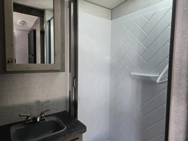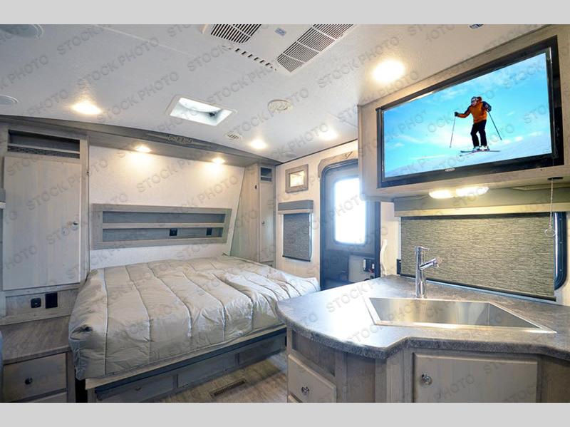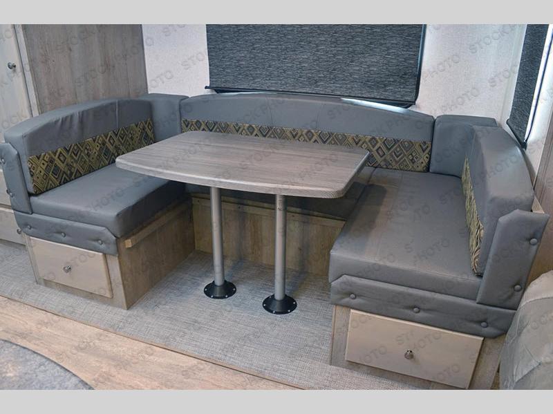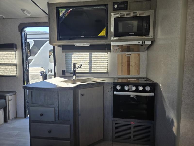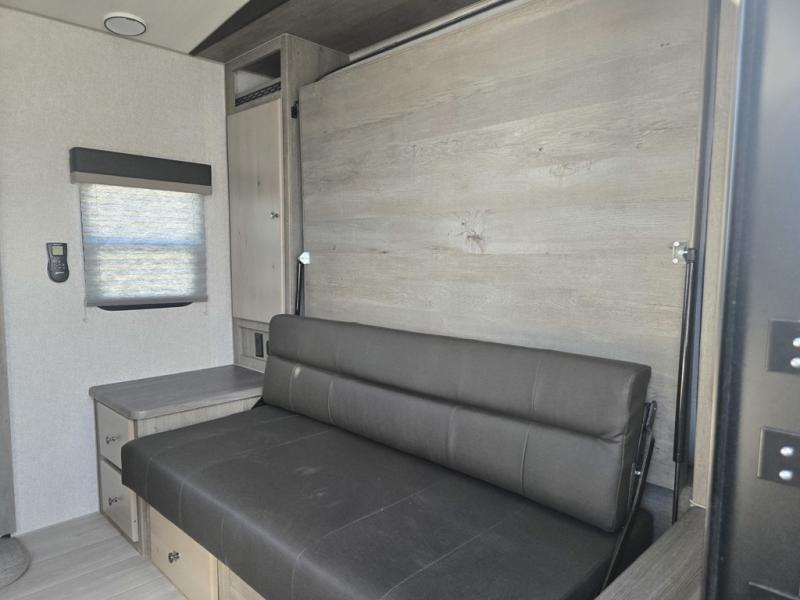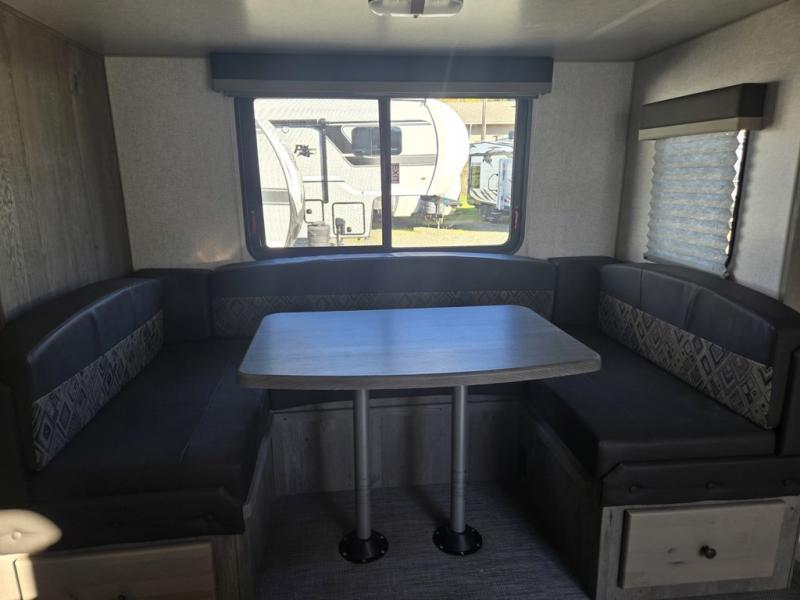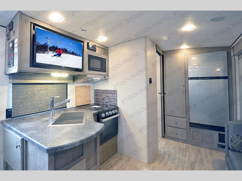 A family of three or four will love camping in this trailer with the versatile front roll over sofa and 60" x 74.5" Murphy bed, and the slide out with a U-shaped dinette and wardrobe. The dinette converts to 45" x 85" sleeping area for your child or smaller children at night making it versatile for your needs. You will find three wardrobes for your clothing, a pantry for your dry goods, and exterior storage for your outdoor gear. The full bathroom will let you freshen up before bedtime, and the kitchen offers a three burner range plus a 10 cu. ft. 12V refrigerator to keep cold items fresh!