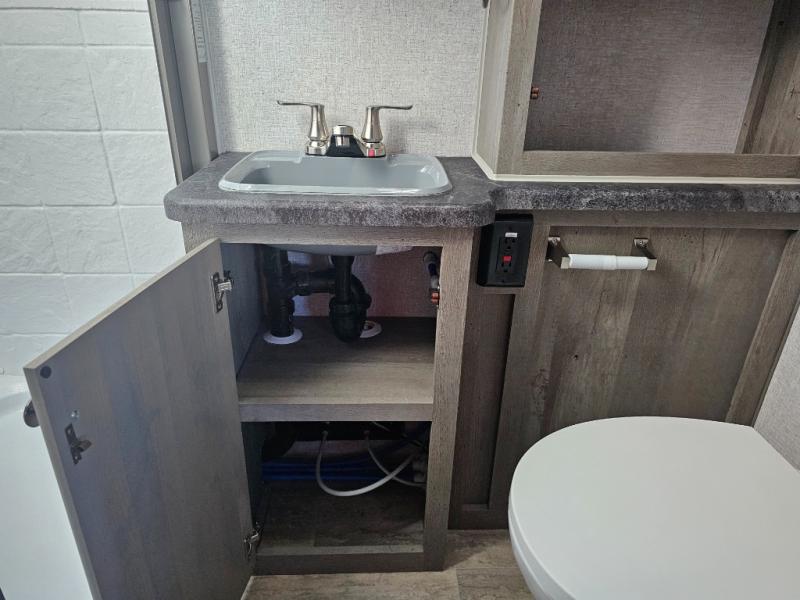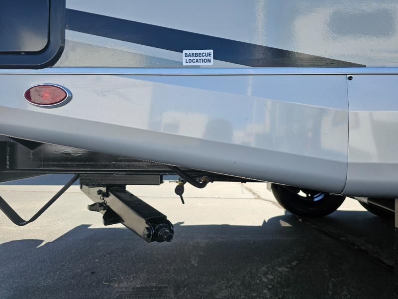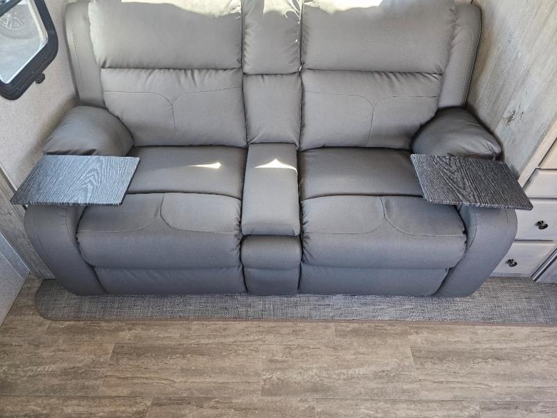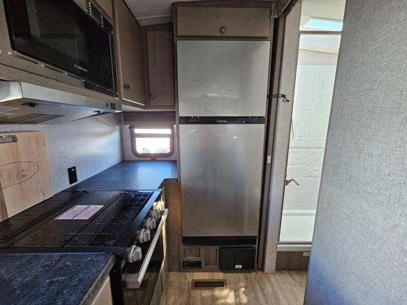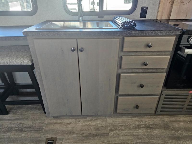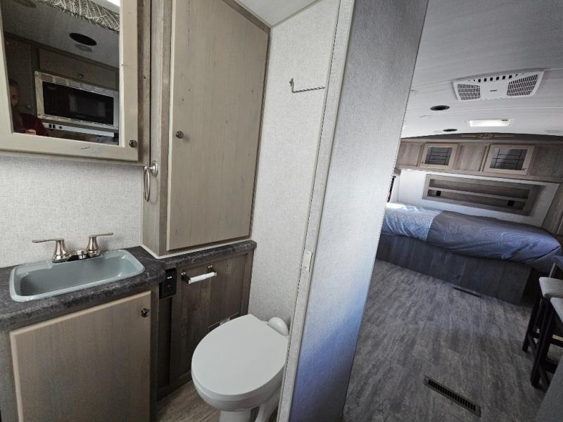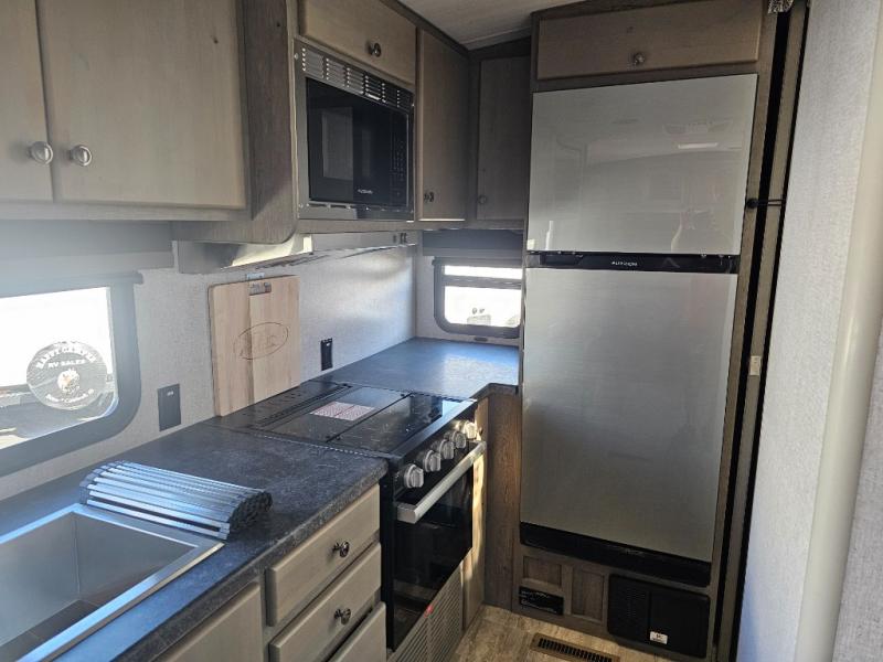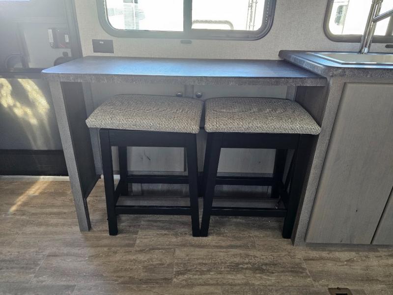 This is the perfect couple's trailer for all your adventures! You can wake up on the queen bed feeling refreshed each morning, and the wardrobe by the foot of the bed will keep your clothes organized. There is a theater seating slide out for more floor space and a place to relax each day, and the dining bar with bar stools gives you a place to enjoy meals together. And don't overlook the full bath with a shower skylight, a foot-flush toilet, and a linen closet for clean towels!