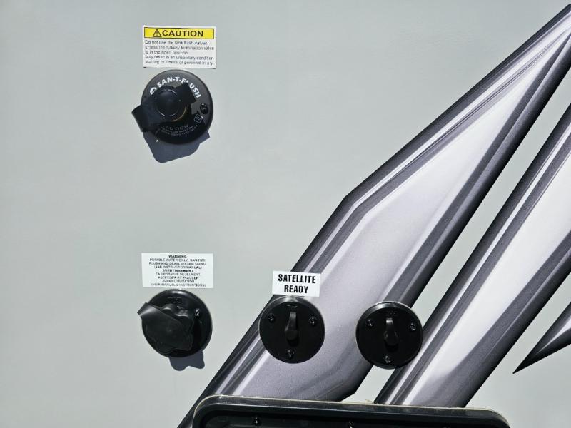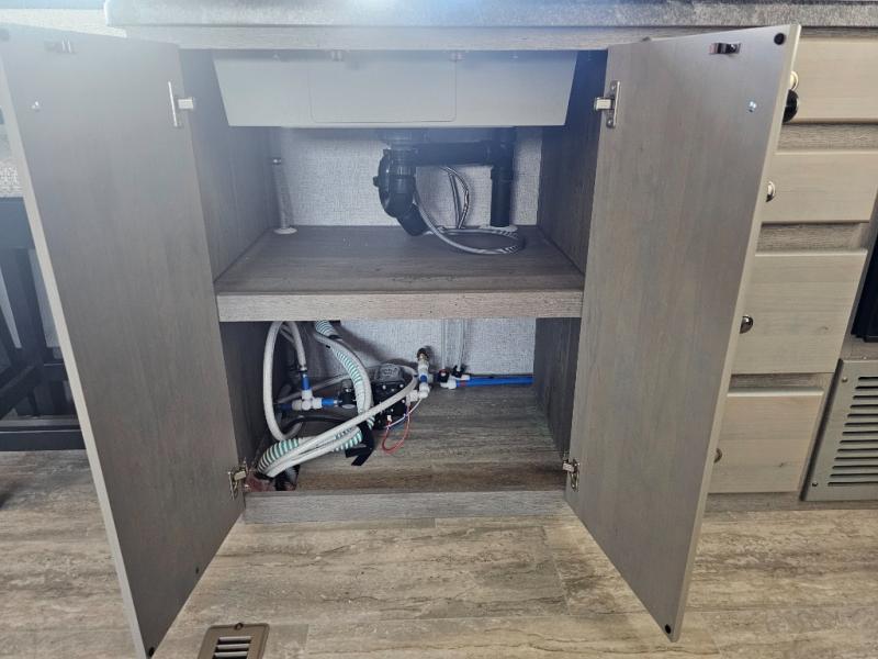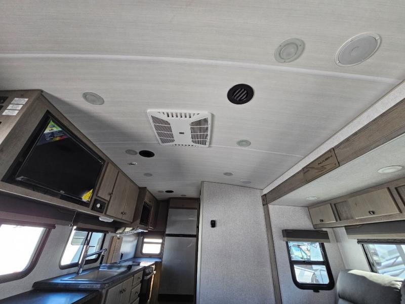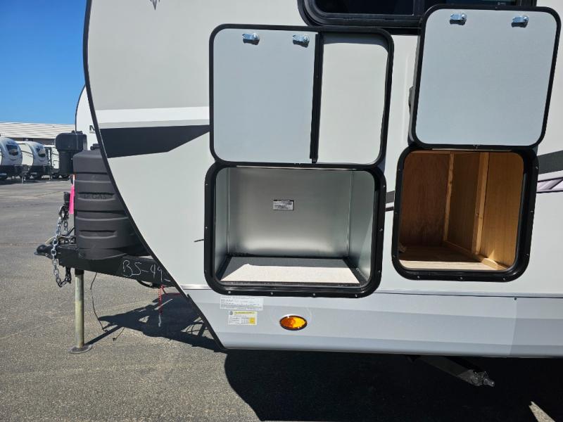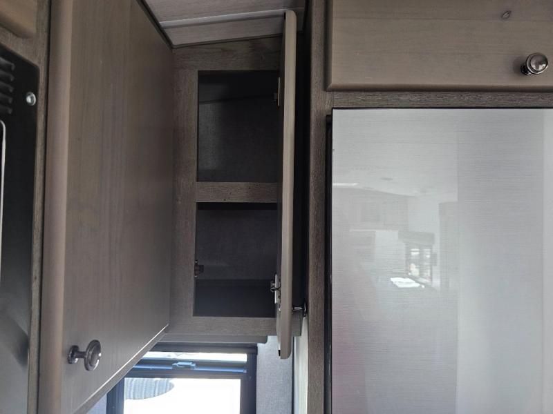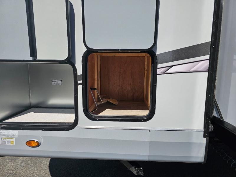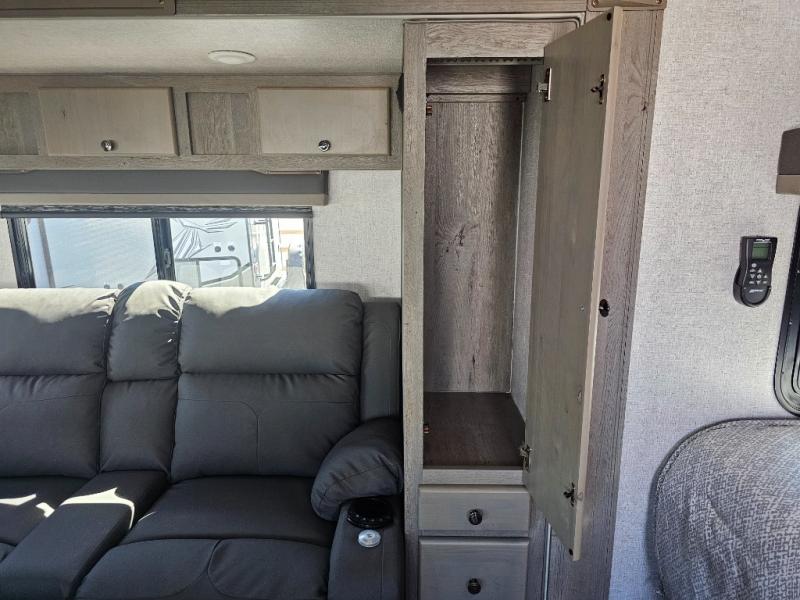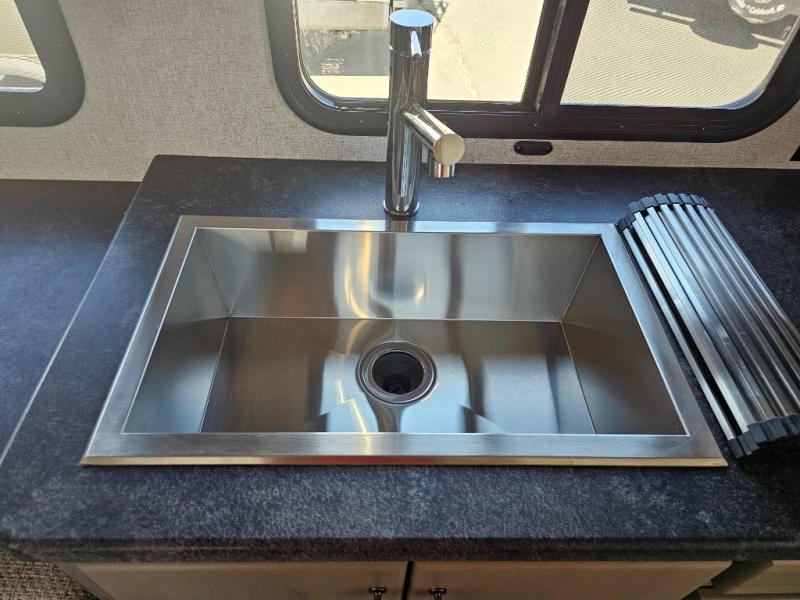This is the perfect couple's trailer for all your adventures! You can wake up on the queen bed feeling refreshed each morning, and the wardrobe by the foot of the bed will keep your clothes organized. There is a theater seating slide out for more floor space and a place to relax each day, and the dining bar with bar stools gives you a place to enjoy meals together. And don't overlook the full bath with a shower skylight, a foot-flush toilet, and a linen closet for clean towels!