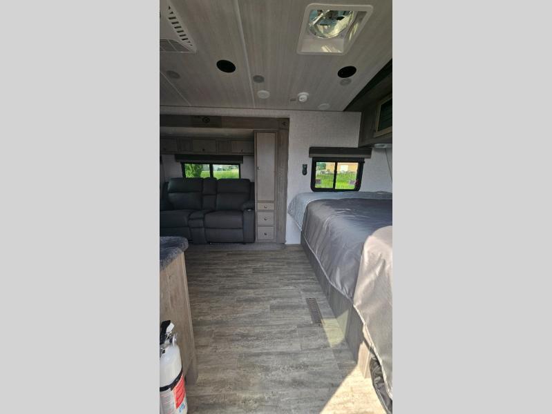 This is the perfect couple's trailer for all your adventures! You can wake up on the queen bed feeling refreshed each morning, and the wardrobe by the foot of the bed will keep your clothes organized. There is a theater seating slide out for more floor space and a place to relax each day, and the dining bar with bar stools gives you a place to enjoy meals together. And don't overlook the full bath with a shower skylight, a foot-flush toilet, and a linen closet for clean towels!