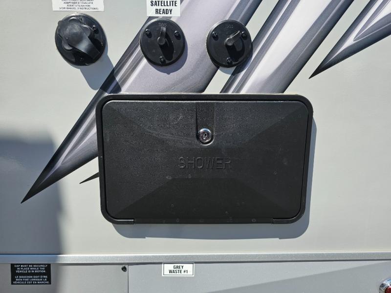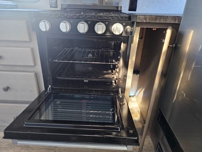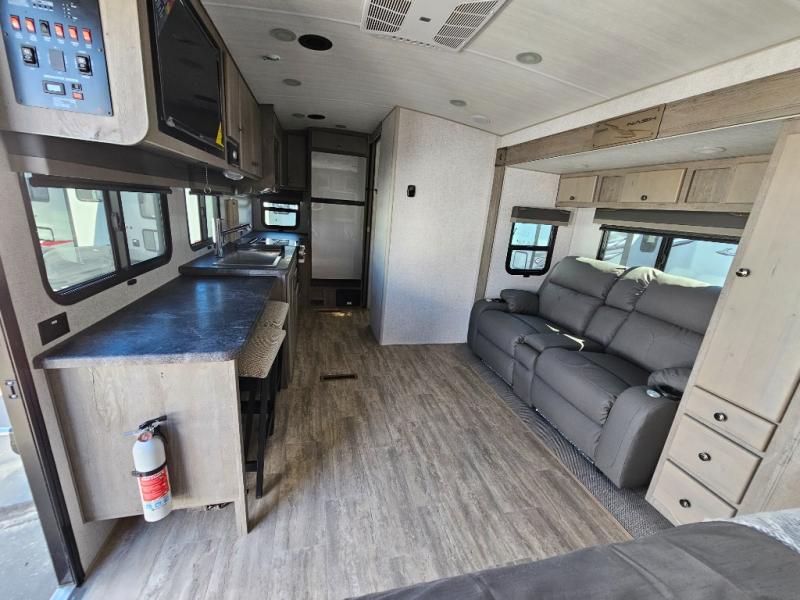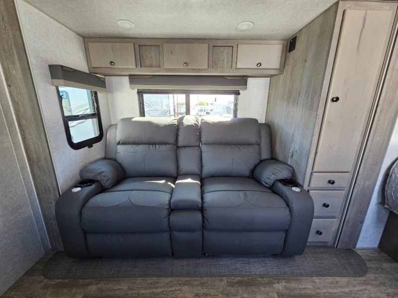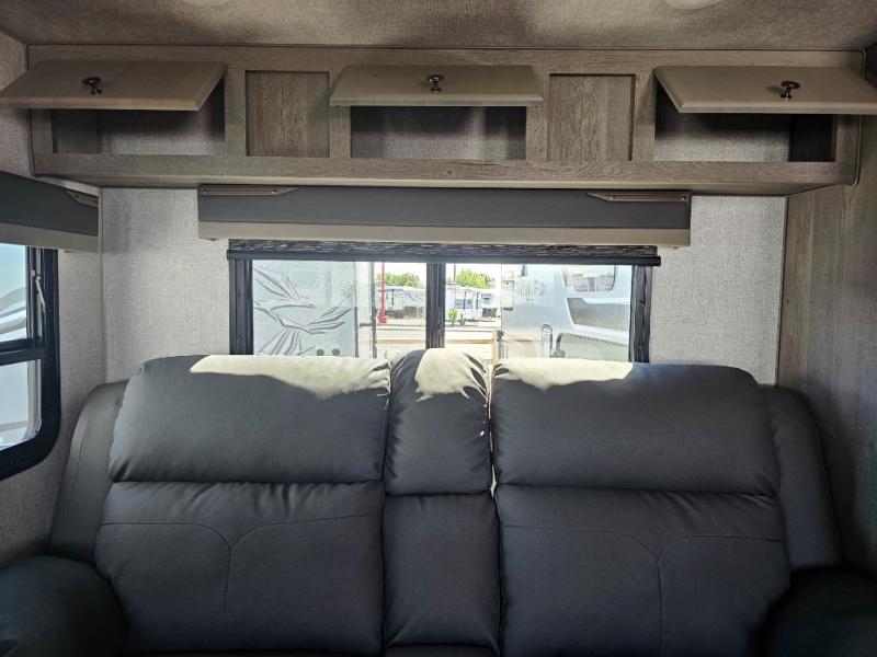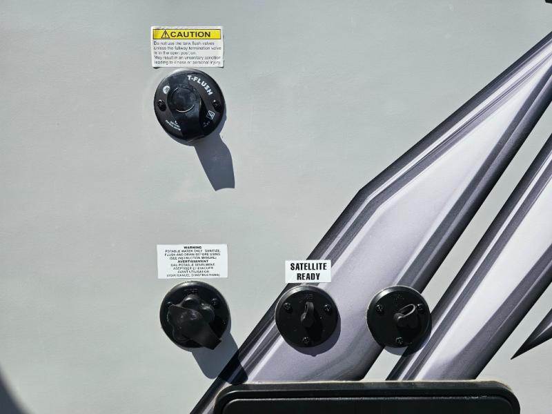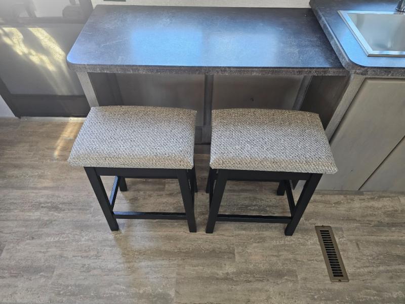This is the perfect couple's trailer for all your adventures! You can wake up on the queen bed feeling refreshed each morning, and the wardrobe by the foot of the bed will keep your clothes organized. There is a theater seating slide out for more floor space and a place to relax each day, and the dining bar with bar stools gives you a place to enjoy meals together. And don't overlook the full bath with a shower skylight, a foot-flush toilet, and a linen closet for clean towels!