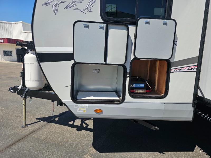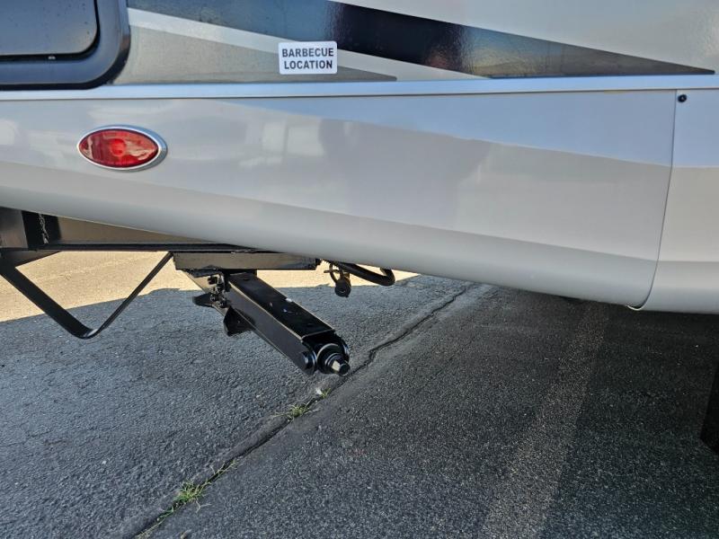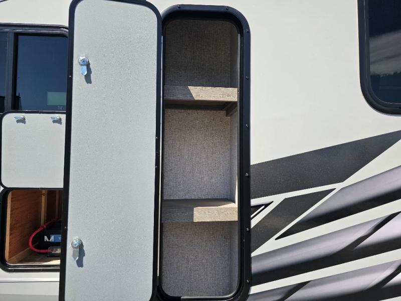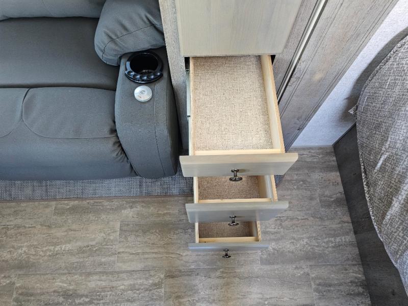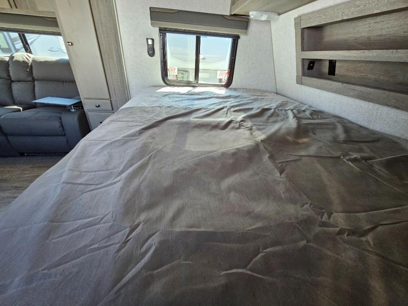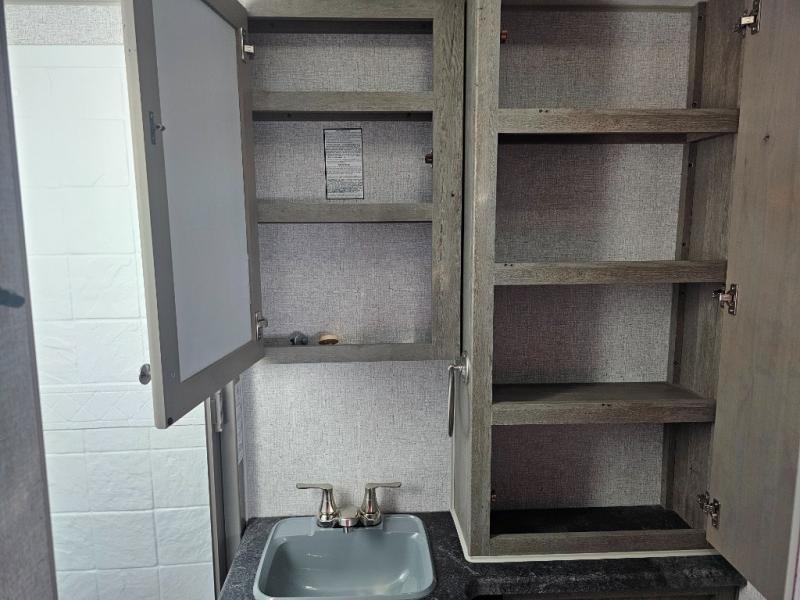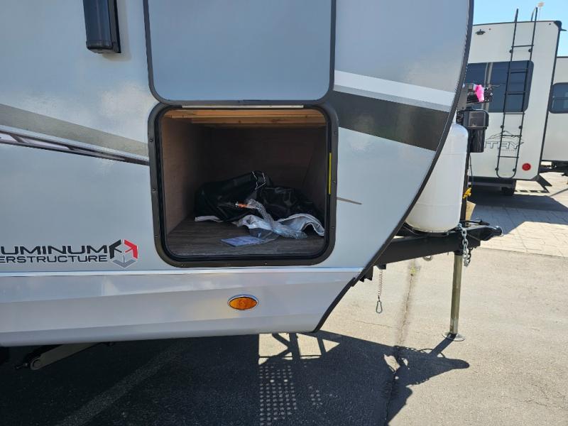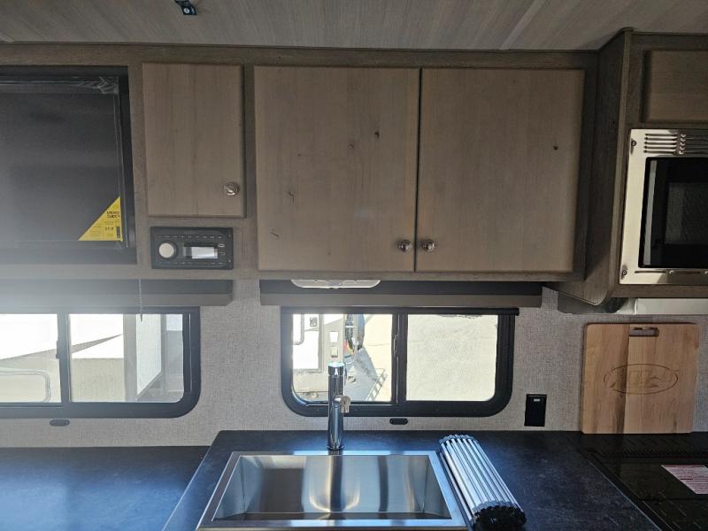 This is the perfect couple's trailer for all your adventures! You can wake up on the queen bed feeling refreshed each morning, and the wardrobe by the foot of the bed will keep your clothes organized. There is a theater seating slide out for more floor space and a place to relax each day, and the dining bar with bar stools gives you a place to enjoy meals together. And don't overlook the full bath with a shower skylight, a foot-flush toilet, and a linen closet for clean towels!