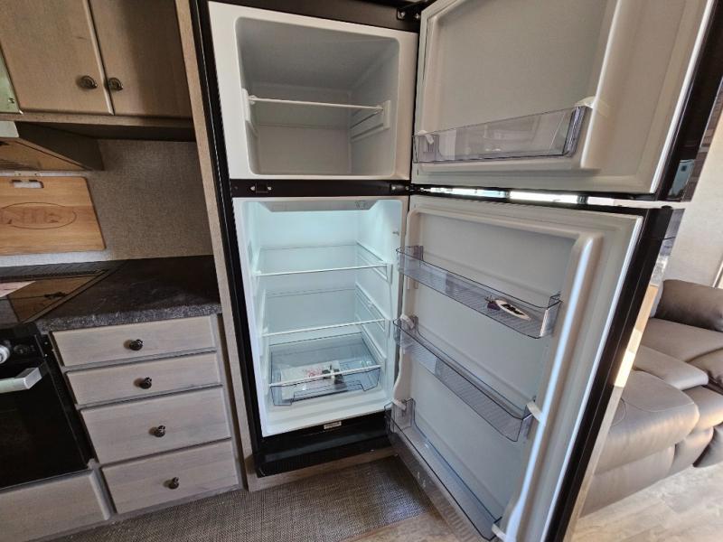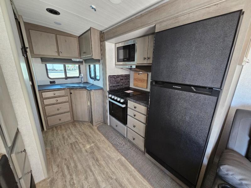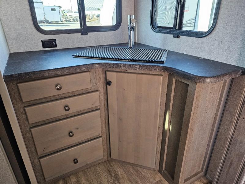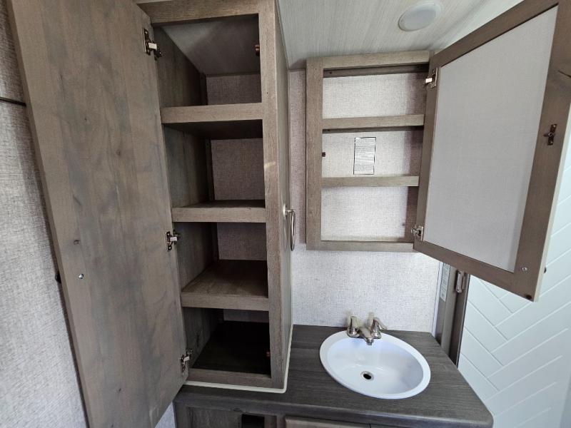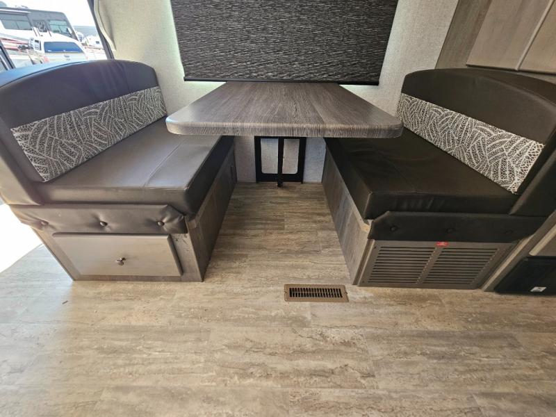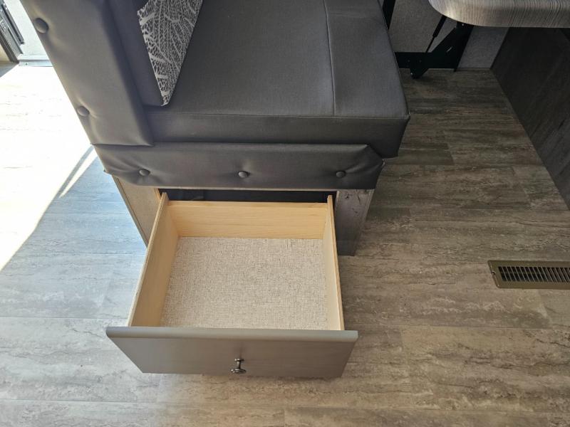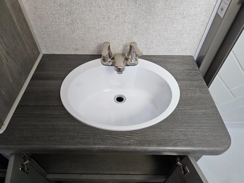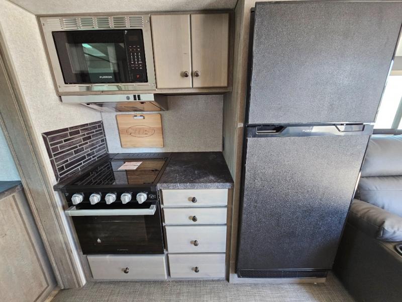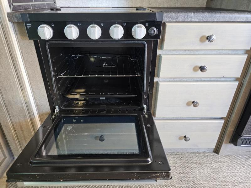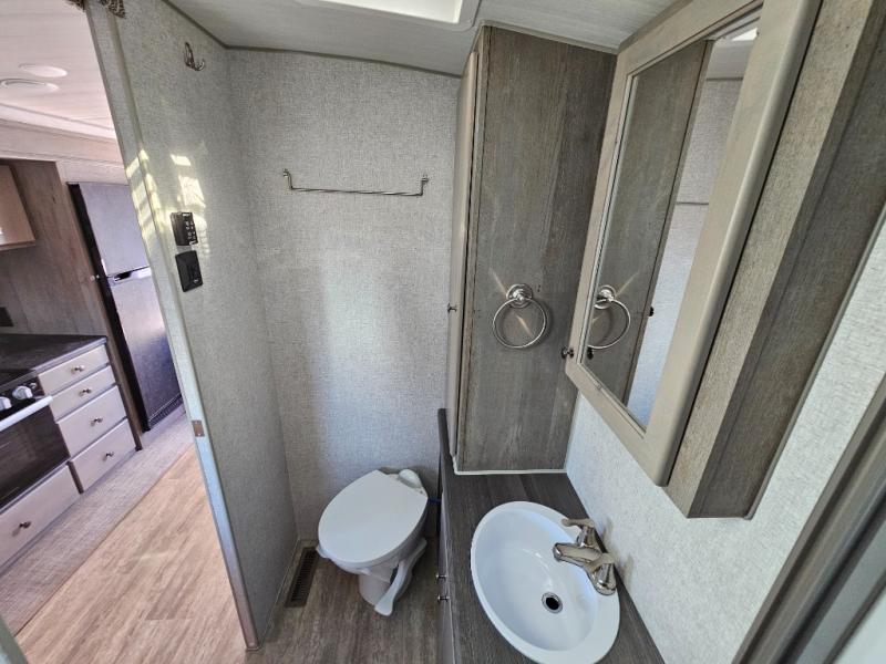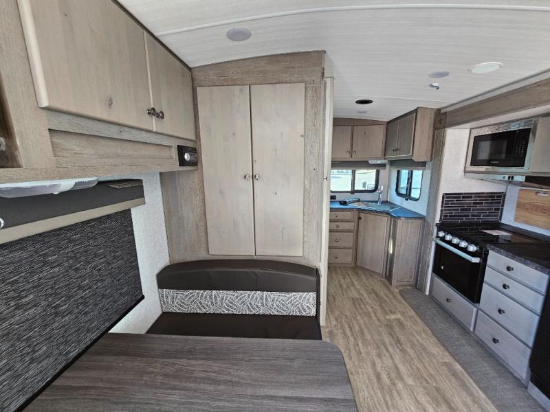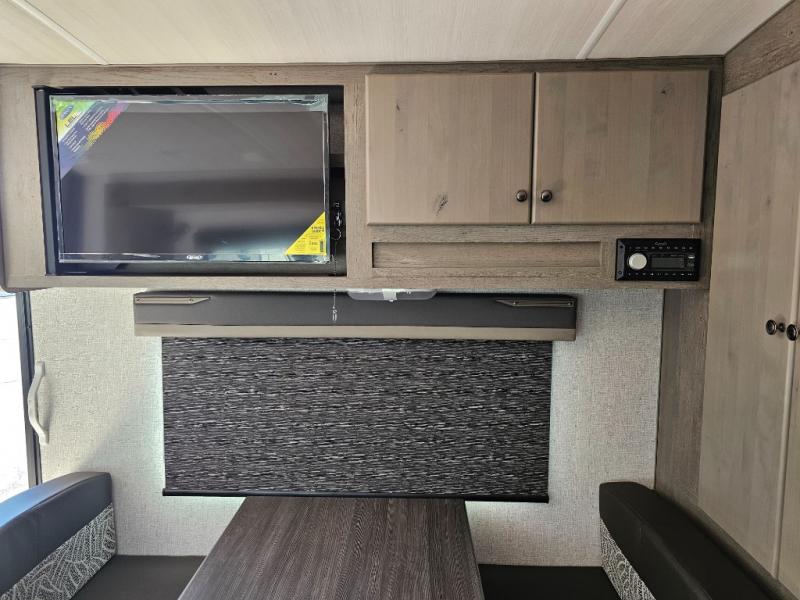 Escape to the campground in this travel trailer for three to four. The front queen bed includes dual wardrobes to keep your clothes tidy and overhead cabinets for your belongings. You can relax on the theater seating within the large slide out, and the booth dinette can convert to a 40" x 75" sleeping area for guests. The rear of this unit is shared with the full bath and the kitchen counter with a stainless steel sink. You can prepare meals on the three burner range and keep food fresh in the 10 cu. ft. 12V refrigerator.