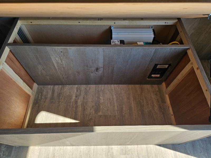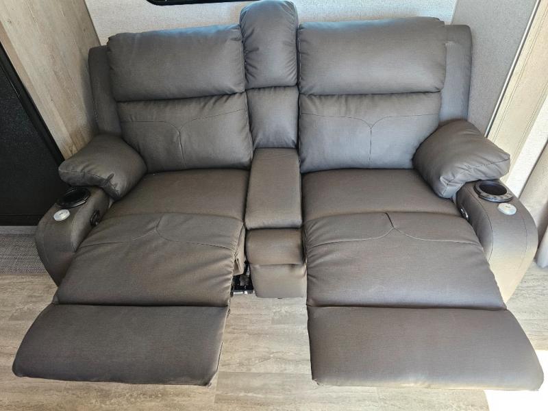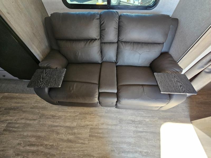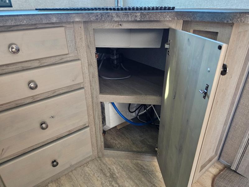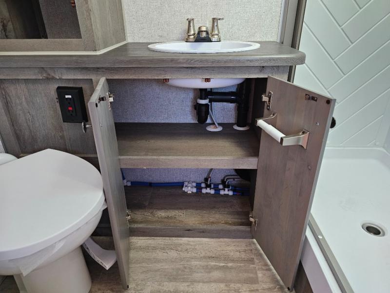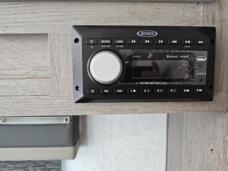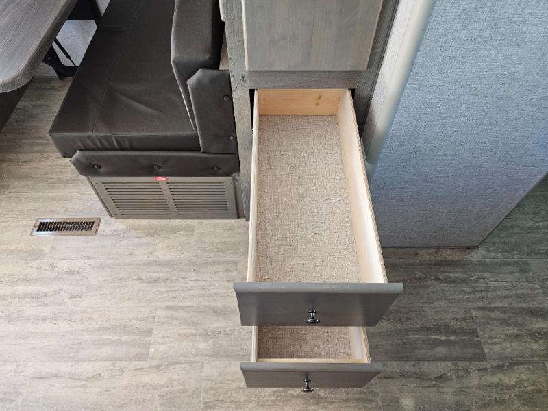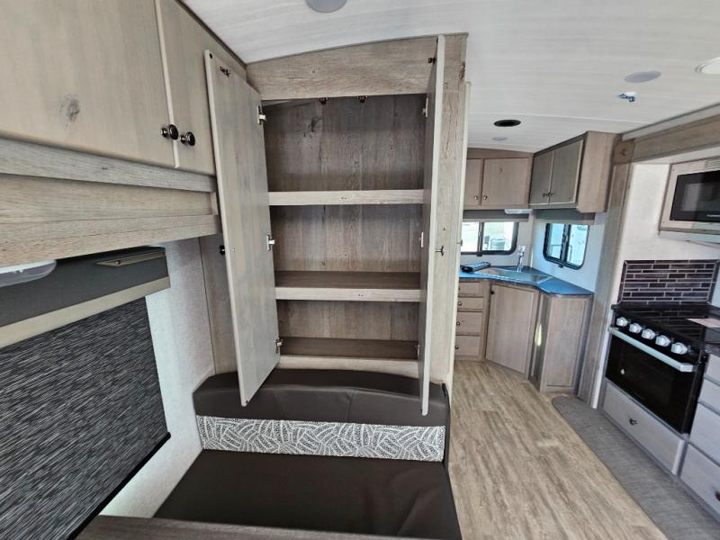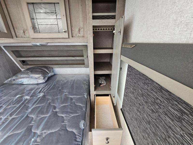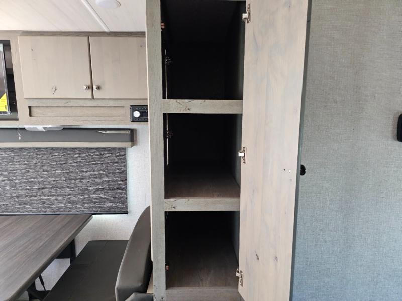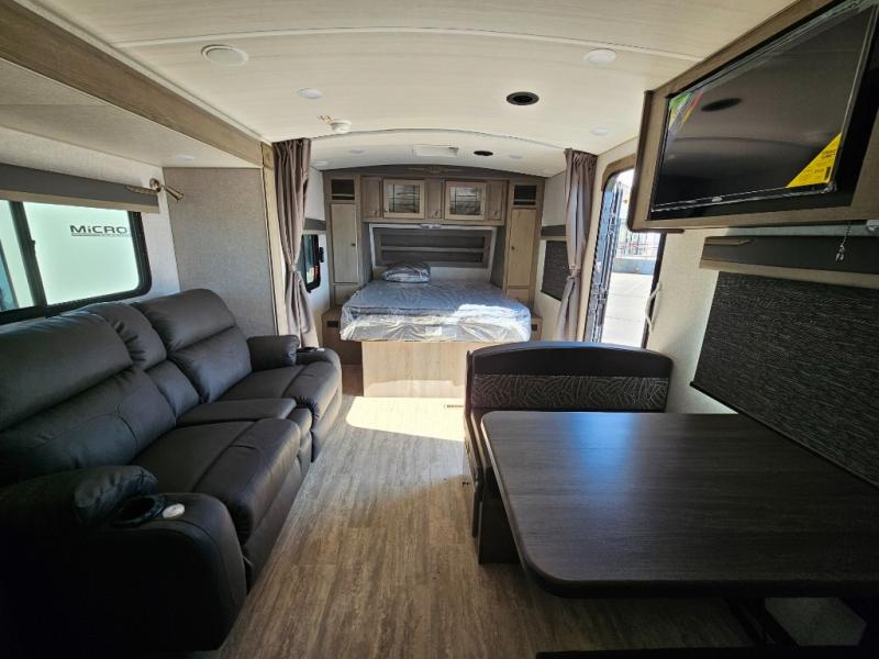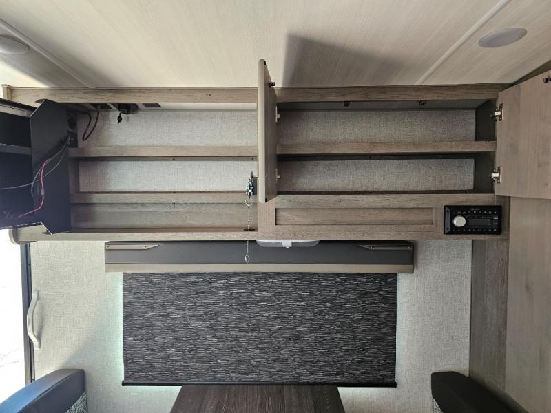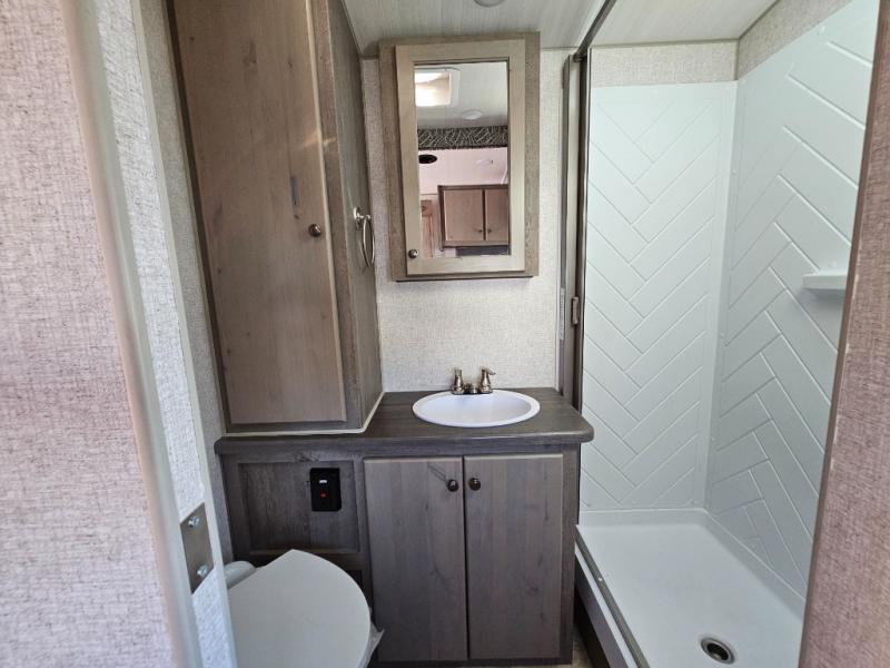 Escape to the campground in this travel trailer for three to four. The front queen bed includes dual wardrobes to keep your clothes tidy and overhead cabinets for your belongings. You can relax on the theater seating within the large slide out, and the booth dinette can convert to a 40" x 75" sleeping area for guests. The rear of this unit is shared with the full bath and the kitchen counter with a stainless steel sink. You can prepare meals on the three burner range and keep food fresh in the 10 cu. ft. 12V refrigerator.