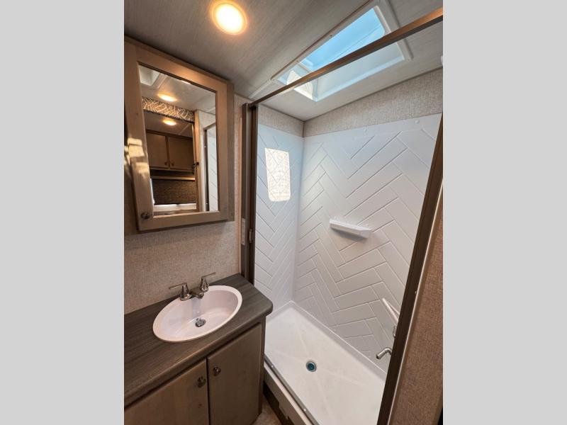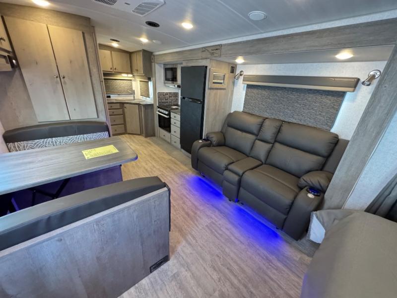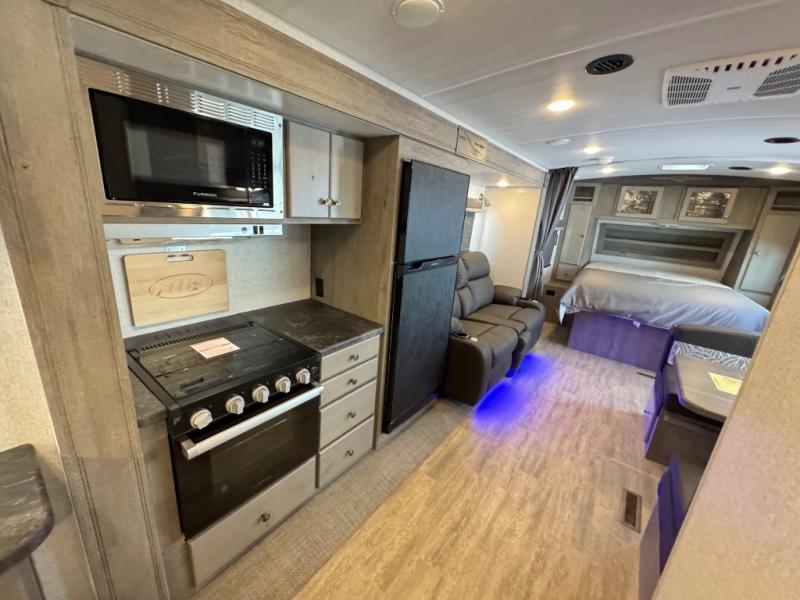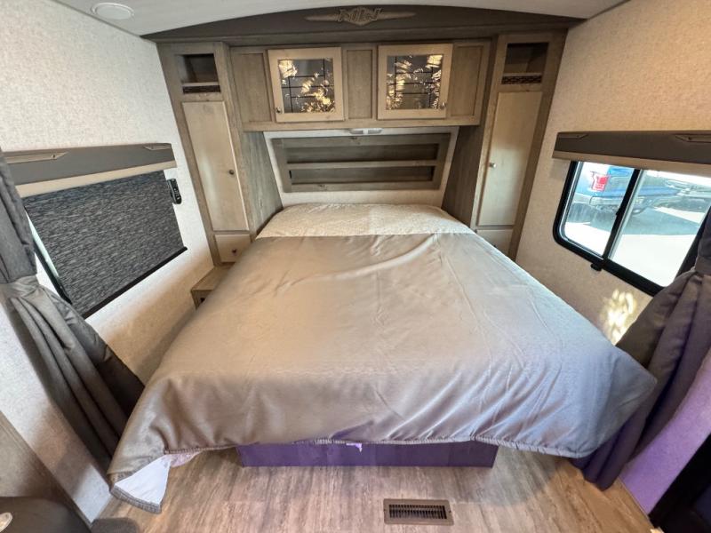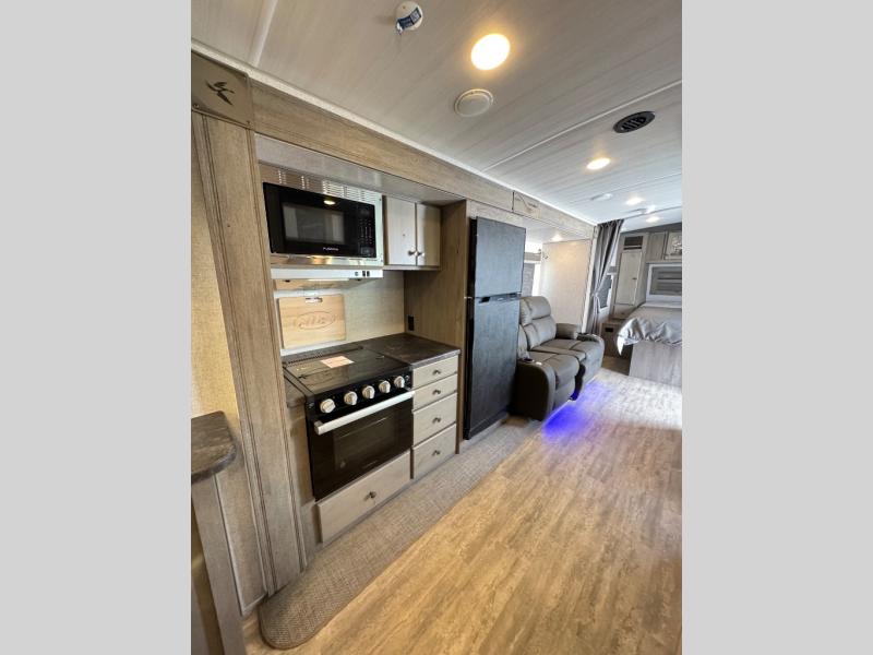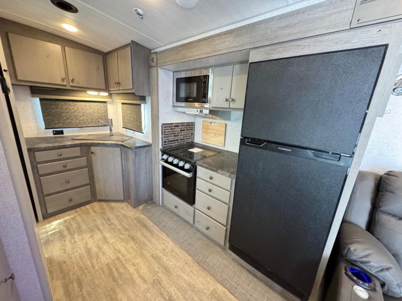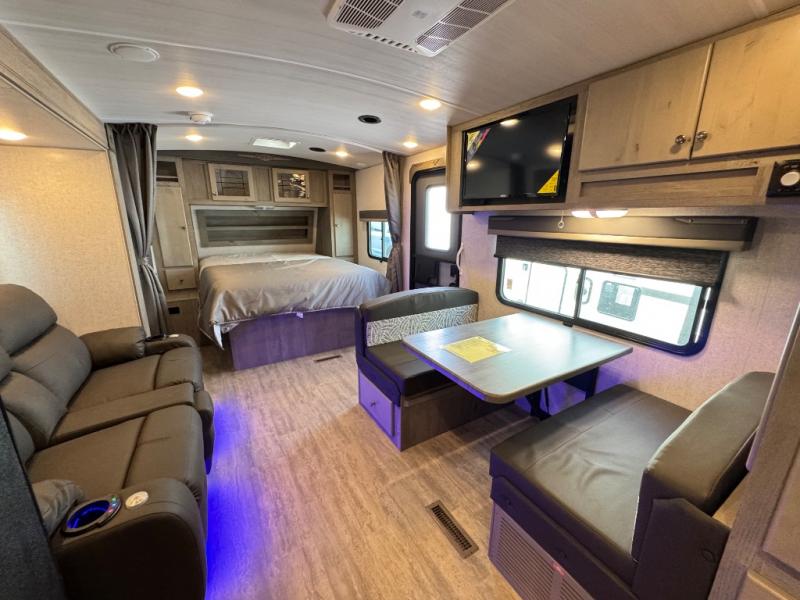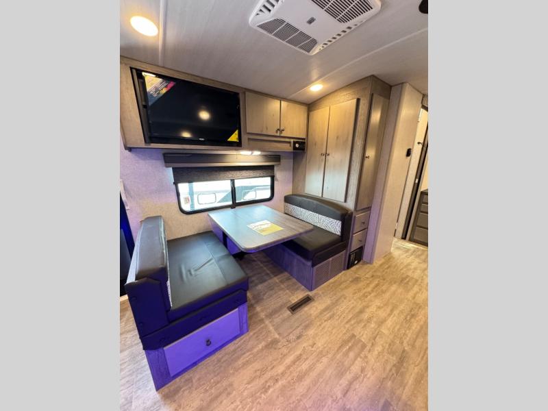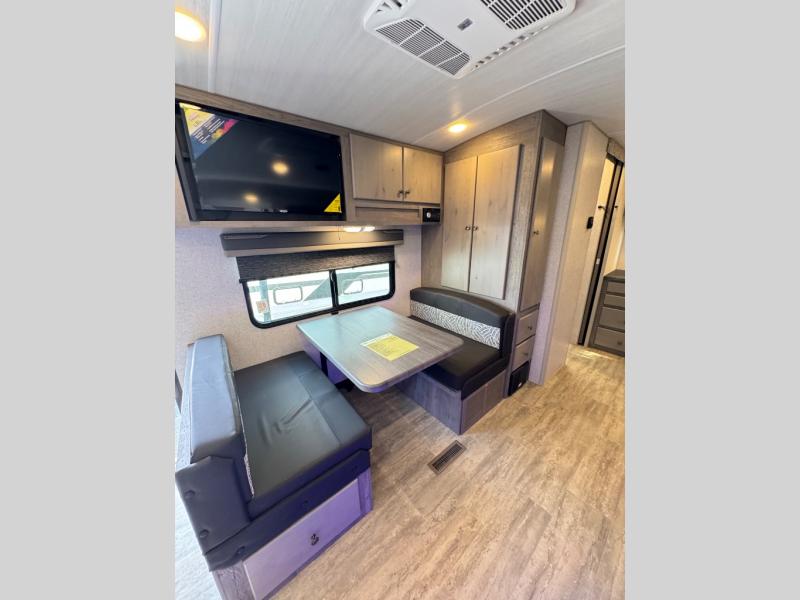 Escape to the campground in this travel trailer for three to four. The front queen bed includes dual wardrobes to keep your clothes tidy and overhead cabinets for your belongings. You can relax on the theater seating within the large slide out, and the booth dinette can convert to a 40" x 75" sleeping area for guests. The rear of this unit is shared with the full bath and the kitchen counter with a stainless steel sink. You can prepare meals on the three burner range and keep food fresh in the 10 cu. ft. 12V refrigerator.
