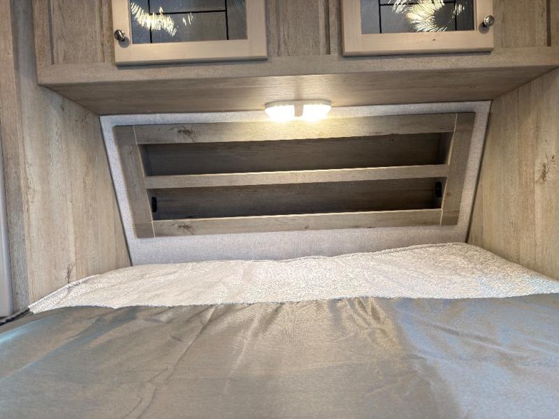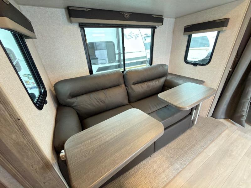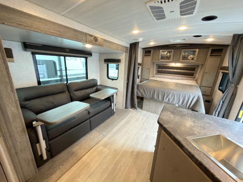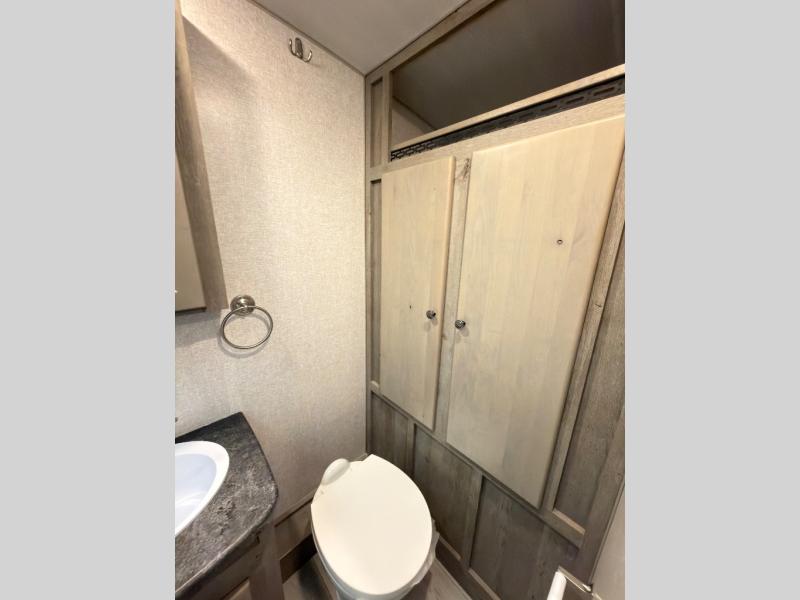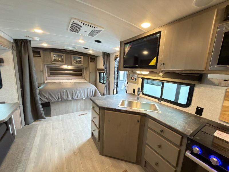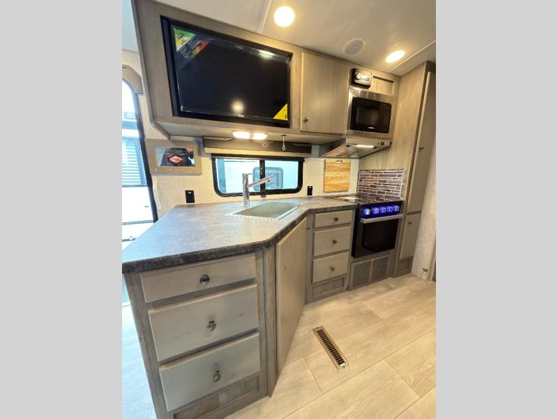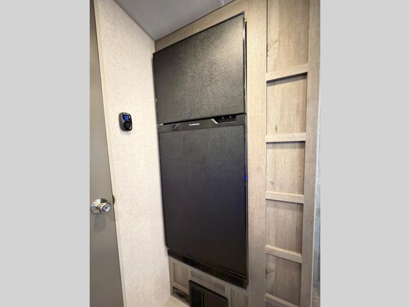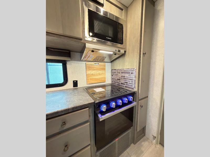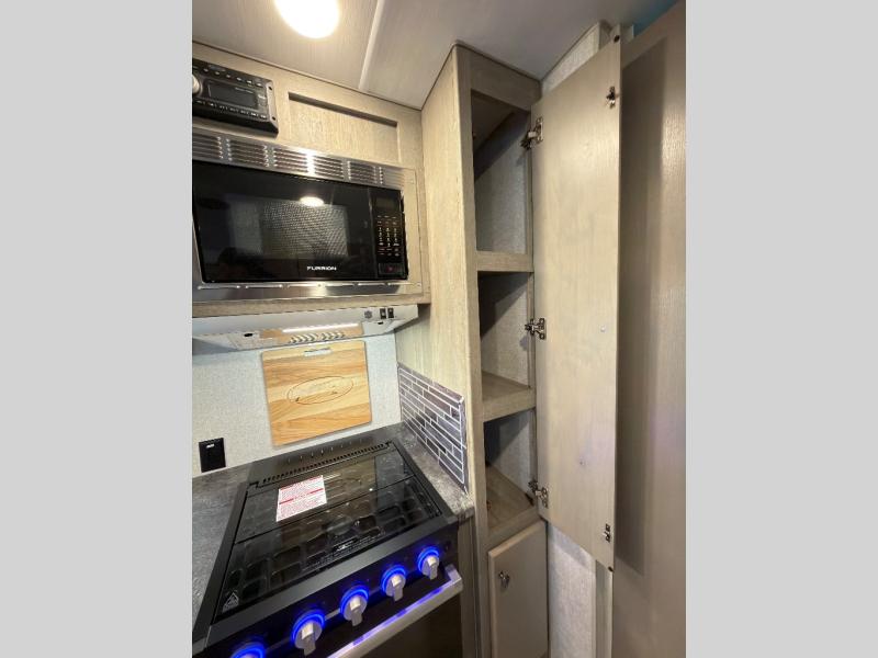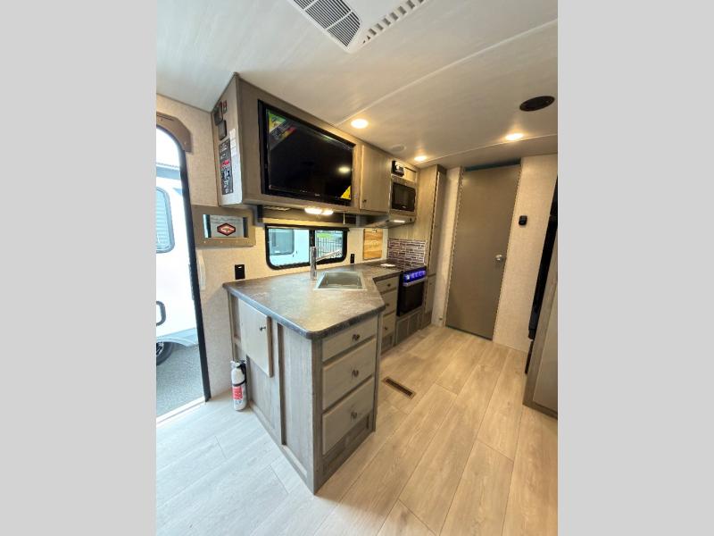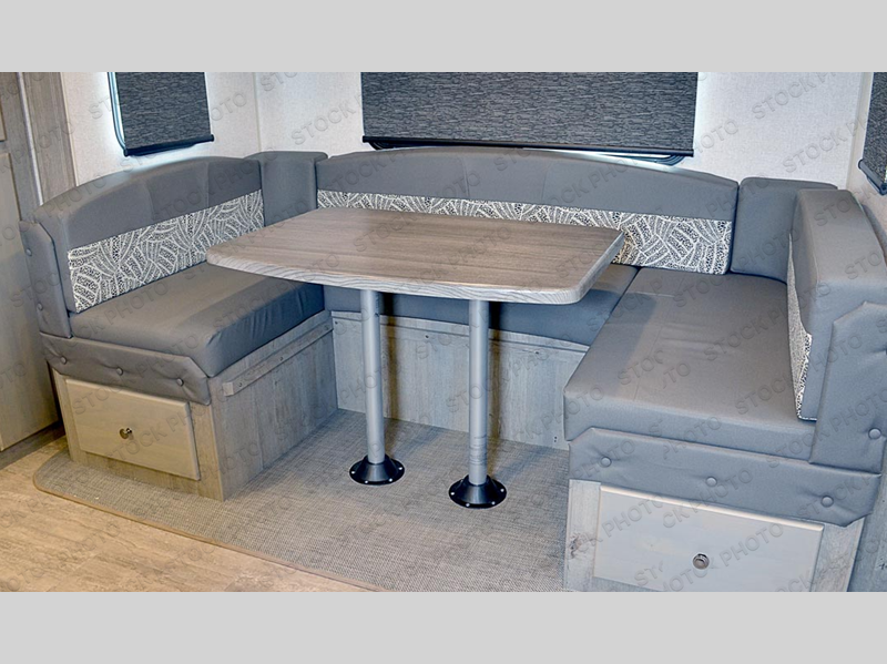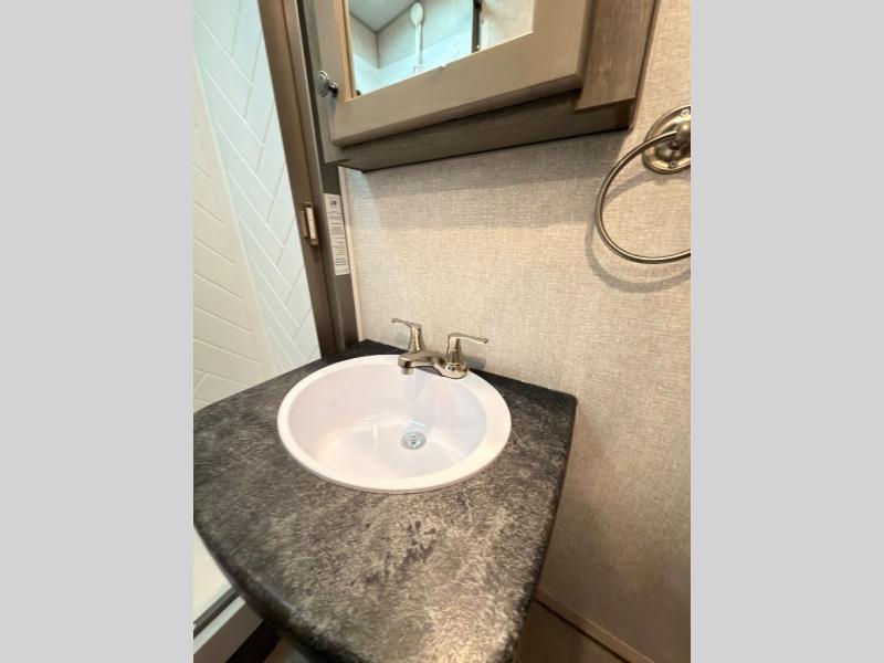 This is the perfect couple's trailer with space for an overnight guest or two on the U-shaped dinette slide. The kitchen also offers two pantries for dry goods and overhead storage for dishes and such as well as a 10 cu. ft. 12V refrigerator to store your cold items. Outside you will enjoy features like the 12V LED awning to protect you from the sun while you watch the kids play and the outdoor shower for them to rinse off before going inside.