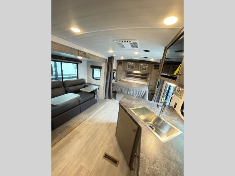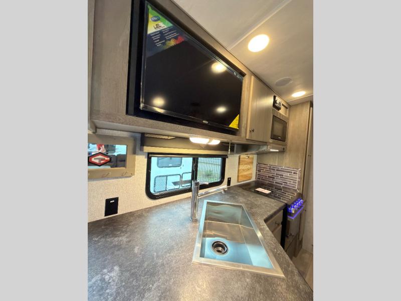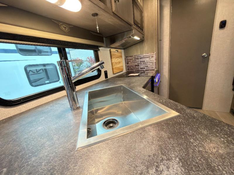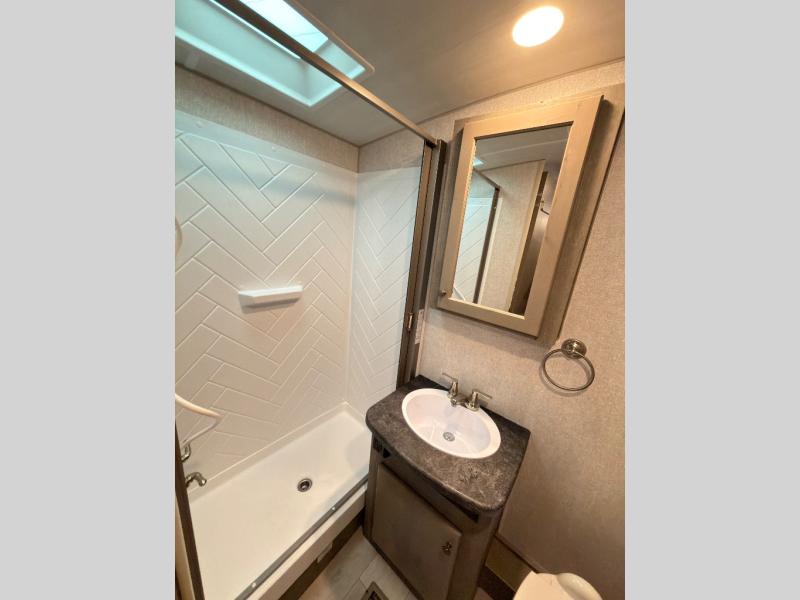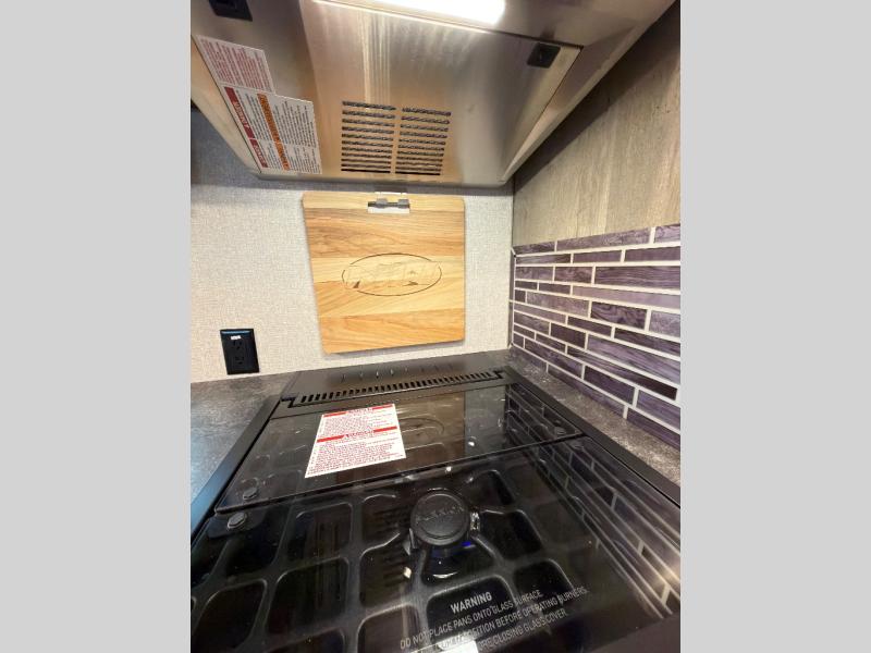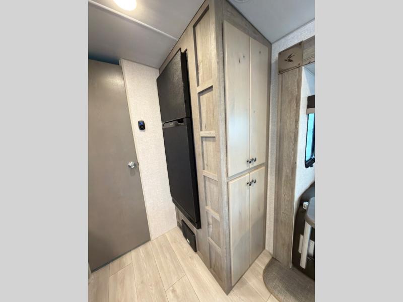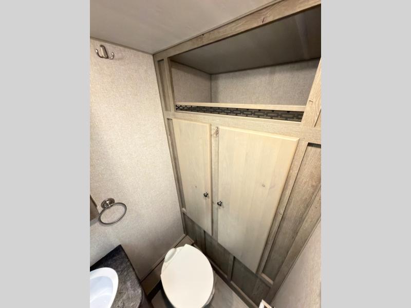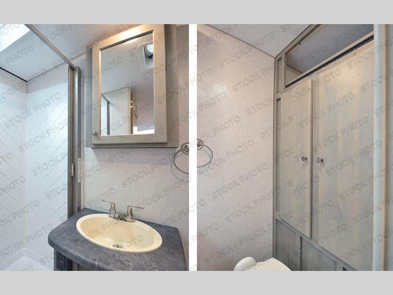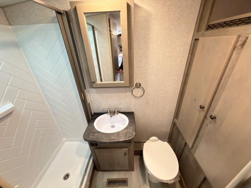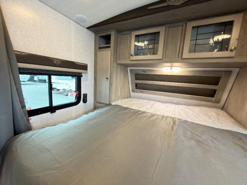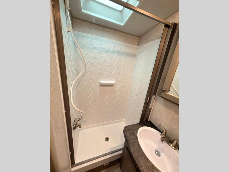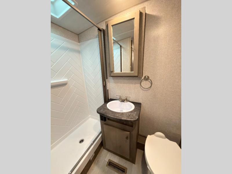 This is the perfect couple's trailer with space for an overnight guest or two on the U-shaped dinette slide. The kitchen also offers two pantries for dry goods and overhead storage for dishes and such as well as a 10 cu. ft. 12V refrigerator to store your cold items. Outside you will enjoy features like the 12V LED awning to protect you from the sun while you watch the kids play and the outdoor shower for them to rinse off before going inside.