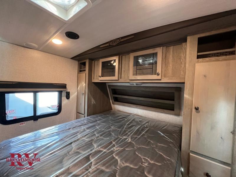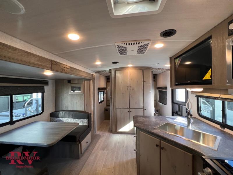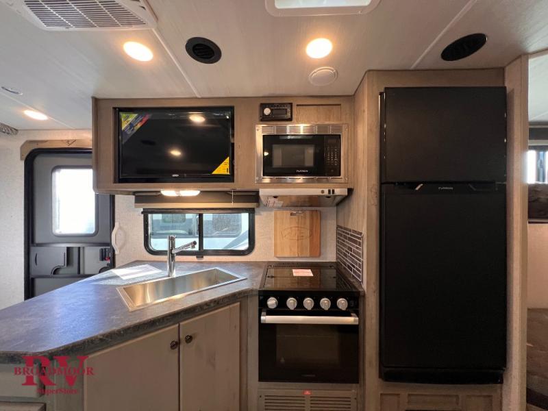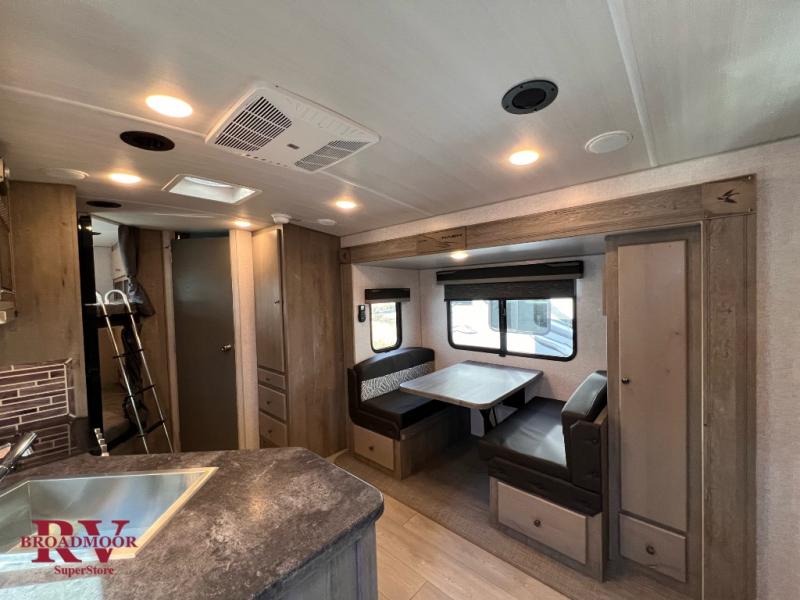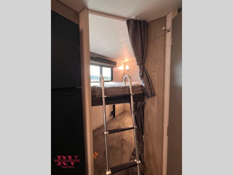 Camping at the state park just got easier in this spacious trailer that can sleep seven each night. The kids will claim the double-size bunks with a lower hinged bunk allowing storage underneath through the exterior Stor-Mor door. The booth dinette slide out is the perfect place for you to enjoy your meals at, as well as play a card game, and just outside the slide out there is an additional exterior storage area. When you're ready to wind down your night, you can either relax while enjoying the entertainment center or head into the front bedroom where you will find an RV queen bed with wardrobes on either side and overhead cabinets above, plus there are USB charging ports on both sides of the bed.