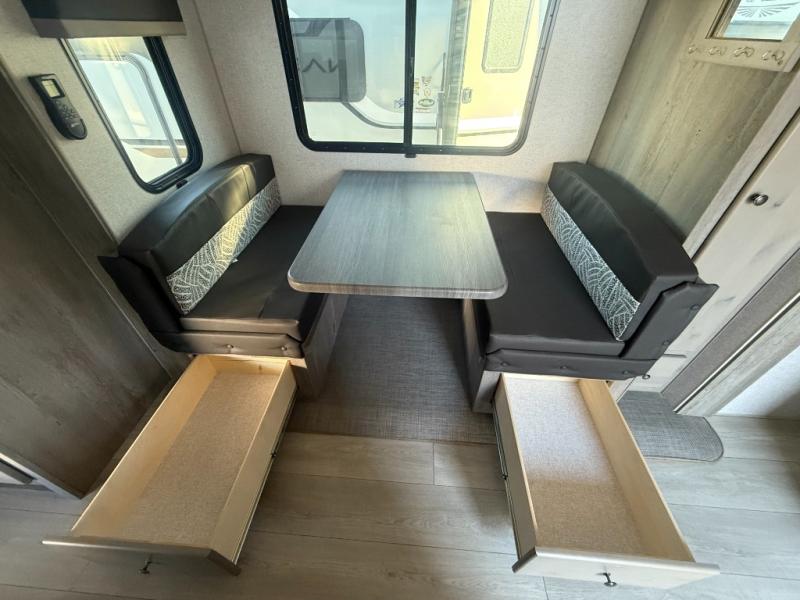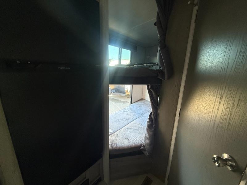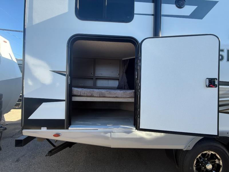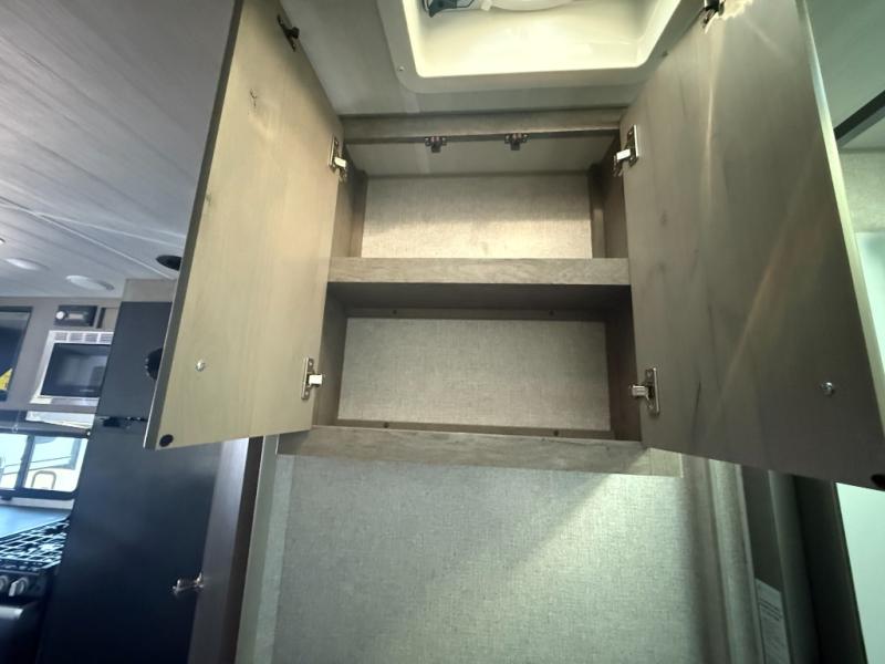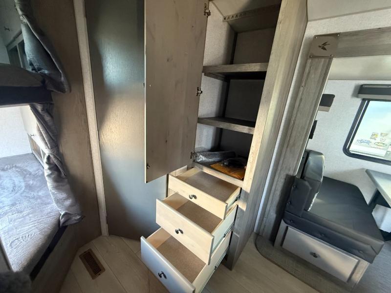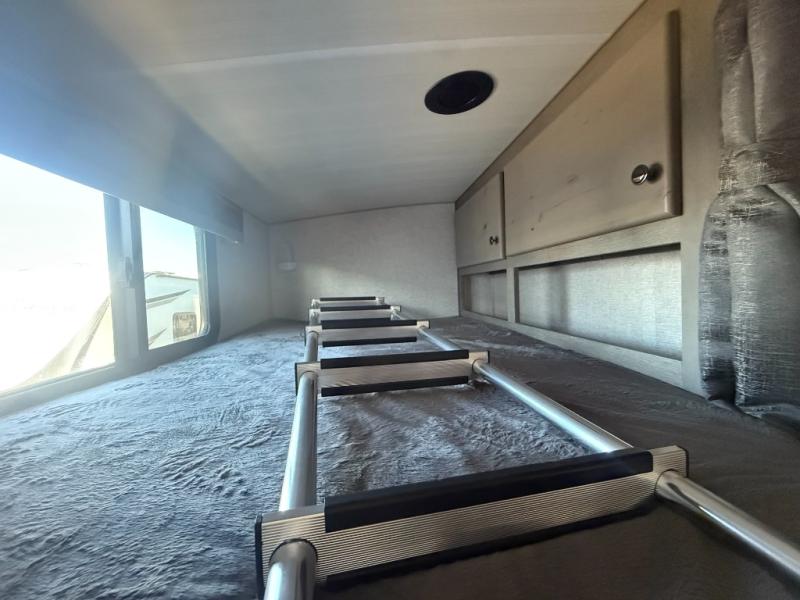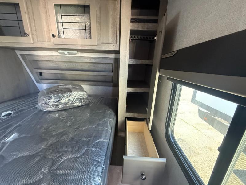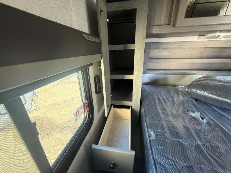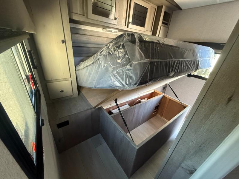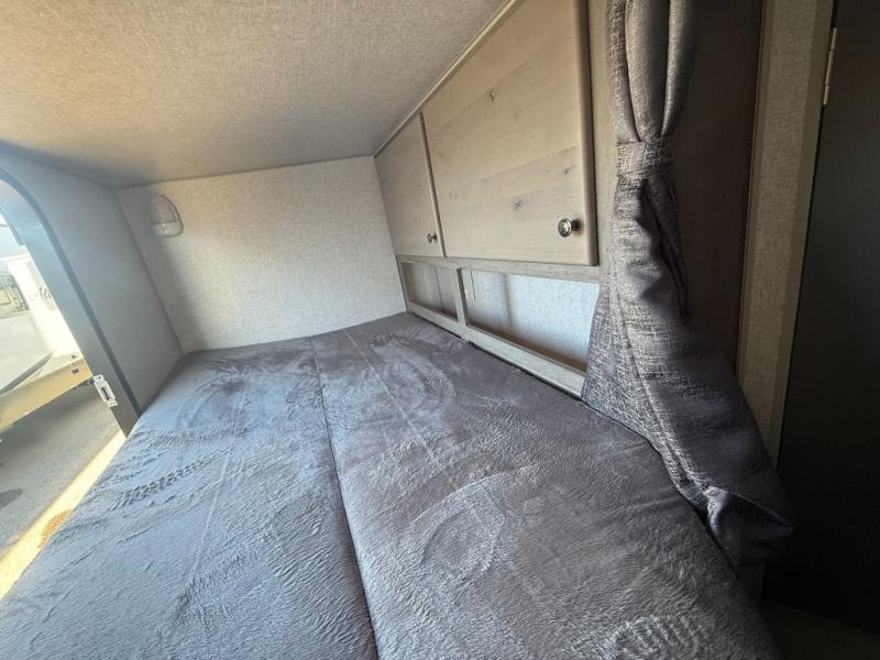 Camping at the state park just got easier in this spacious trailer that can sleep seven each night. The kids will claim the double-size bunks with a lower hinged bunk allowing storage underneath through the exterior Stor-Mor door. The booth dinette slide out is the perfect place for you to enjoy your meals at, as well as play a card game, and just outside the slide out there is an additional exterior storage area. When you're ready to wind down your night, you can either relax while enjoying the entertainment center or head into the front bedroom where you will find an RV queen bed with wardrobes on either side and overhead cabinets above, plus there are USB charging ports on both sides of the bed.