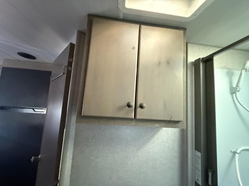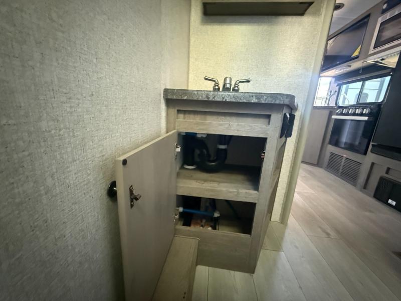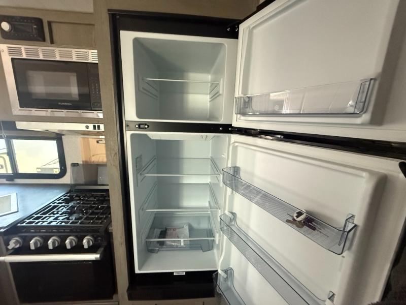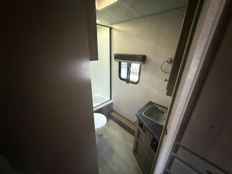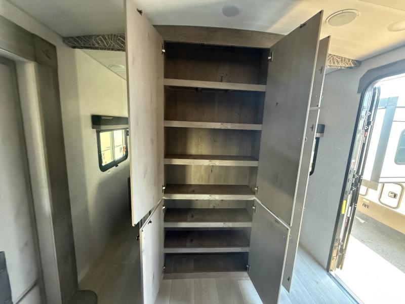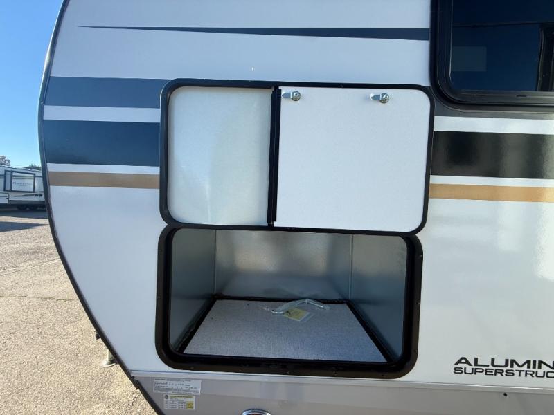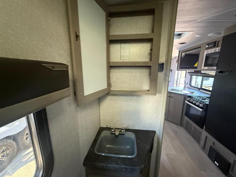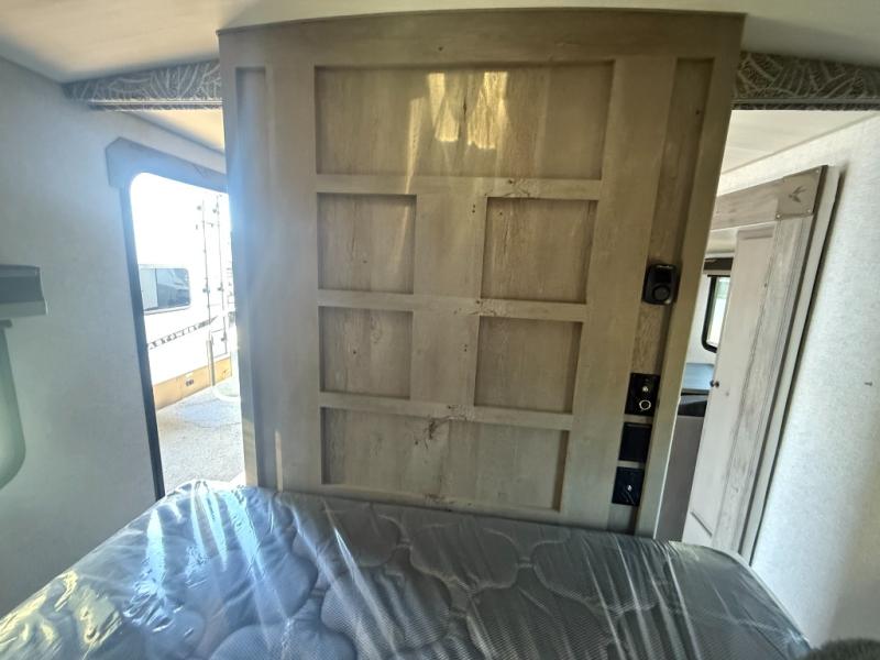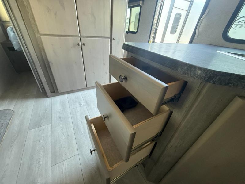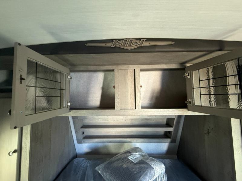 Camping at the state park just got easier in this spacious trailer that can sleep seven each night. The kids will claim the double-size bunks with a lower hinged bunk allowing storage underneath through the exterior Stor-Mor door. The booth dinette slide out is the perfect place for you to enjoy your meals at, as well as play a card game, and just outside the slide out there is an additional exterior storage area. When you're ready to wind down your night, you can either relax while enjoying the entertainment center or head into the front bedroom where you will find an RV queen bed with wardrobes on either side and overhead cabinets above, plus there are USB charging ports on both sides of the bed.