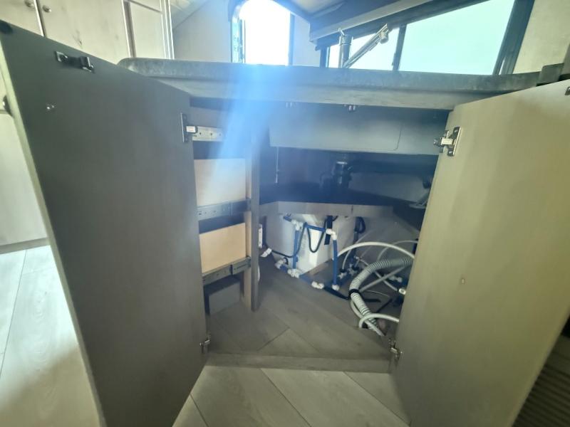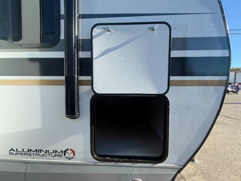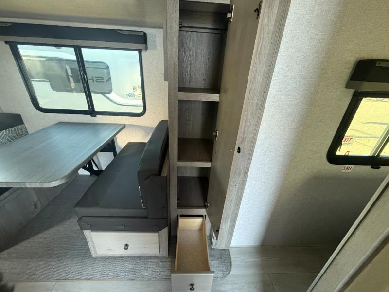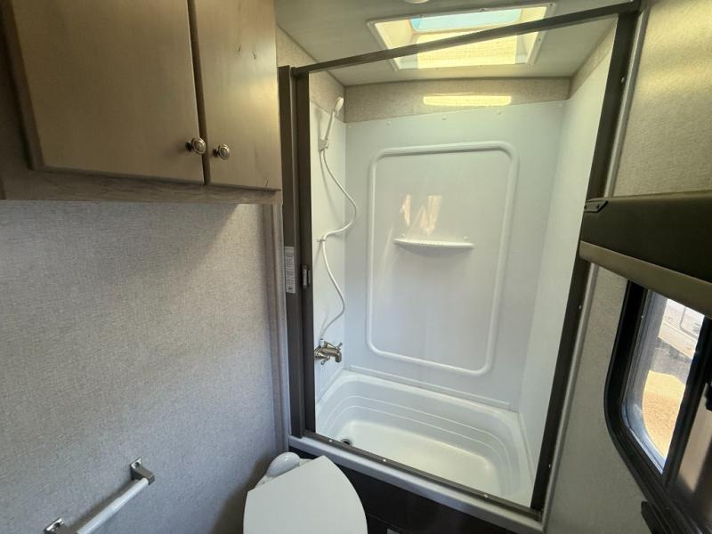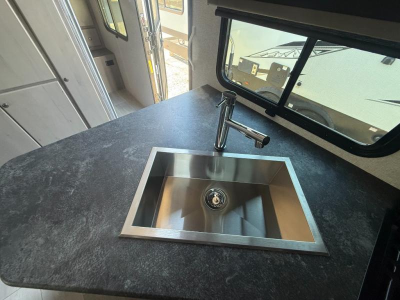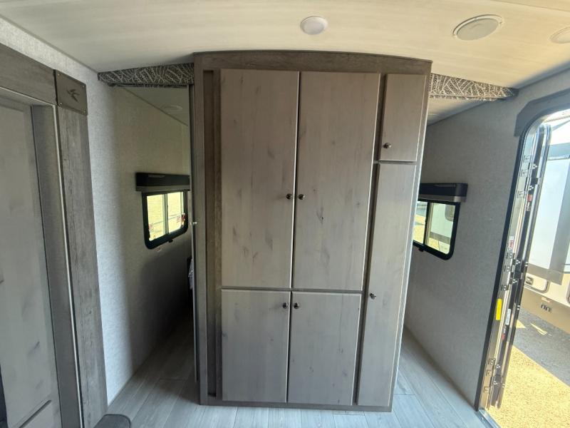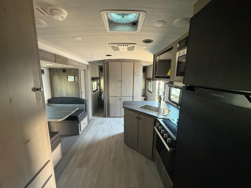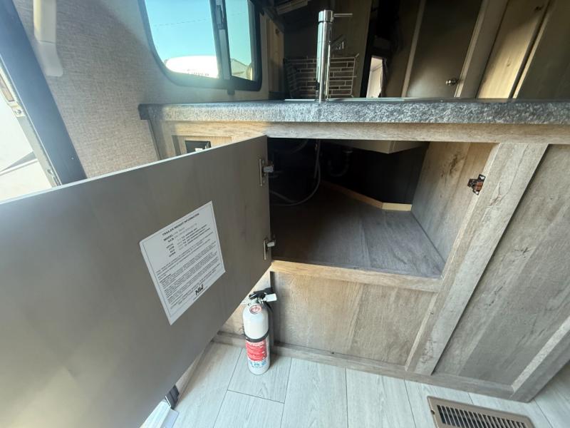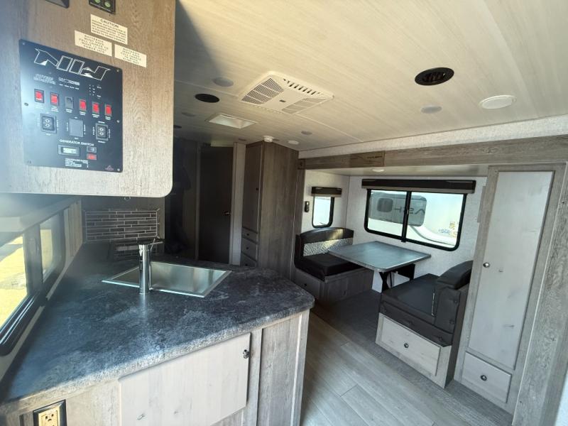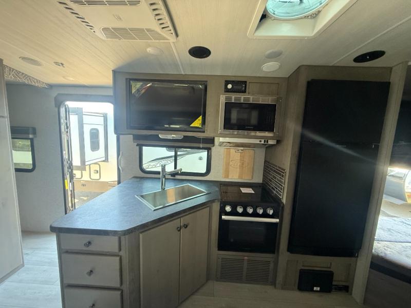 Camping at the state park just got easier in this spacious trailer that can sleep seven each night. The kids will claim the double-size bunks with a lower hinged bunk allowing storage underneath through the exterior Stor-Mor door. The booth dinette slide out is the perfect place for you to enjoy your meals at, as well as play a card game, and just outside the slide out there is an additional exterior storage area. When you're ready to wind down your night, you can either relax while enjoying the entertainment center or head into the front bedroom where you will find an RV queen bed with wardrobes on either side and overhead cabinets above, plus there are USB charging ports on both sides of the bed.