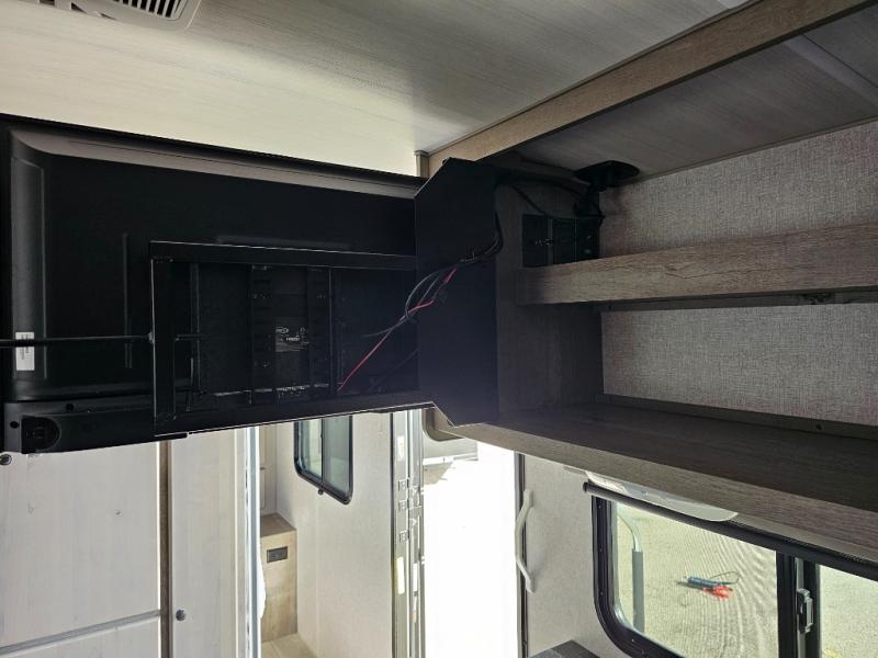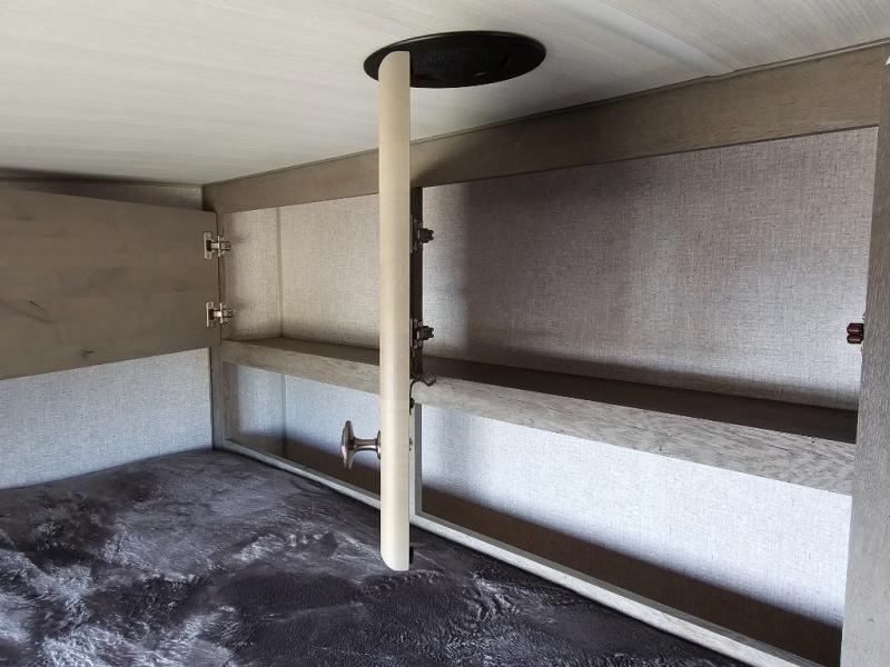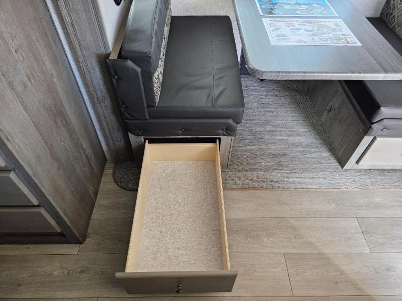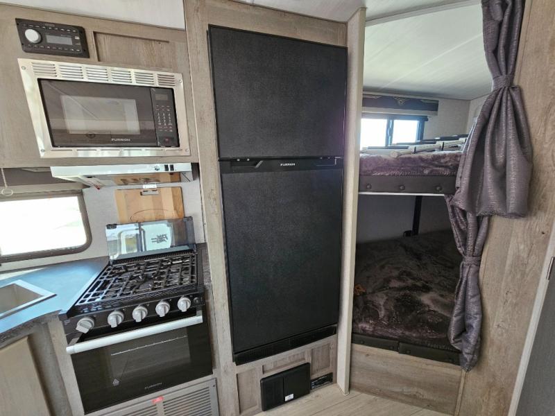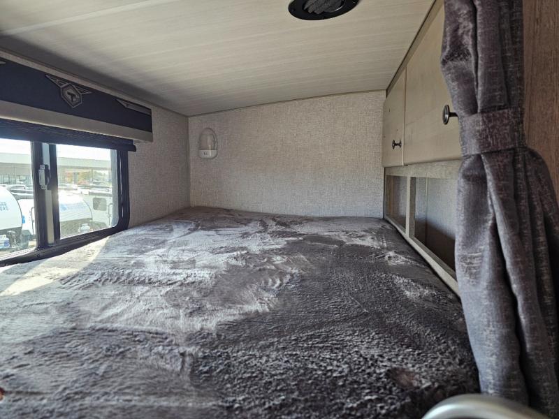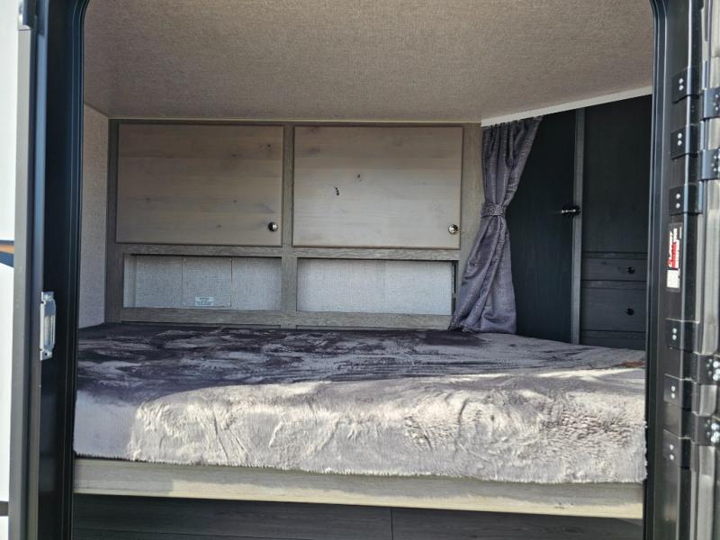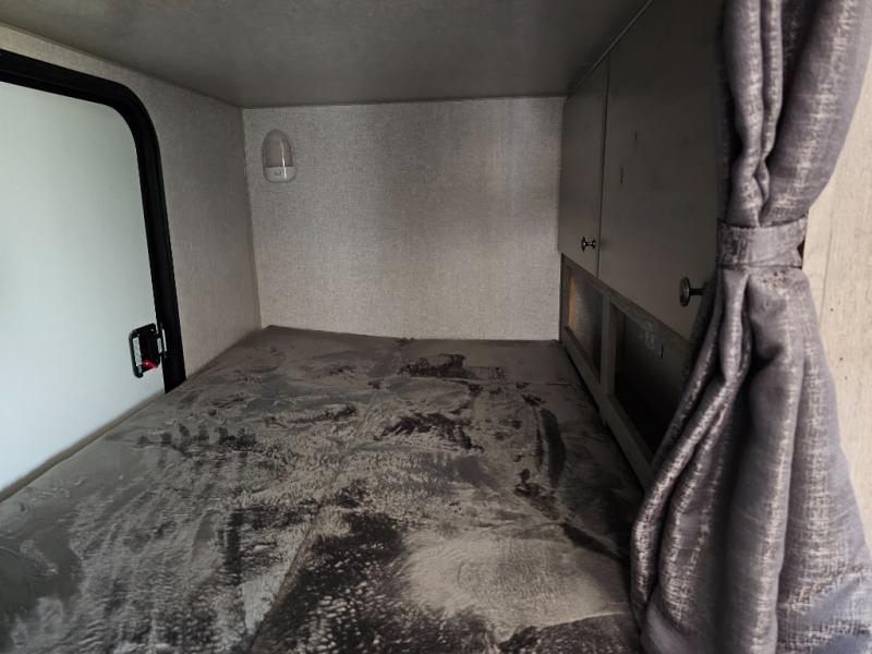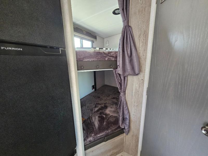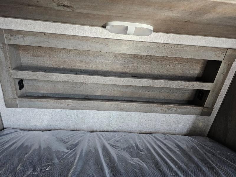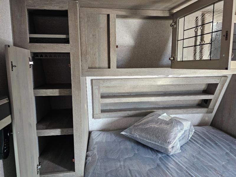 Camping at the state park just got easier in this spacious trailer that can sleep seven each night. The kids will claim the double-size bunks with a lower hinged bunk allowing storage underneath through the exterior Stor-Mor door. The booth dinette slide out is the perfect place for you to enjoy your meals at, as well as play a card game, and just outside the slide out there is an additional exterior storage area. When you're ready to wind down your night, you can either relax while enjoying the entertainment center or head into the front bedroom where you will find an RV queen bed with wardrobes on either side and overhead cabinets above, plus there are USB charging ports on both sides of the bed.