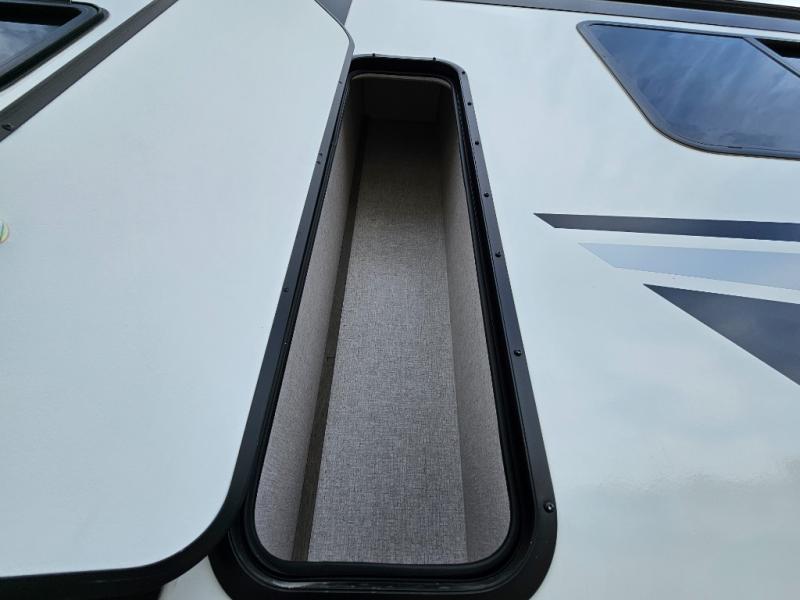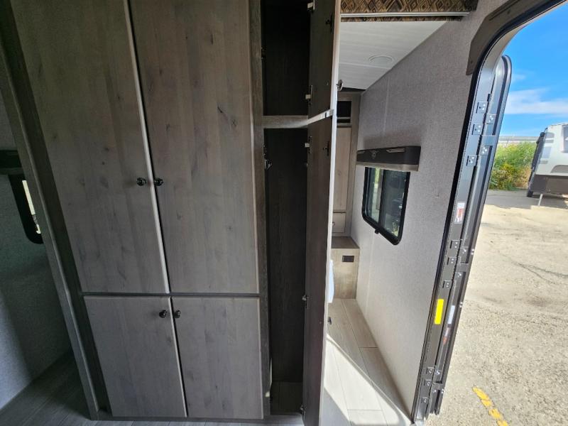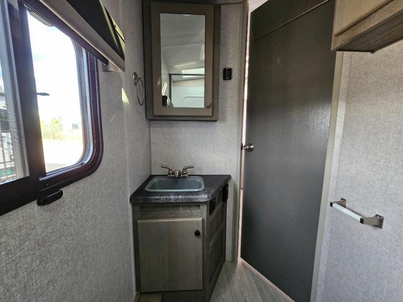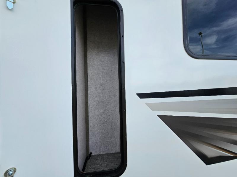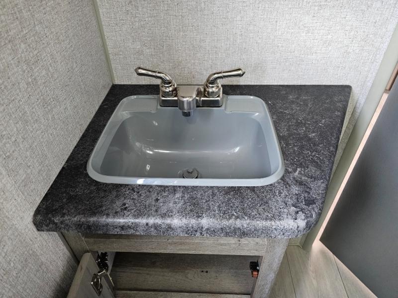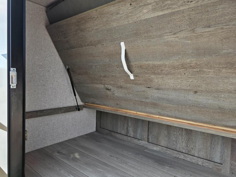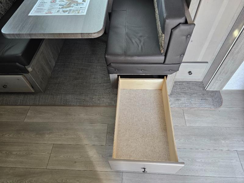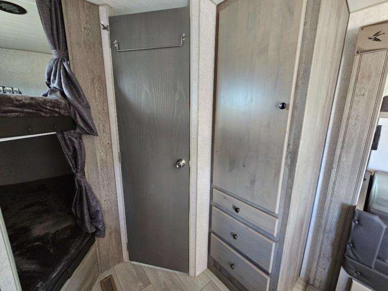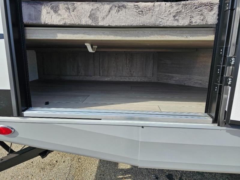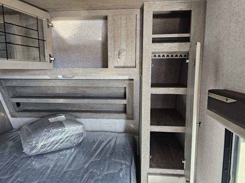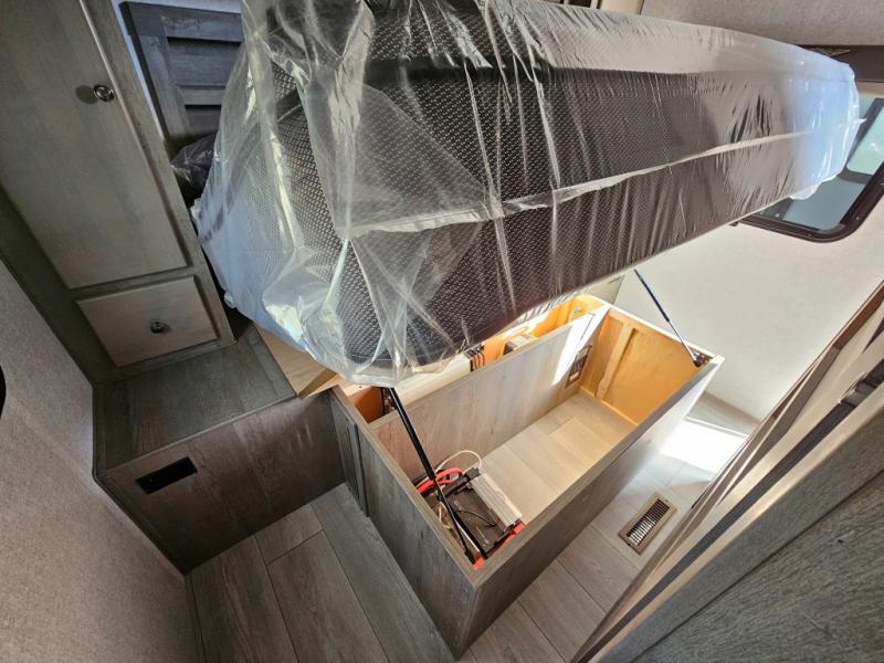 Camping at the state park just got easier in this spacious trailer that can sleep seven each night. The kids will claim the double-size bunks with a lower hinged bunk allowing storage underneath through the exterior Stor-Mor door. The booth dinette slide out is the perfect place for you to enjoy your meals at, as well as play a card game, and just outside the slide out there is an additional exterior storage area. When you're ready to wind down your night, you can either relax while enjoying the entertainment center or head into the front bedroom where you will find an RV queen bed with wardrobes on either side and overhead cabinets above, plus there are USB charging ports on both sides of the bed.