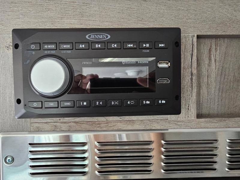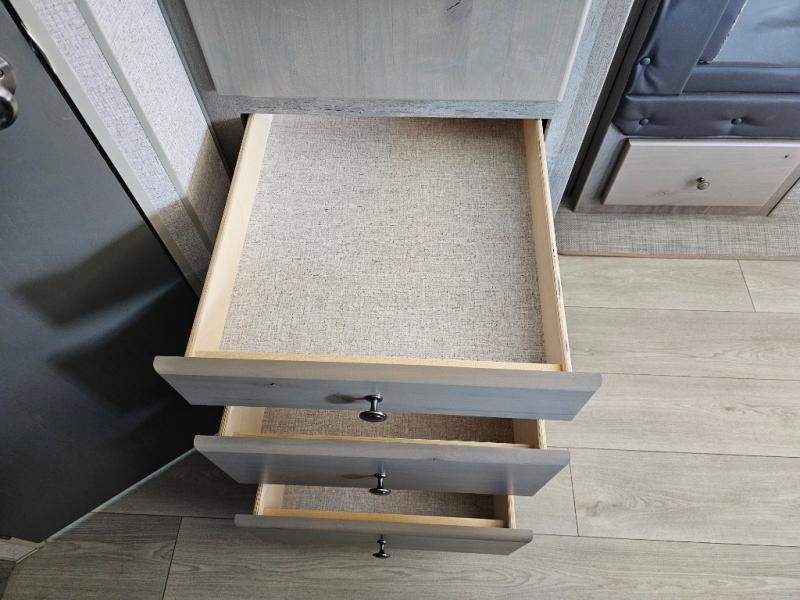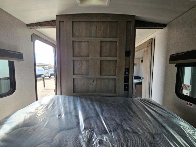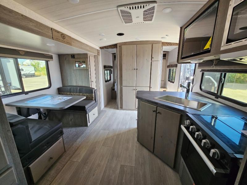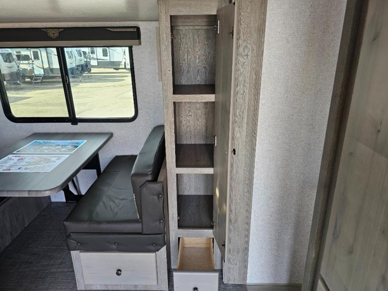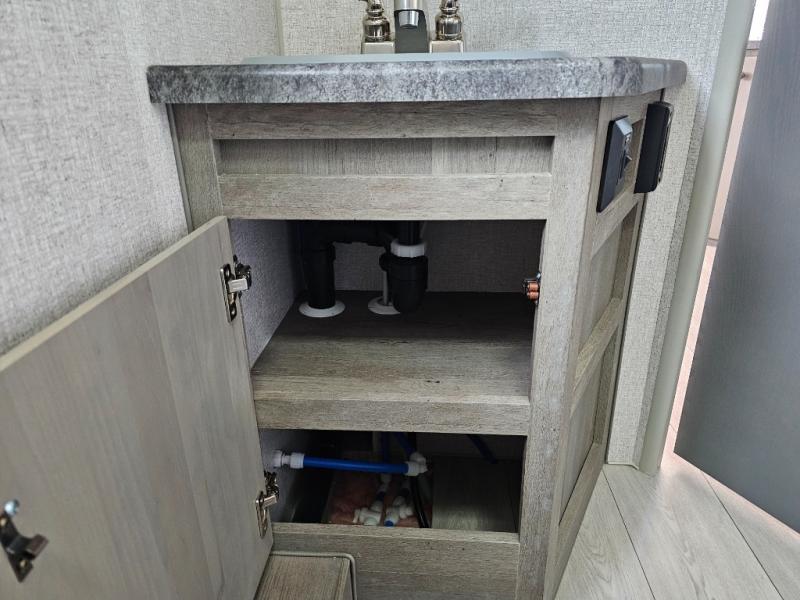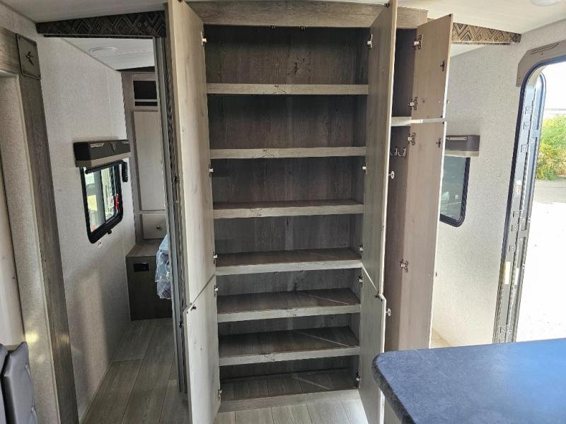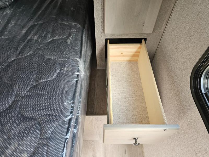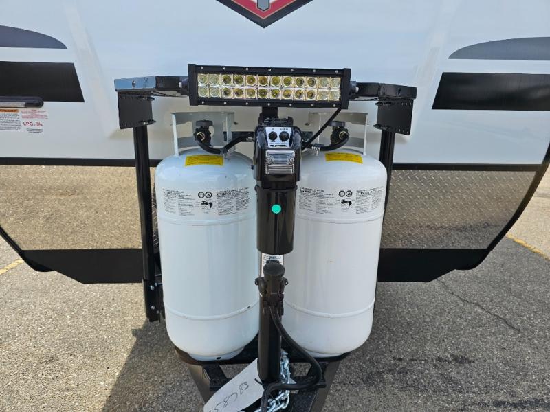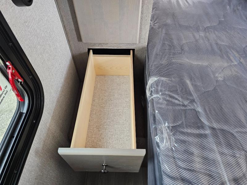 Camping at the state park just got easier in this spacious trailer that can sleep seven each night. The kids will claim the double-size bunks with a lower hinged bunk allowing storage underneath through the exterior Stor-Mor door. The booth dinette slide out is the perfect place for you to enjoy your meals at, as well as play a card game, and just outside the slide out there is an additional exterior storage area. When you're ready to wind down your night, you can either relax while enjoying the entertainment center or head into the front bedroom where you will find an RV queen bed with wardrobes on either side and overhead cabinets above, plus there are USB charging ports on both sides of the bed.