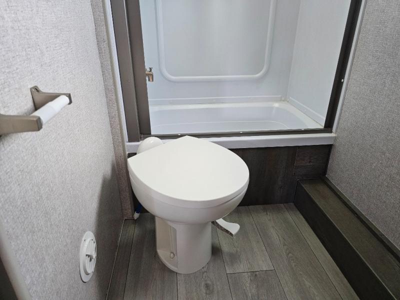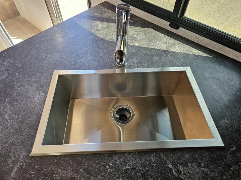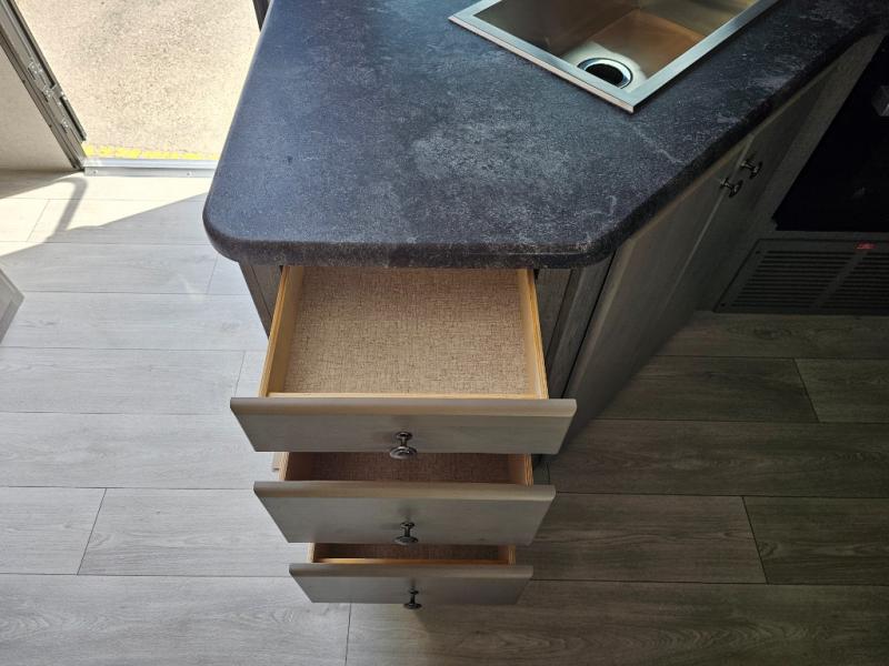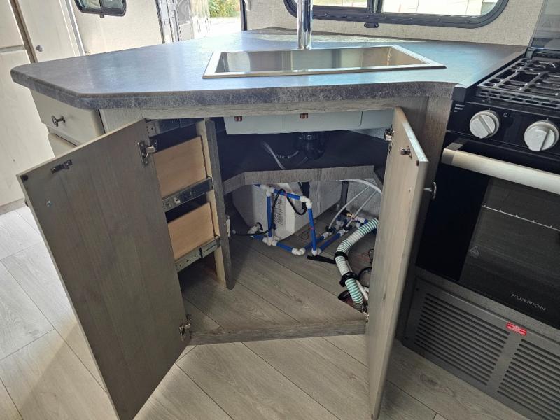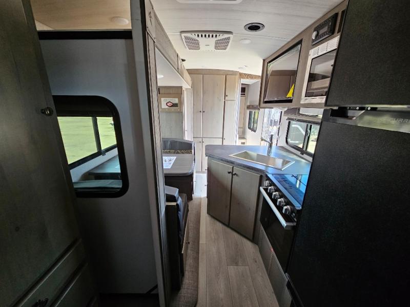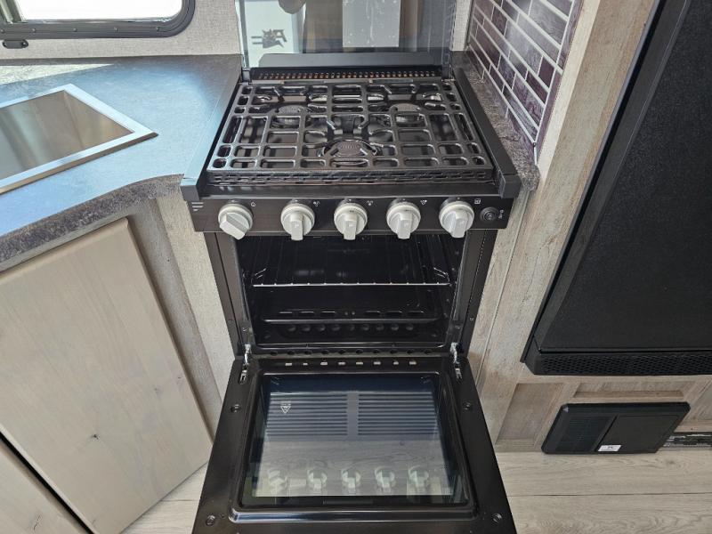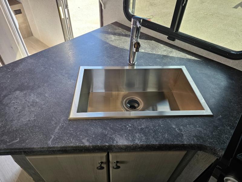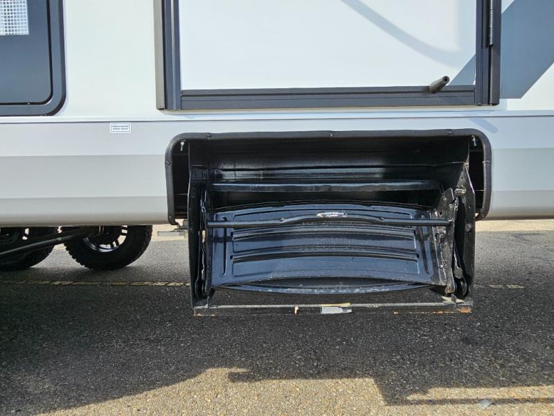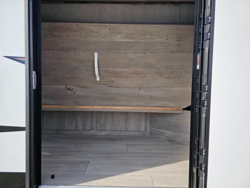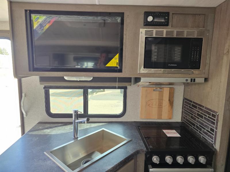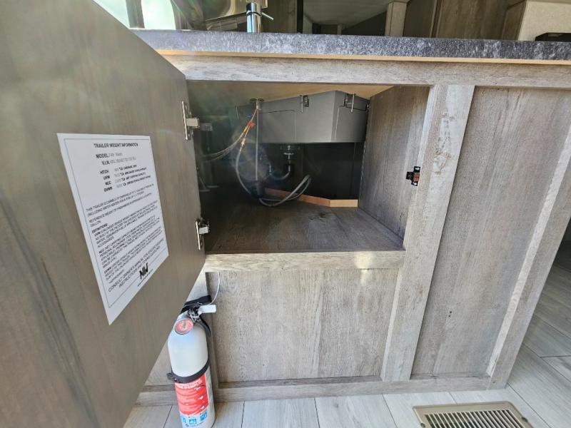 Camping at the state park just got easier in this spacious trailer that can sleep seven each night. The kids will claim the double-size bunks with a lower hinged bunk allowing storage underneath through the exterior Stor-Mor door. The booth dinette slide out is the perfect place for you to enjoy your meals at, as well as play a card game, and just outside the slide out there is an additional exterior storage area. When you're ready to wind down your night, you can either relax while enjoying the entertainment center or head into the front bedroom where you will find an RV queen bed with wardrobes on either side and overhead cabinets above, plus there are USB charging ports on both sides of the bed.