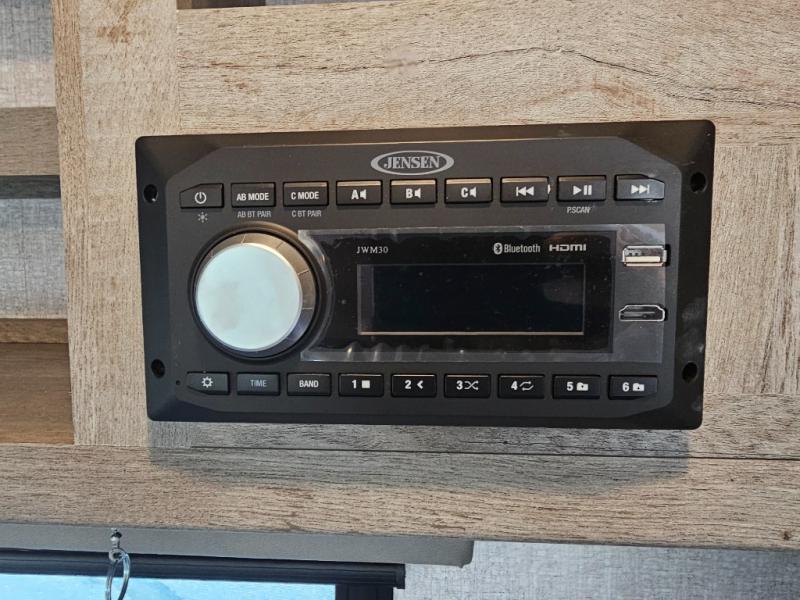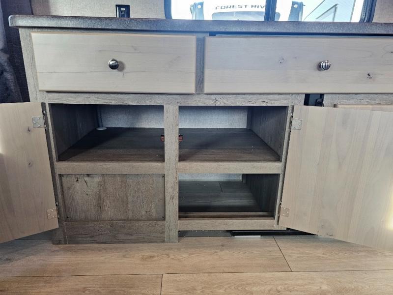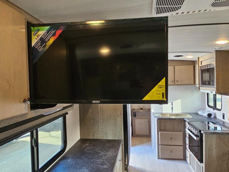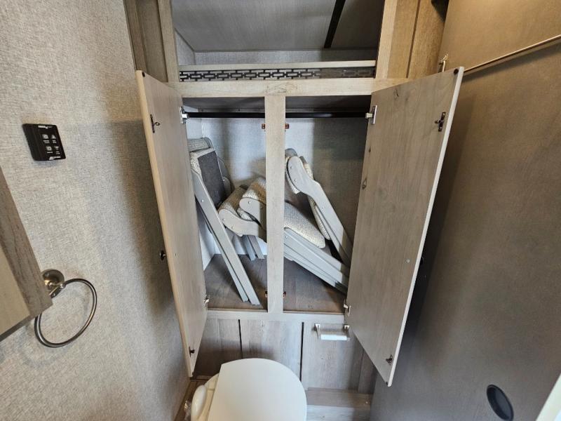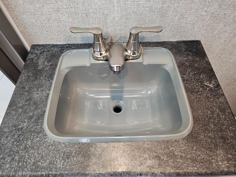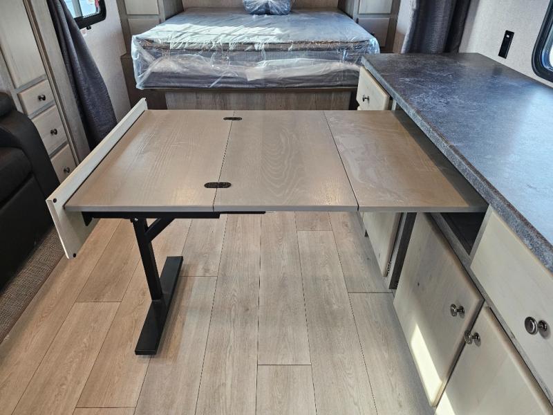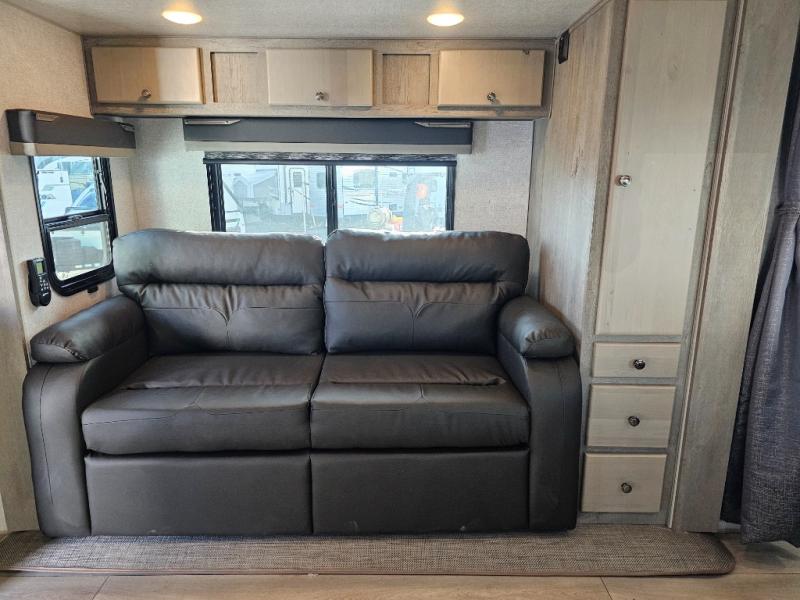 Weekend trips to the campground are made complete in this spacious travel trailer that can sleep four each night. You'll have the front RV queen bed to yourselves, along with dual bedside wardrobes for your things. If you have any guests, they can sleep on the tri-fold sofa within the slide out, and there is an additional wardrobe here as well. The Slide & Dine table with folding dinette chairs provides a place to dine together each day, or you can choose the optional booth dinette that will convert to additional sleeping space. The full kitchen will let you make meals each day and the full rear bath is sure to come in handy when you need to freshen up after hiking!