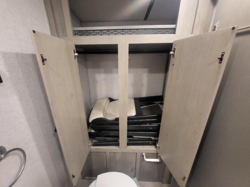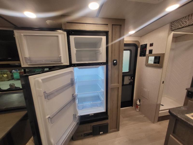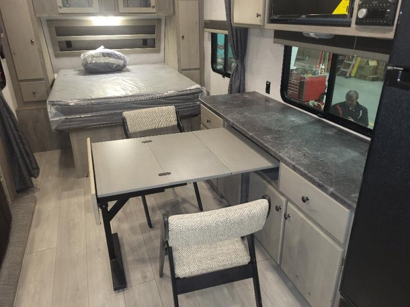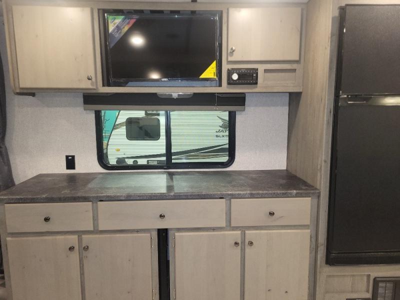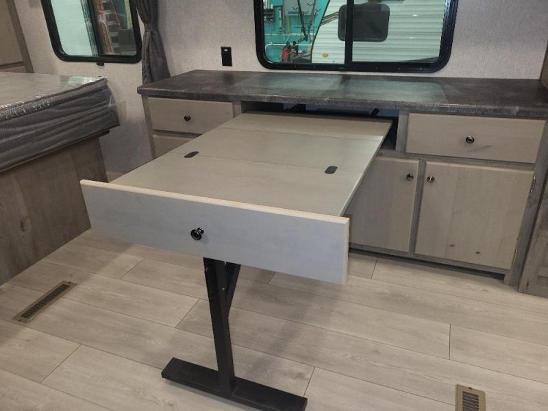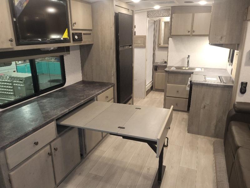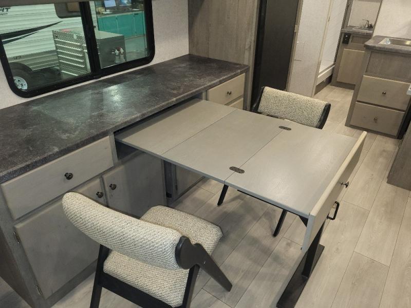Weekend trips to the campground are made complete in this spacious travel trailer that can sleep four each night. You'll have the front RV queen bed to yourselves, along with dual bedside wardrobes for your things. If you have any guests, they can sleep on the tri-fold sofa within the slide out, and there is an additional wardrobe here as well. The Slide & Dine table with folding dinette chairs provides a place to dine together each day, or you can choose the optional booth dinette that will convert to additional sleeping space. The full kitchen will let you make meals each day and the full rear bath is sure to come in handy when you need to freshen up after hiking!