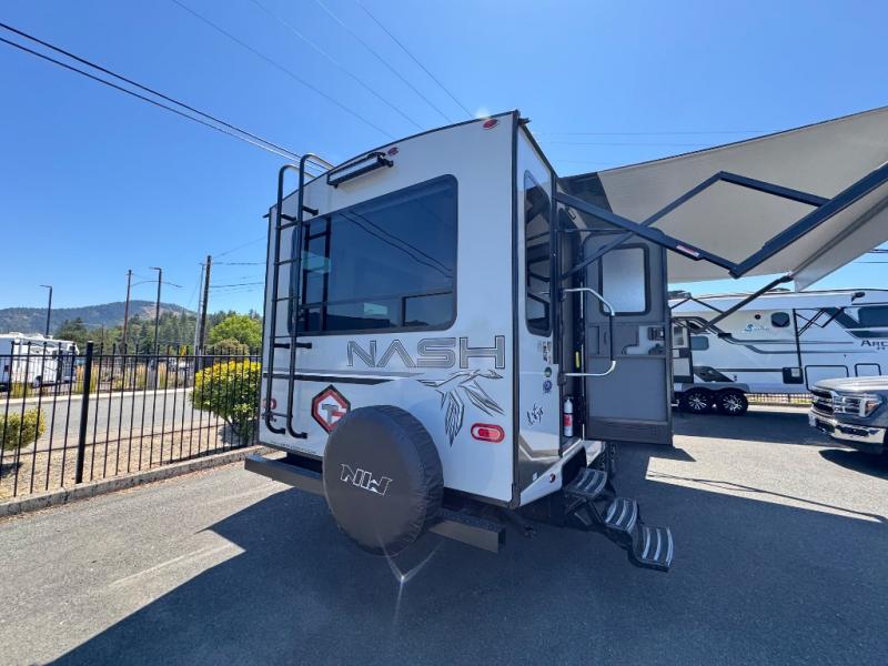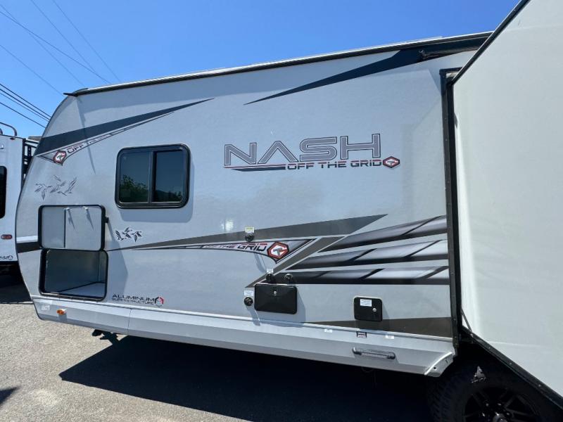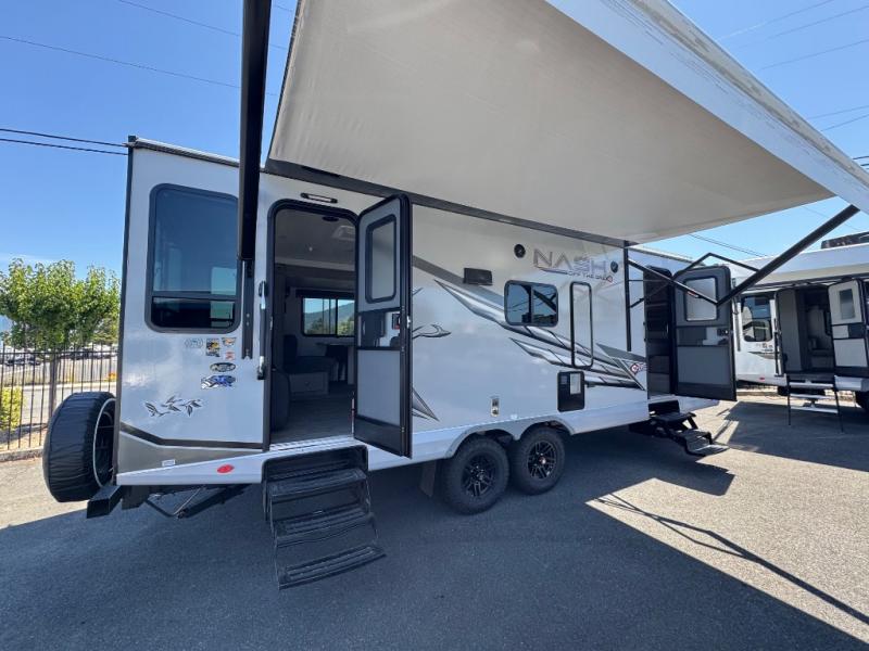You will enjoy camping in any season with this Nash travel trailer that features a single slide for added interior space. A cathedral ceiling will make it feel even larger when spending time inside. The jackknife sofa adds extra sleeping for family members and/or friends, plus the booth dinette in the slide can easily convert to a 40" x 74" sleeping area for two children or an adult. Since there are dual entry doors, you can enter in through the front master bedroom with an RV queen bed, or the rear living area.