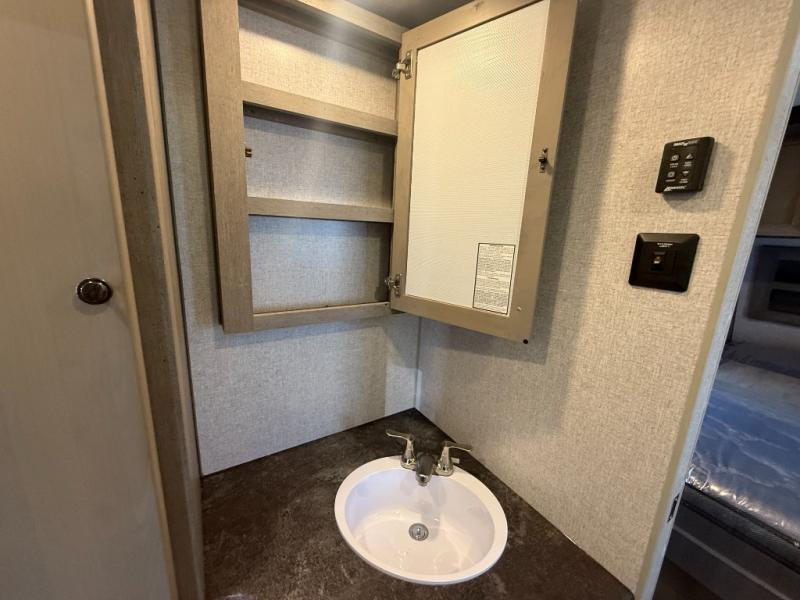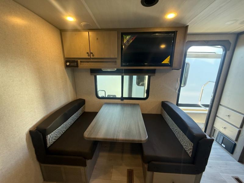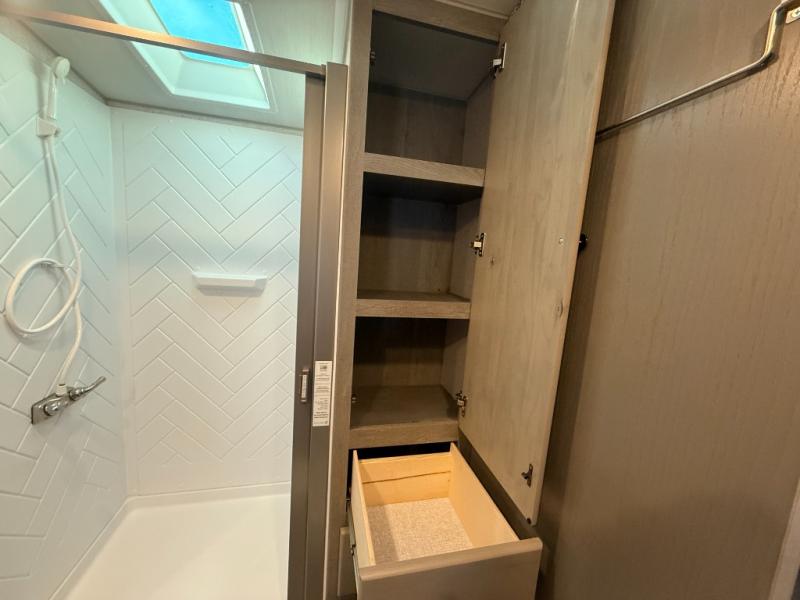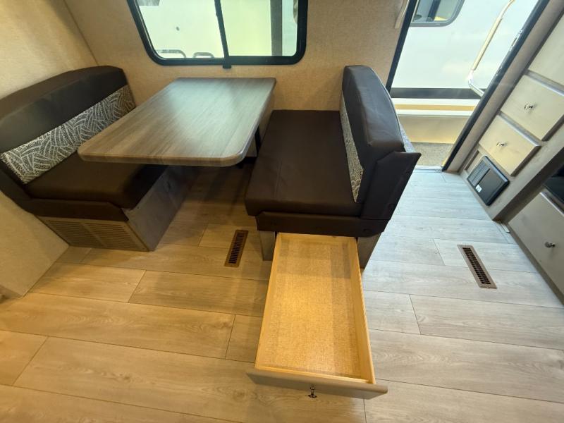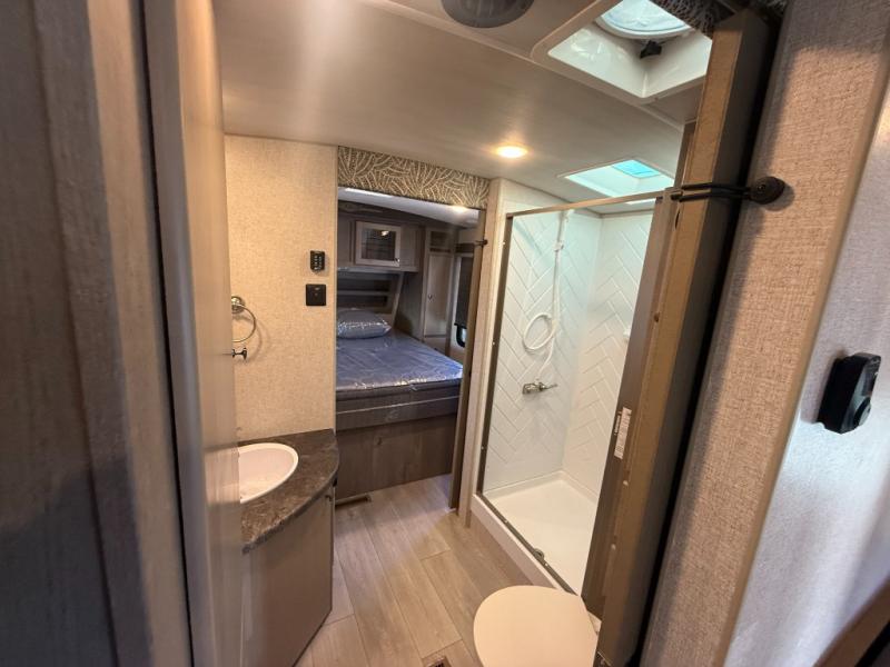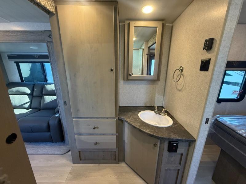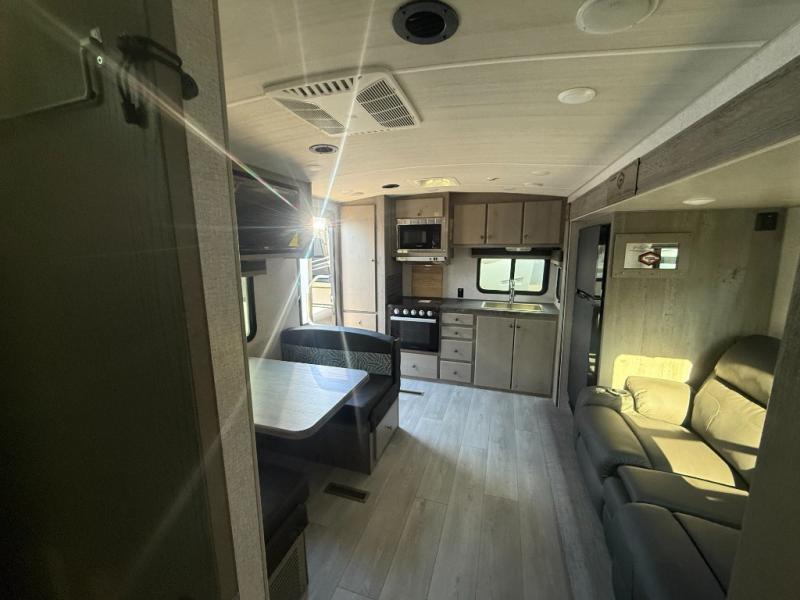Camping trips in this travel trailer are sure to bring great memories! There are dual entry doors that allow you to enter in through the rear kitchen or the front master bedroom. Your crew can get comfy on the 68" theater seating, play a game at the booth dinette, or visit outdoors under the 15' 12V LED awning! The spacious walk-through bath includes two linen closets plus additional storage to keep bath necessities and clean towels close by, and you'll love having the front master bedroom all to yourselves!