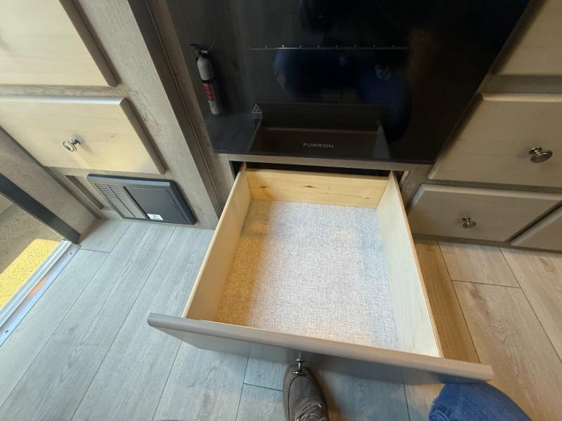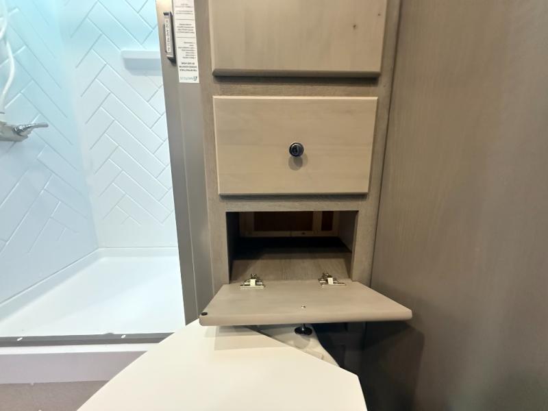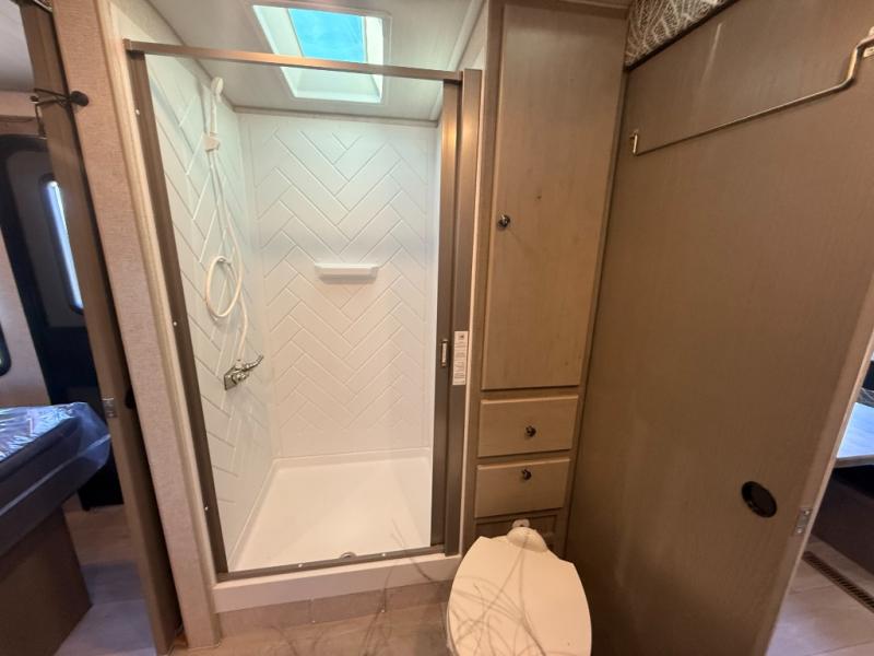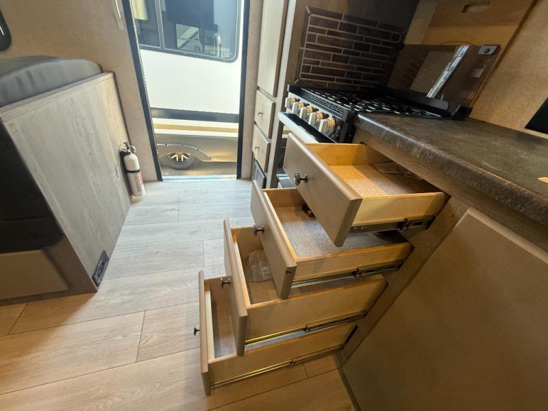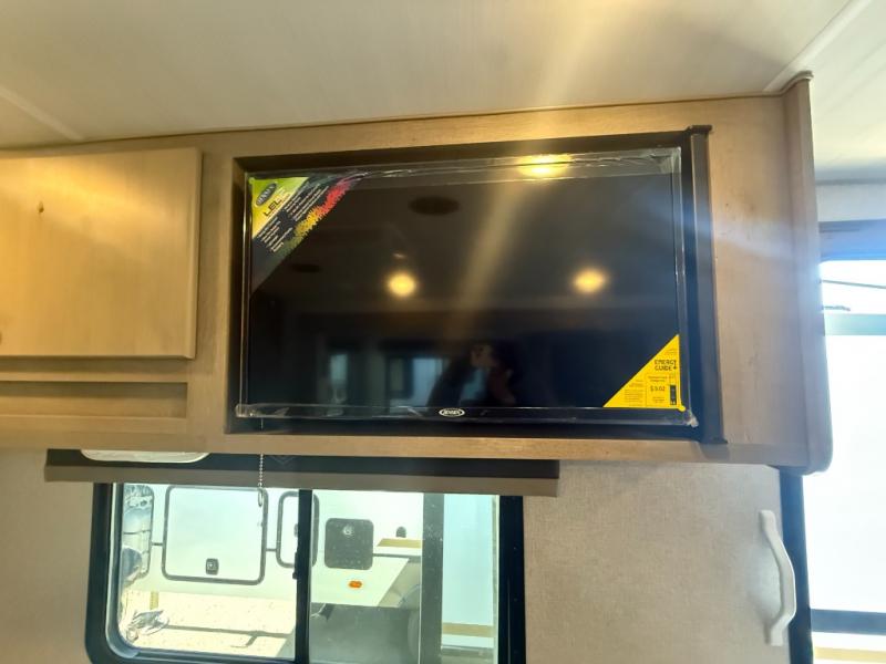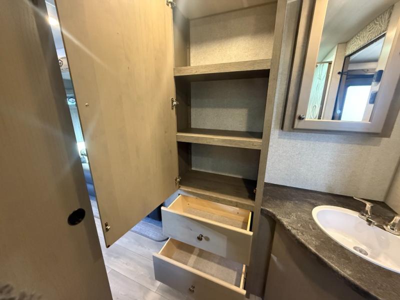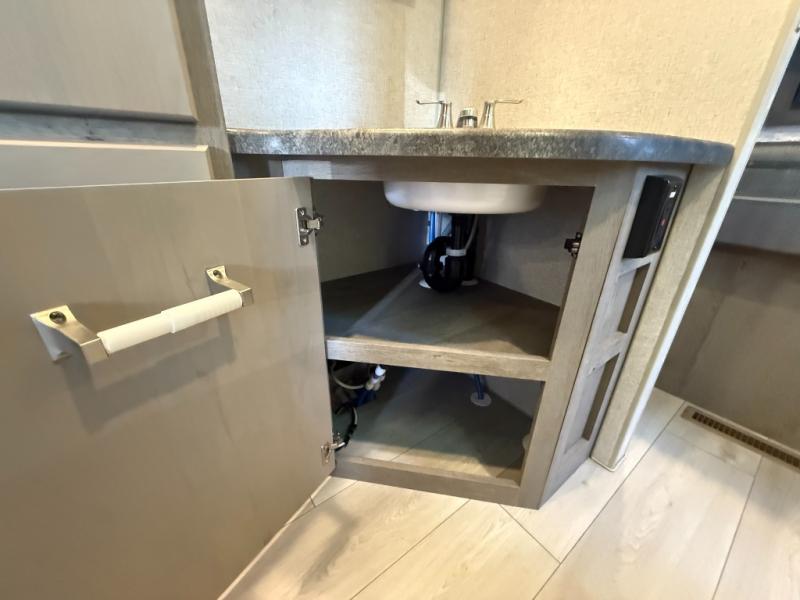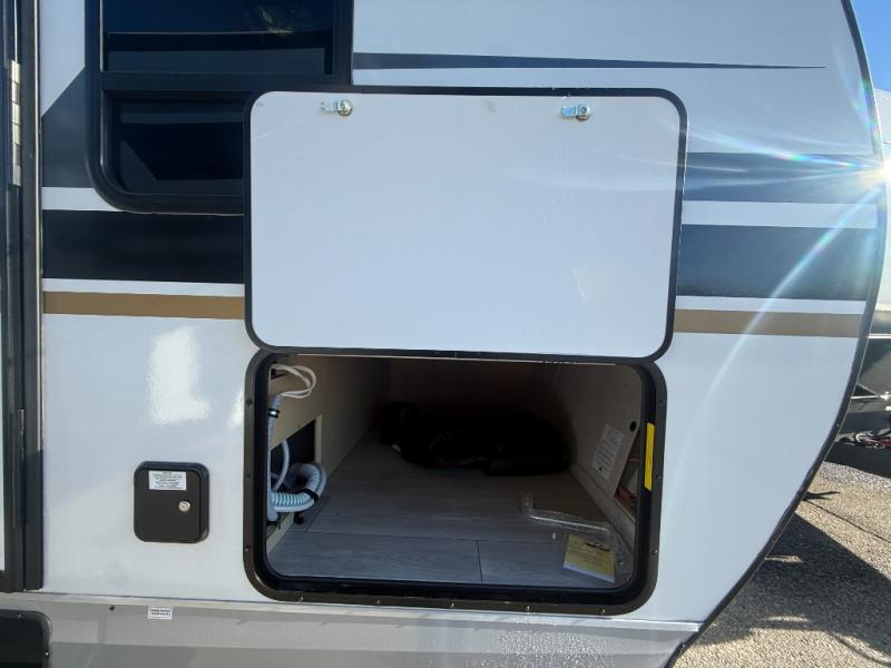 Camping trips in this travel trailer are sure to bring great memories! There are dual entry doors that allow you to enter in through the rear kitchen or the front master bedroom. Your crew can get comfy on the 68" theater seating, play a game at the booth dinette, or visit outdoors under the 15' 12V LED awning! The spacious walk-through bath includes two linen closets plus additional storage to keep bath necessities and clean towels close by, and you'll love having the front master bedroom all to yourselves!