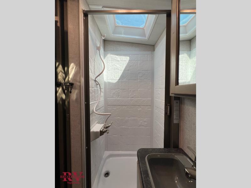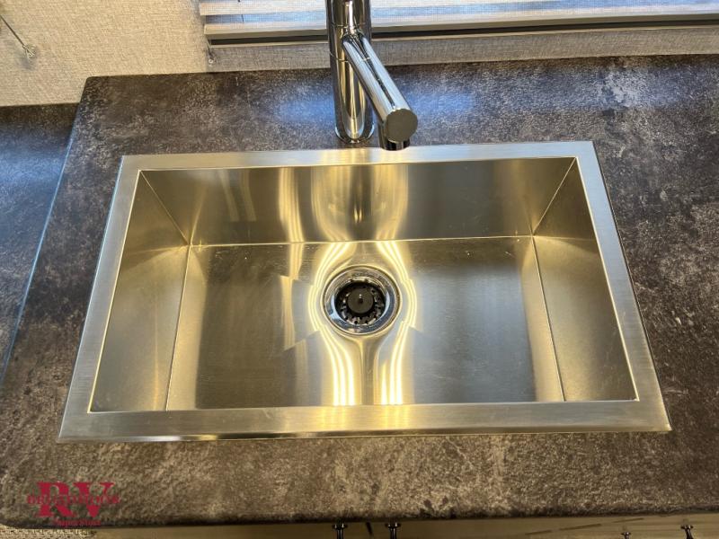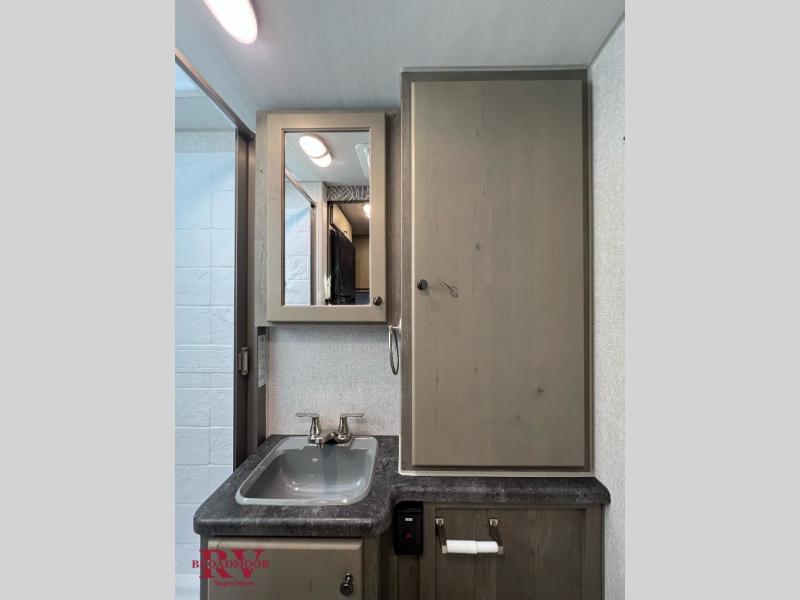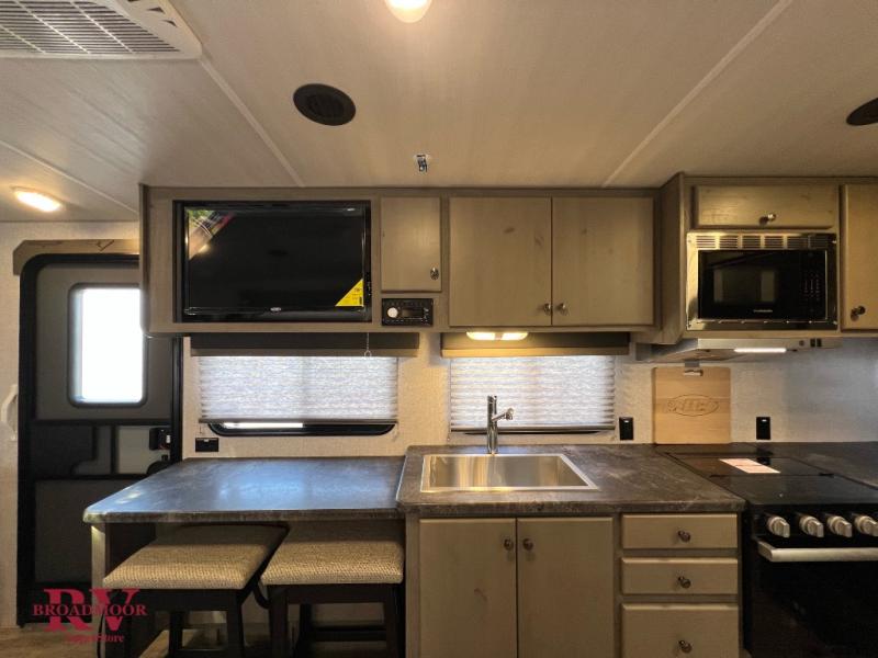 This is the perfect couple's trailer for all your adventures! You can wake up on the queen bed feeling refreshed each morning, and the wardrobe by the foot of the bed will keep your clothes organized. There is a theater seating slide out for more floor space and a place to relax each day, and the dining bar with bar stools gives you a place to enjoy meals together. And don't overlook the full bath with a shower skylight, a foot-flush toilet, and a linen closet for clean towels!