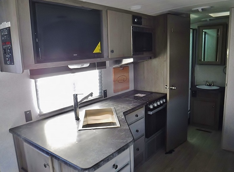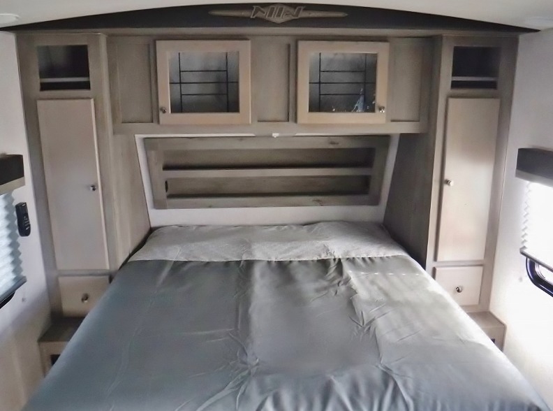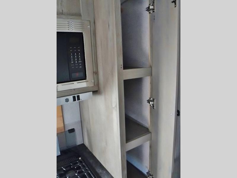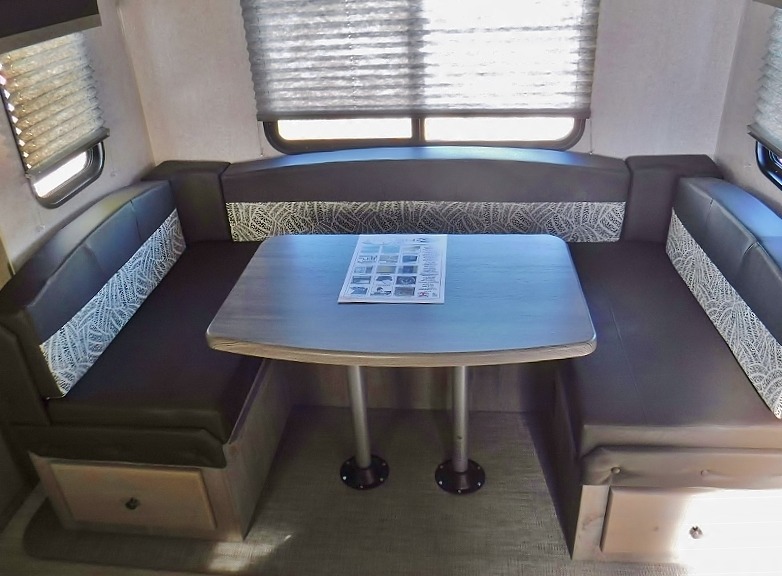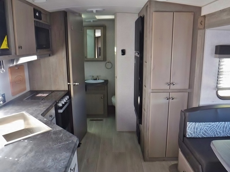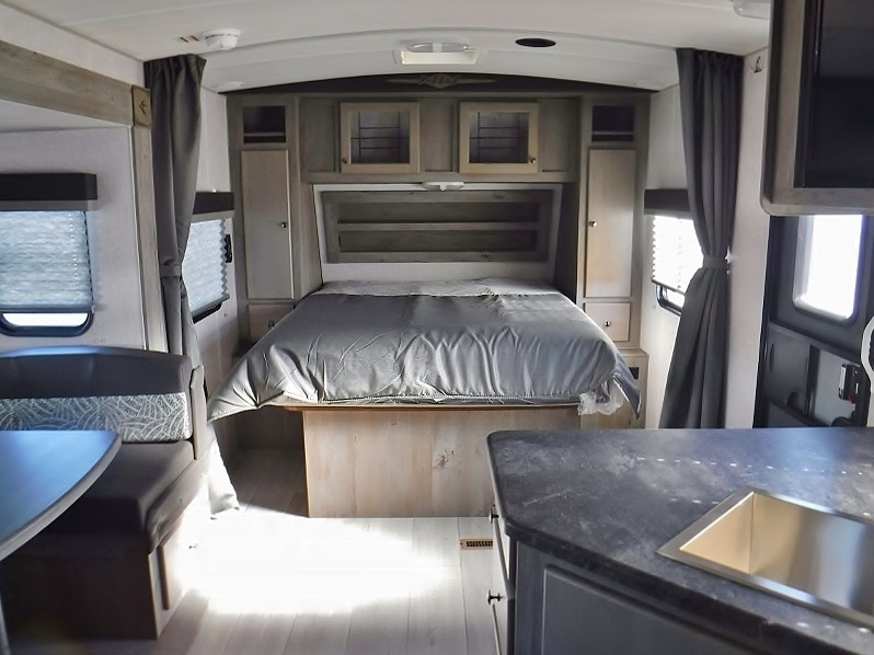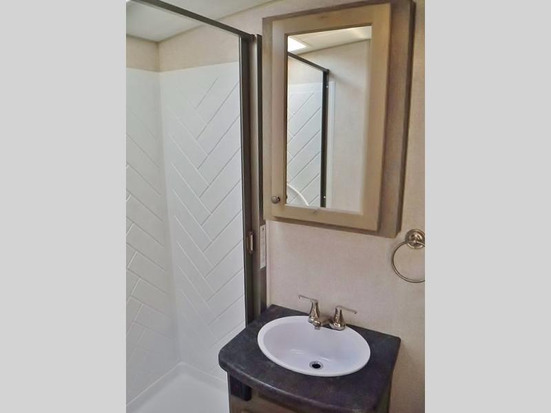 This is the perfect couple's trailer with space for an overnight guest or two on the U-shaped dinette slide. The kitchen also offers two pantries for dry goods and overhead storage for dishes and such as well as a 10 cu. ft. 12V refrigerator to store your cold items. Outside you will enjoy features like the 12V LED awning to protect you from the sun while you watch the kids play and the outdoor shower for them to rinse off before going inside.