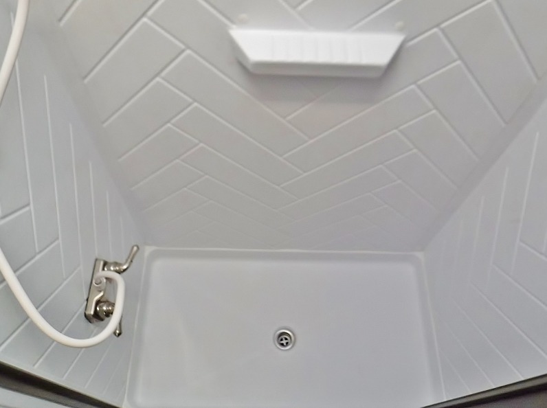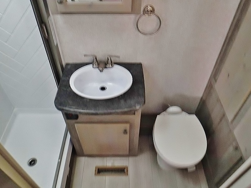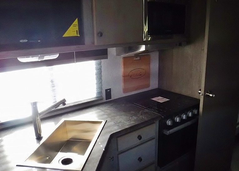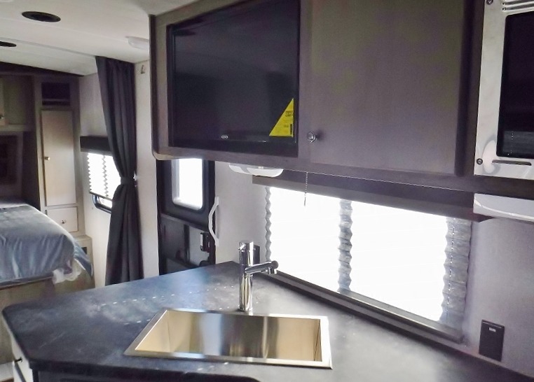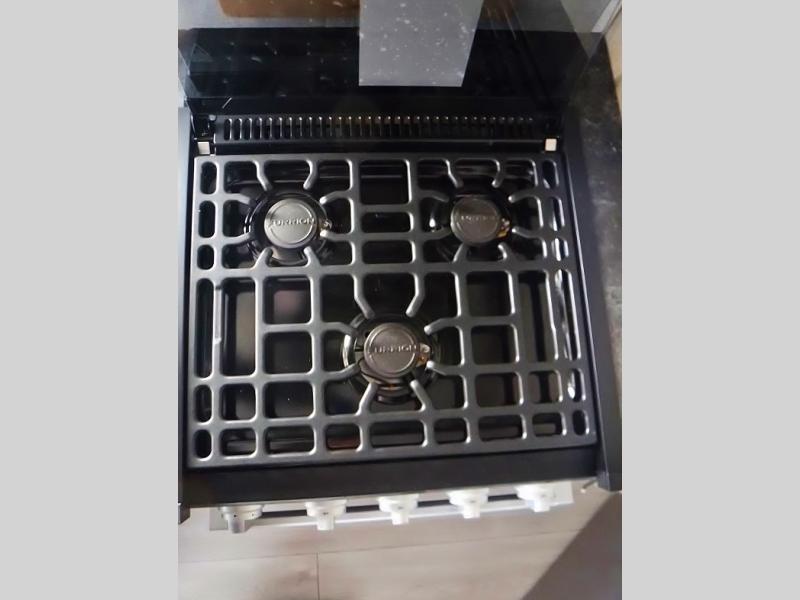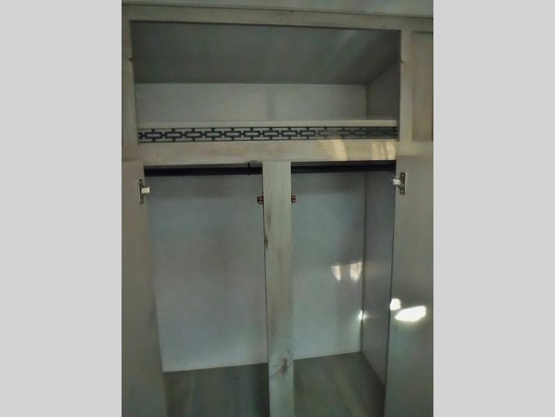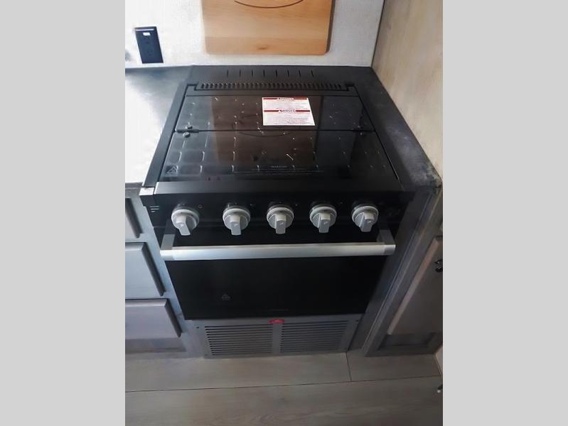 This is the perfect couple's trailer with space for an overnight guest or two on the U-shaped dinette slide. The kitchen also offers two pantries for dry goods and overhead storage for dishes and such as well as a 10 cu. ft. 12V refrigerator to store your cold items. Outside you will enjoy features like the 12V LED awning to protect you from the sun while you watch the kids play and the outdoor shower for them to rinse off before going inside.