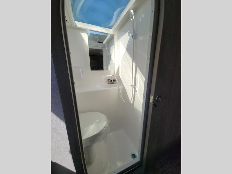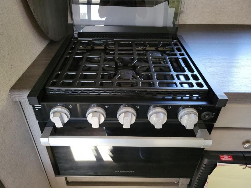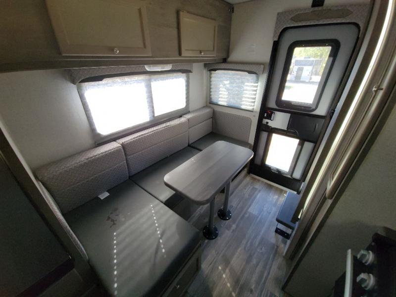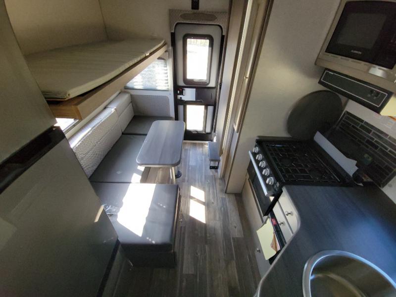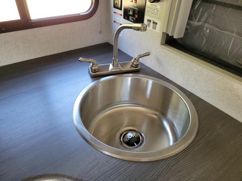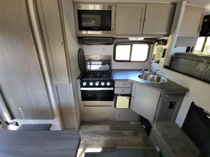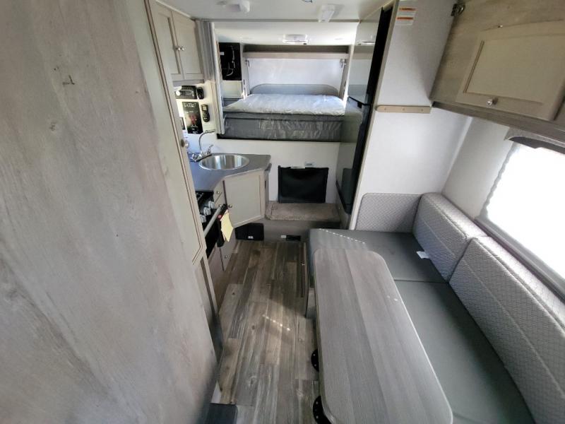 Head across the states in this comfortable truck camper for four. Once you find a campground to park for the night, start lunch on the three burner cooktop, or use the residential microwave with an air fryer for a quick meal. The U-shaped dinette will be the perfect place to dine at, or you can choose the optional roll-over sofa here. The dinette converts to a 38" x 77" sleeping area, plus there is an overhead bunk. You will enjoy the front 58" x 80" queen bed that includes three wardrobes and a nightstand for your things, and don't forget to add the optional 24" 12V LED TV for movies in bed.