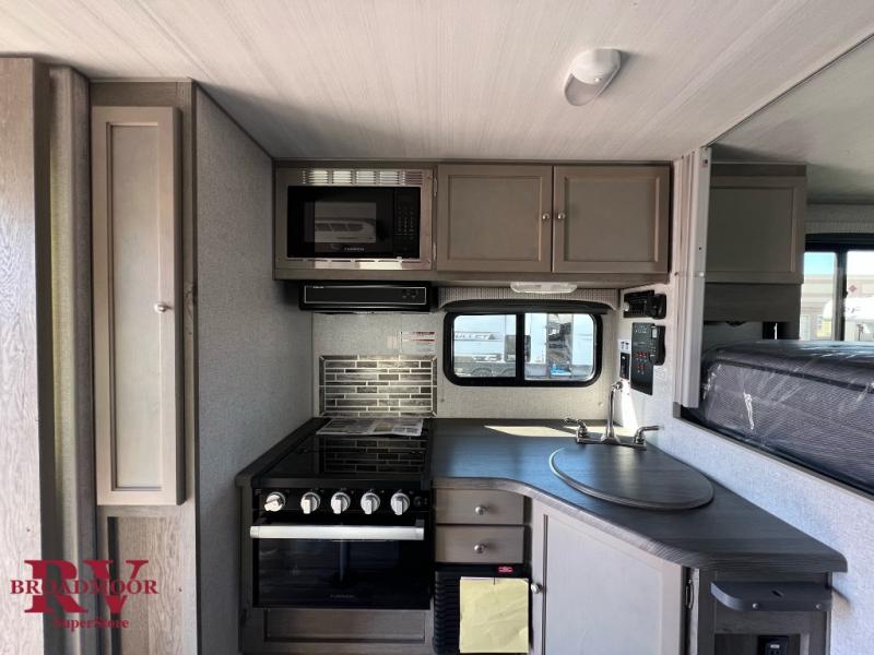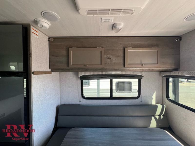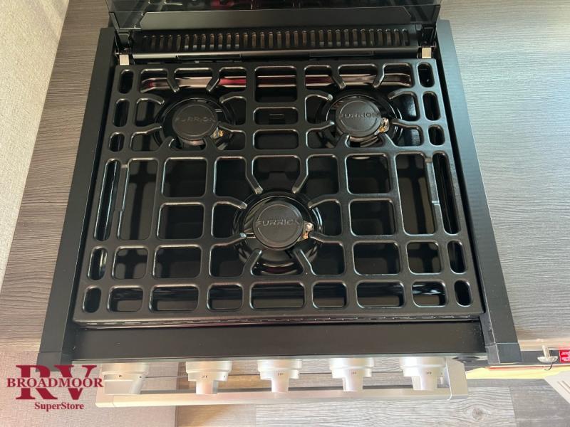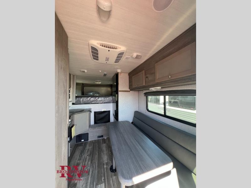 Head across the states in this comfortable truck camper for four. Once you find a campground to park for the night, start lunch on the three burner cooktop, or use the residential microwave with an air fryer for a quick meal. The U-shaped dinette will be the perfect place to dine at, or you can choose the optional roll-over sofa here. The dinette converts to a 38" x 77" sleeping area, plus there is an overhead bunk. You will enjoy the front 58" x 80" queen bed that includes three wardrobes and a nightstand for your things, and don't forget to add the optional 24" 12V LED TV for movies in bed.